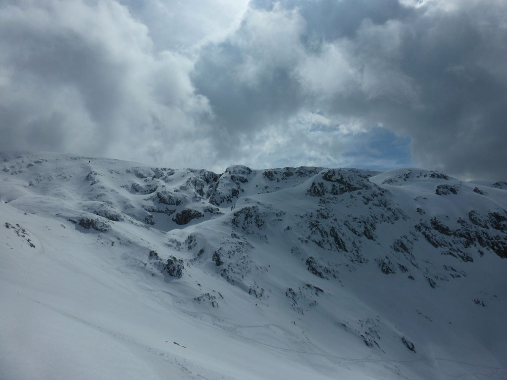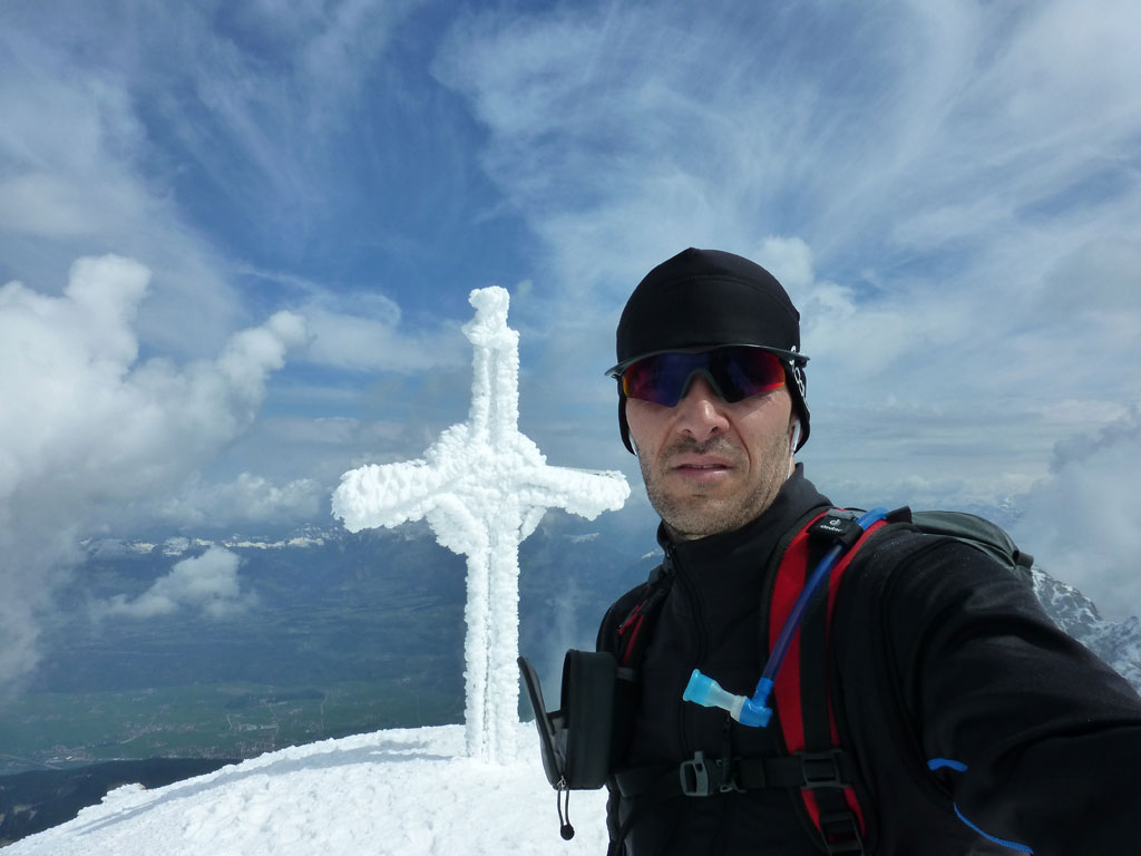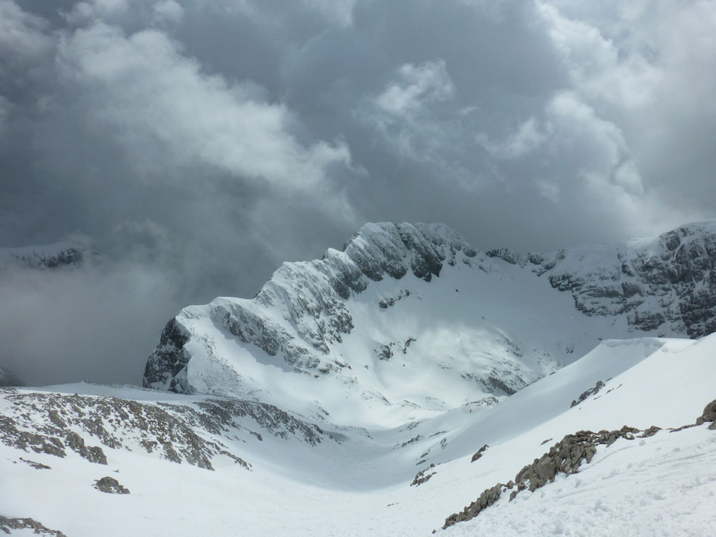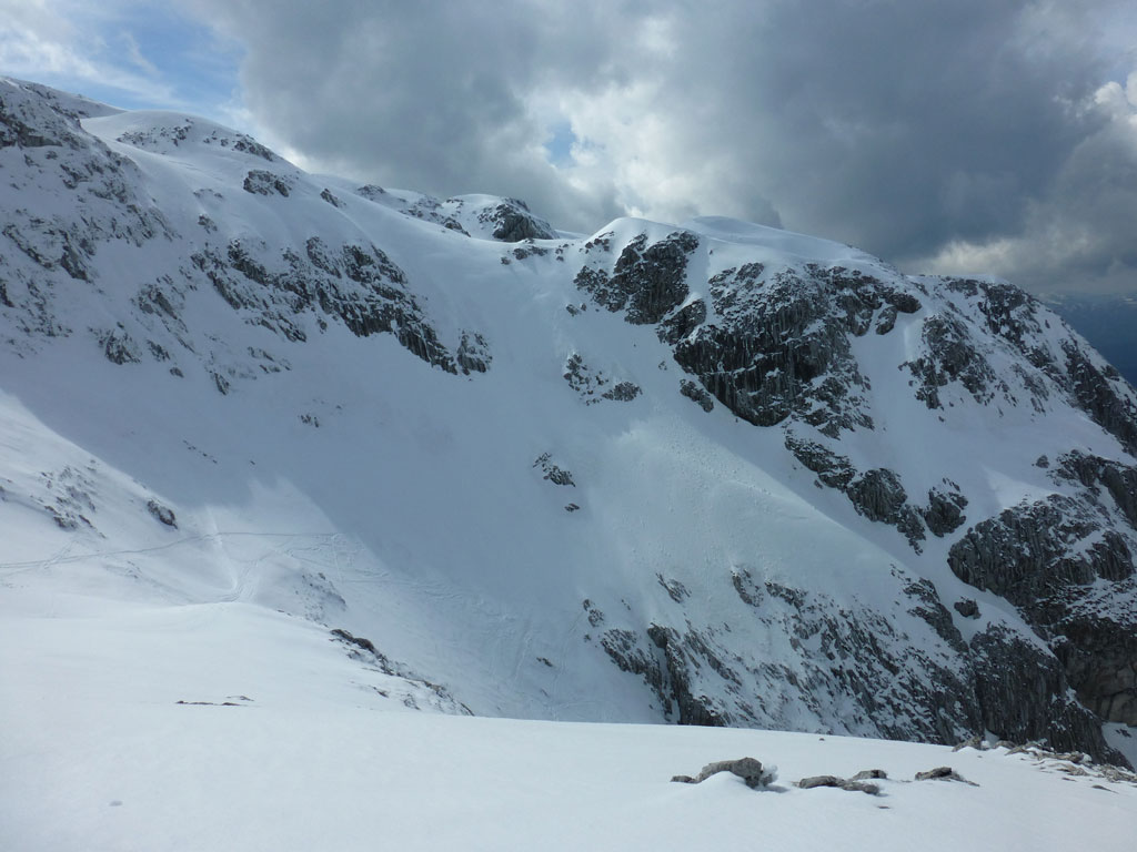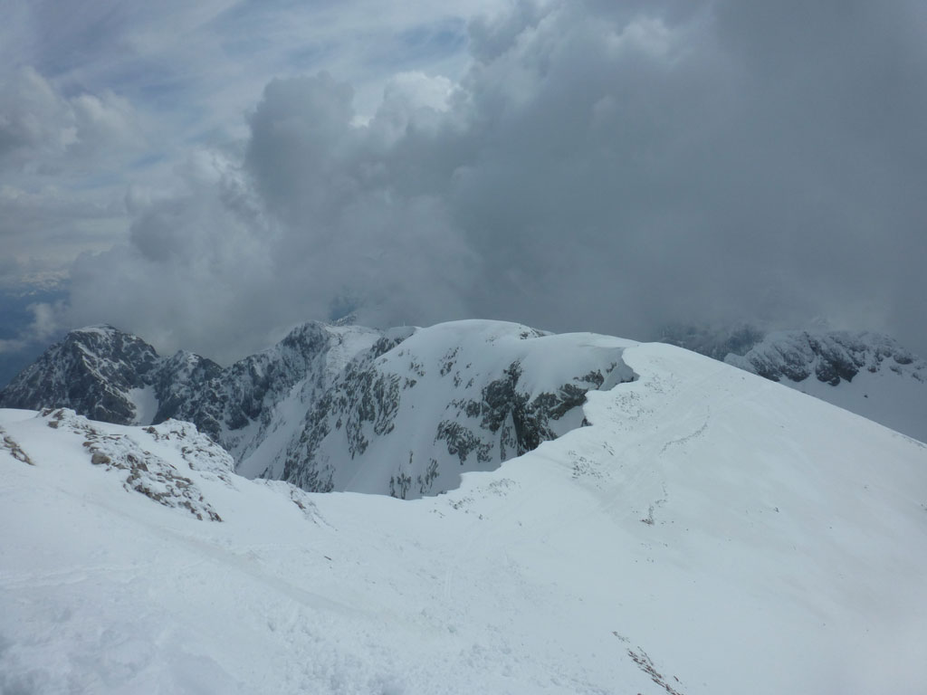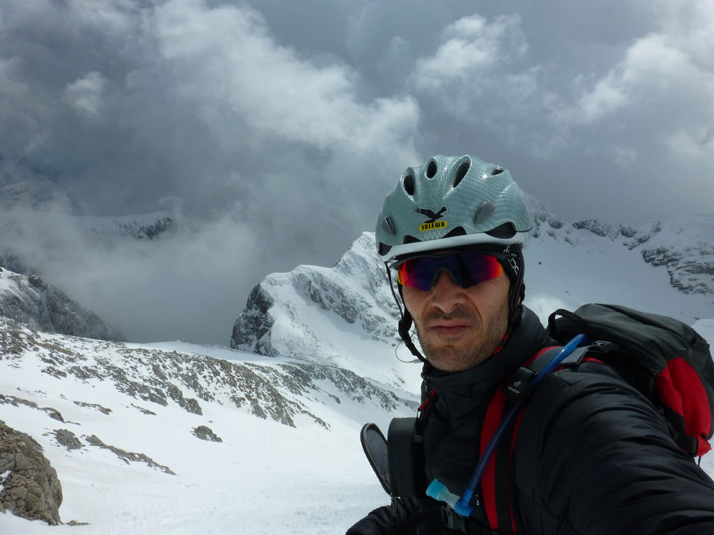 Als ich bei der Abfahrt durch die Umgäng unterhalb der breiten Rinne in Richtung Hohes Brett ankam, entschied ich mich kurzerhand für den erneuten Aufstieg. Die Bedingungen waren noch immer tadellos, und nach einer knappen Stunde schweißtreibendem Spuren stand ich vor dem Gipfelkreuz des Hohen Bretts mit Blick auf die Göll-Westwand. Abermals nach einer kleinen Pause trat ich zufrieden mit diesem gelungenen Tourentag die äußerst genussvolle Abfahrt bis zum letzten Fleckchen Schnee an.