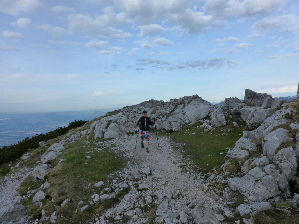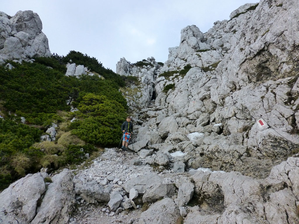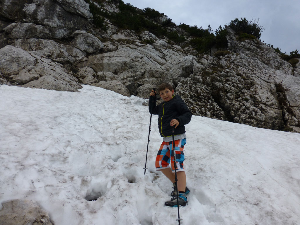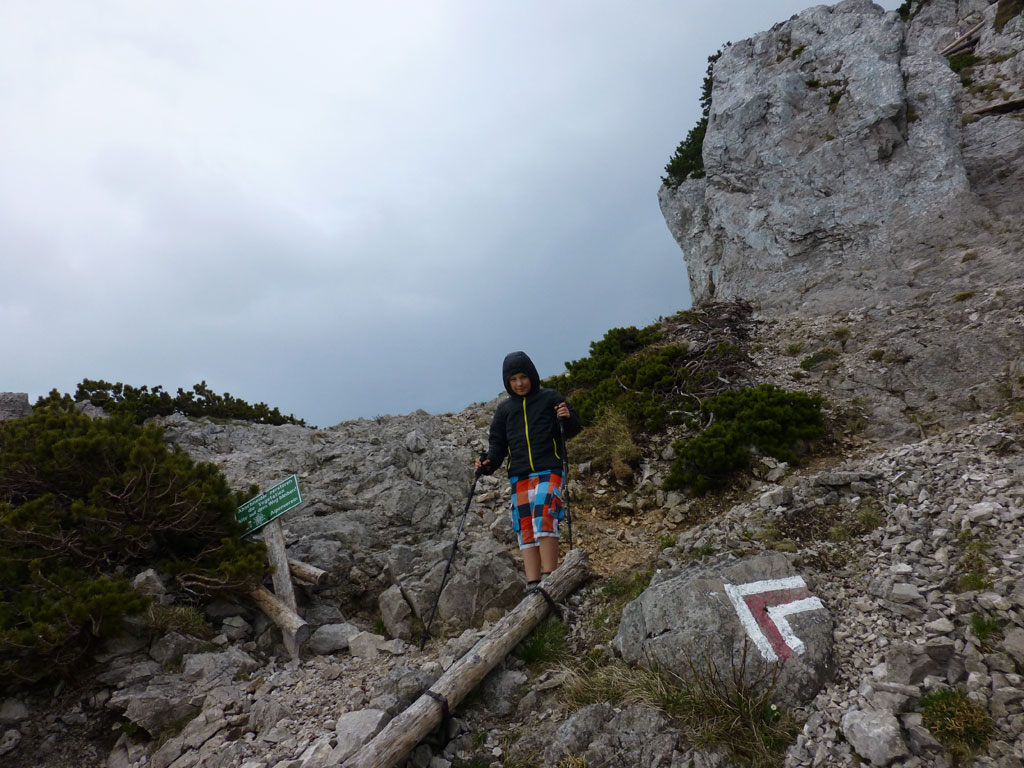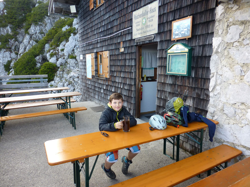 An diesem Samstagnachmittag war das Wetter tendenziell unbeständig, sodass David und ich lange überlegten, ob wir überhaupt irgendetwas unternehmen sollen. Doch nach längerem Für und Wieder packten wir schnell den Rucksack, ’sattelten‘ unsere Bikes und radelten gemütlich nach Urwies bei Piding. Unser erklärtes Ziel war für heute der Hochstaufen, sofern uns nicht das Wetter einen Strich durch die Rechnung macht. Auf der Forststrasse Richtung Steineralm begann es dann auch leicht zu regnen, aber auf Höhe Moar-Alm lichteten sich die Wolken wieder, und wir marschierten weiter brav bis zur Abzweigung Steinerne Jäger. Dort deponierten wir dann auch die Bikes und stiegen anfänglich im Wald, später auf einem schönen, felsigen Steig bis zum Reichenhaller Haus auf. David war dabei ein erstklassiger Bergführer und ich war erstaunt, wie problemlos und elegant er diesen immerhin nicht ganz simplen Zustieg meisterte. Bei der Hütte gab’s dafür auch ein Belohnung in Form eines großen Colas, bevor wir die letzten Meter zum Gipfel hinaufwanderten. Aus Südwesten näherte sich schon die nächste Regenfront, weshalb wir schleunigst den Rückweg zur Steineralm antraten. Dabei musste auch das eine oder andere Restschneefeld bewälttigt werden, als uns erneut ein kurzer aber intensiver Regenschauer ereilte. Bei der Steineralm war’s mit Regen glücklicherweise aber schon wieder vorbei, und wir erreichten vorerst halbwegs trocken unsere Bikes. Nun war eine fetzige Abfahrt, später einer feucht-fröhliche Rückfahrt angesagt. Kebab und Cola waren selbstverständlich obligat! Unser Kebabmann meinte nur es schneit, als er uns sah… 😀