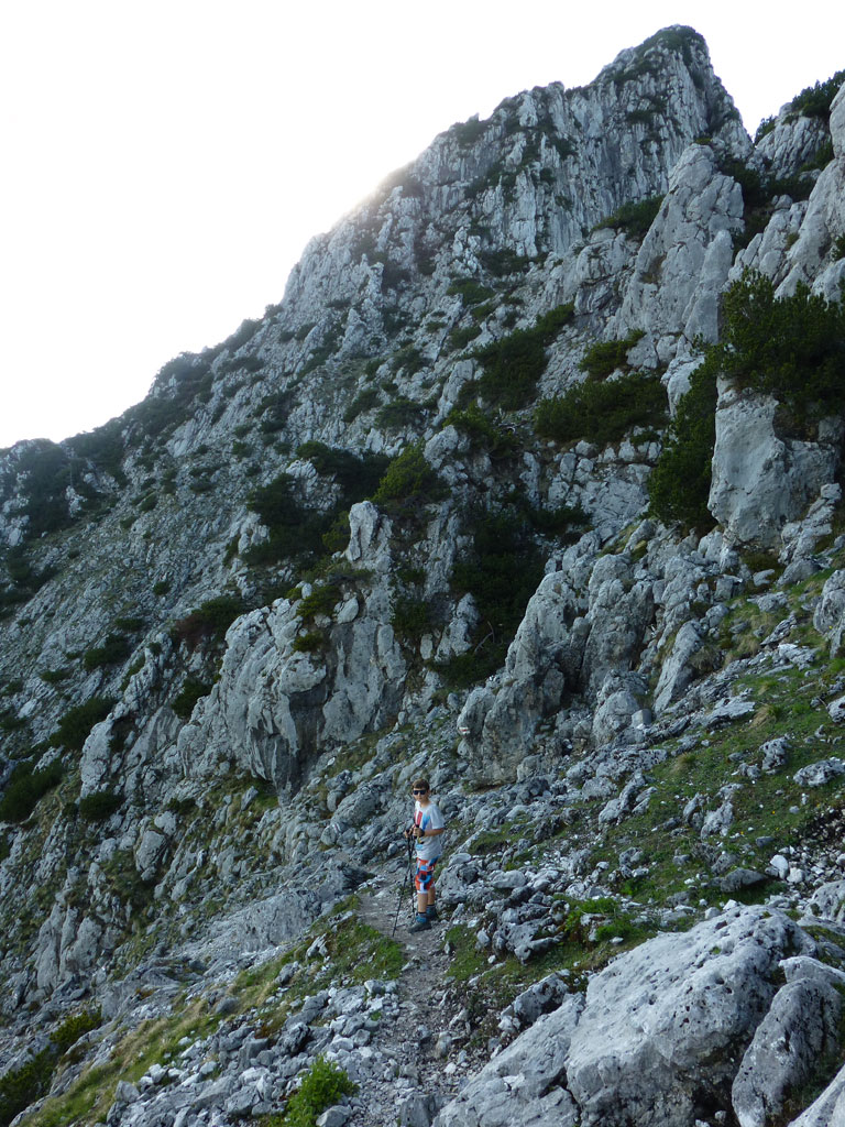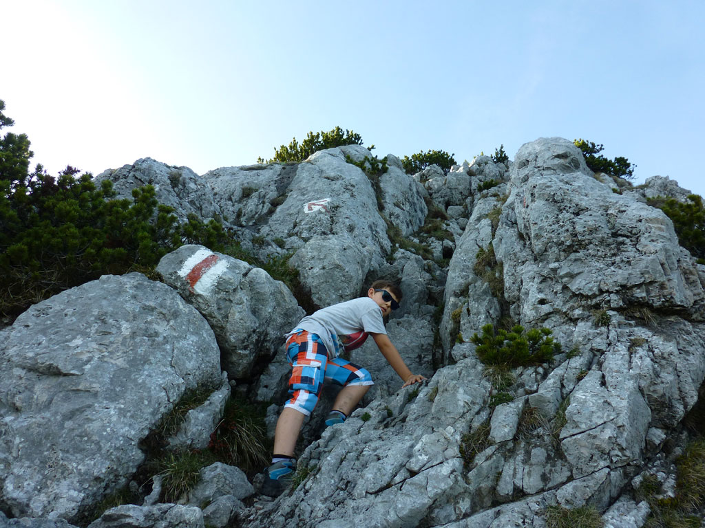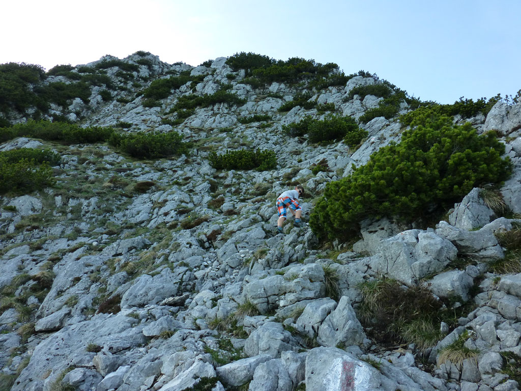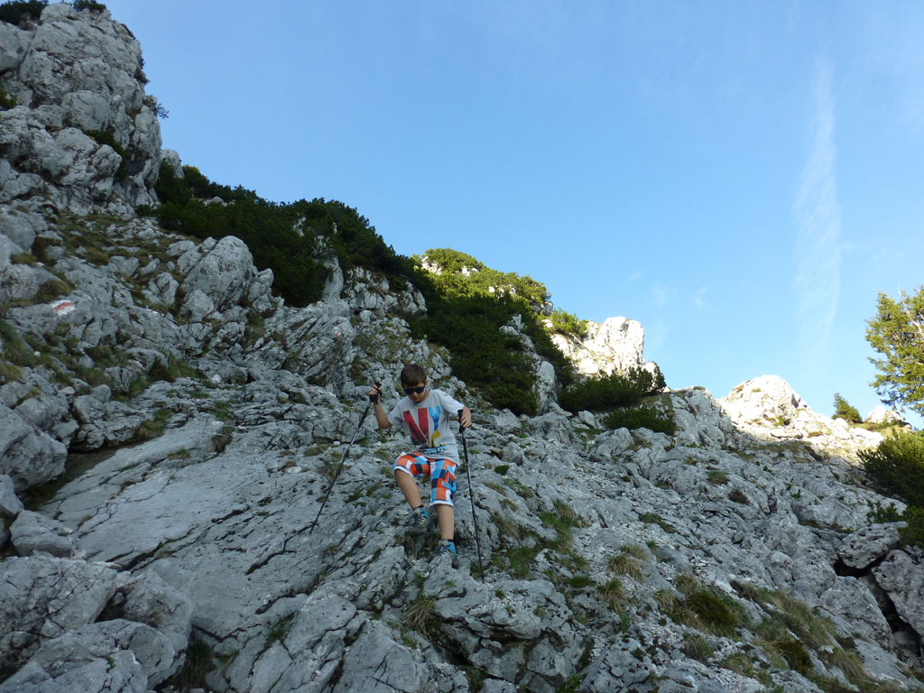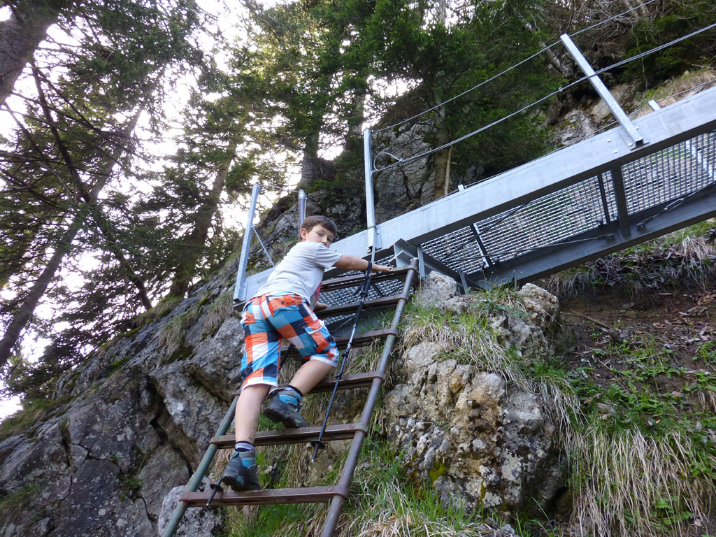 An diesem Samstagnachmittag war das Wetter tendenziell unbeständig, sodass David und ich lange überlegten, ob wir überhaupt irgendetwas unternehmen sollen. Doch nach längerem Für und Wieder packten wir schnell den Rucksack, ’sattelten‘ unsere Bikes und radelten gemütlich nach Urwies bei Piding. Unser erklärtes Ziel war für heute der Hochstaufen, sofern uns nicht das Wetter einen Strich durch die Rechnung macht. Auf der Forststrasse Richtung Steineralm begann es dann auch leicht zu regnen, aber auf Höhe Moar-Alm lichteten sich die Wolken wieder, und wir marschierten weiter brav bis zur Abzweigung Steinerne Jäger. Dort deponierten wir dann auch die Bikes und stiegen anfänglich im Wald, später auf einem schönen, felsigen Steig bis zum Reichenhaller Haus auf. David war dabei ein erstklassiger Bergführer und ich war erstaunt, wie problemlos und elegant er diesen immerhin nicht ganz simplen Zustieg meisterte. Bei der Hütte gab’s dafür auch ein Belohnung in Form eines großen Colas, bevor wir die letzten Meter zum Gipfel hinaufwanderten. Aus Südwesten näherte sich schon die nächste Regenfront, weshalb wir schleunigst den Rückweg zur Steineralm antraten. Dabei musste auch das eine oder andere Restschneefeld bewälttigt werden, als uns erneut ein kurzer aber intensiver Regenschauer ereilte. Bei der Steineralm war’s mit Regen glücklicherweise aber schon wieder vorbei, und wir erreichten vorerst halbwegs trocken unsere Bikes. Nun war eine fetzige Abfahrt, später einer feucht-fröhliche Rückfahrt angesagt. Kebab und Cola waren selbstverständlich obligat! Unser Kebabmann meinte nur es schneit, als er uns sah… 😀