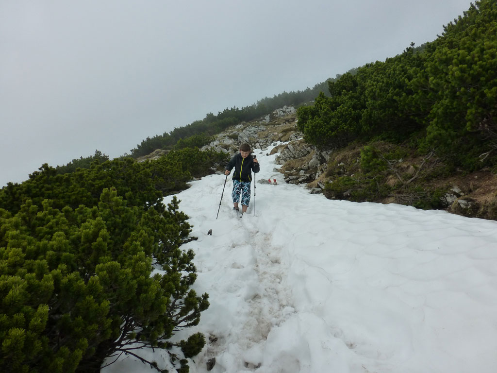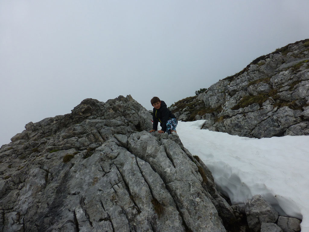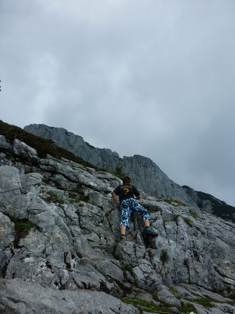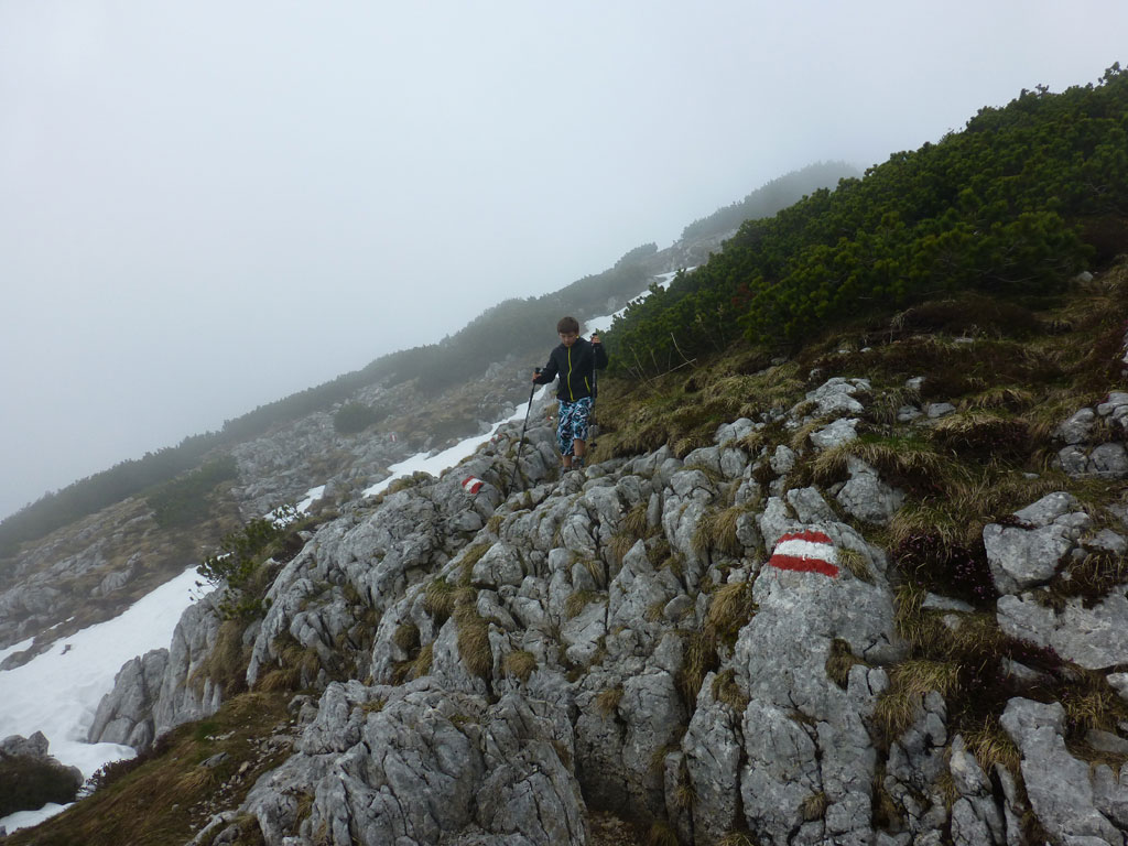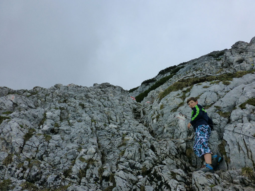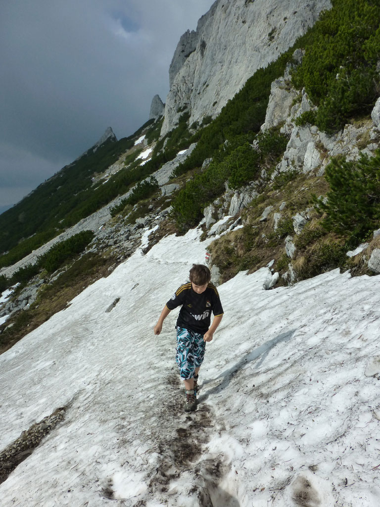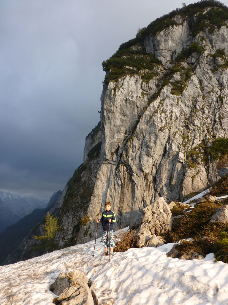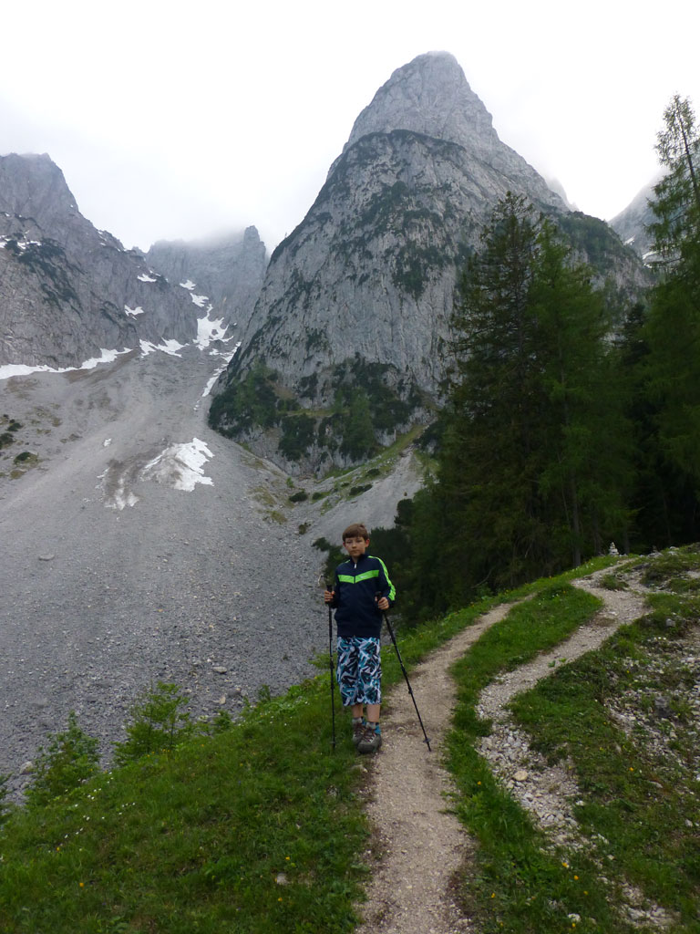 Das Wetter an diesem Tag gestaltete sich vorerst eher wechselhaft bevor ab Mittag dann doch immer mehr die Sonne zum Vorschein kam. David und ich berieten ob wir noch eine Bergtour angehen sollten, und vor allem wo. Wir schmöckerten also in meinen Wanderkarten der hiesigen Gebirgszüge und stießen auf den Gosaukamm mit seinen vielen Haupt- und Nebengipfeln. Wir entschieden uns für den Großen Donnerkogel mit Ausgangspunkt Gosausee. Dort starteten wir dann gegen 15:00 Uhr in Richtung Gablonzer Hütte, wanderten weiter über den Törlecksattel vorbei am Kleinen Donnerkogel und entlang der Westflanke zum Ziel unserer Bergtour. Stellenweise mussten wir noch kleinere Schneefelder queren bis wir gegen 18:00 Uhr den wolkenverhangenen Gipfel erreichten, und uns die mitgebrachten Brote einverleibten. Nach einer kurzen Rast traten wir zufrieden aber etwas abgekühlt den Rückweg zum See an. David war wieder einmal ein super Bergsteiger und ich bin mehr als stolz auf meinen großen Jungen!