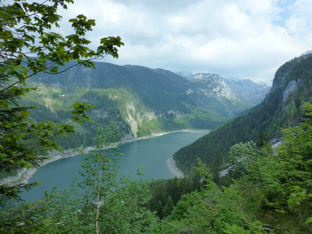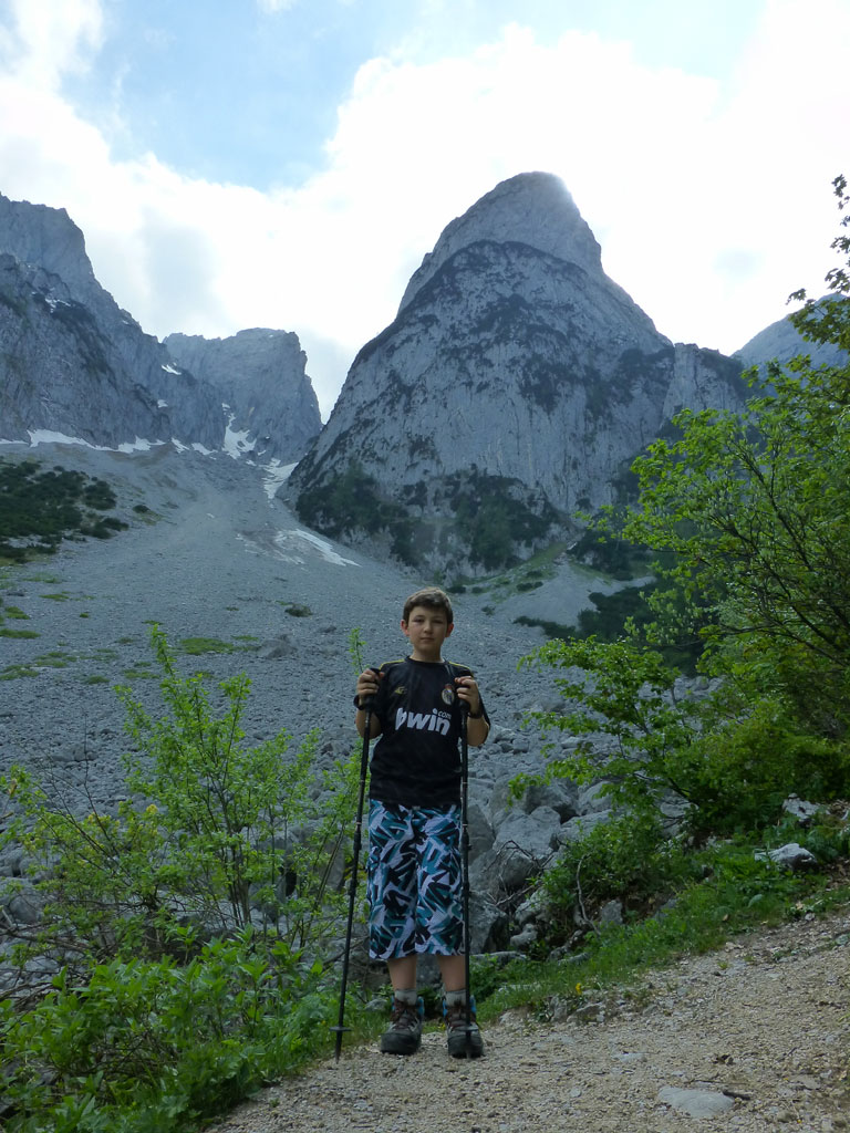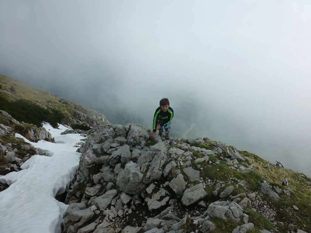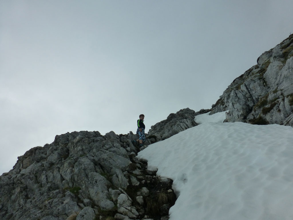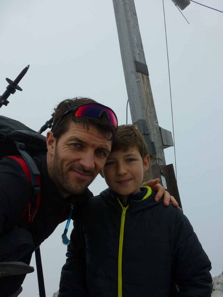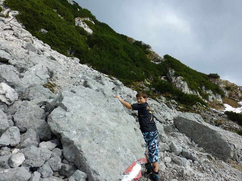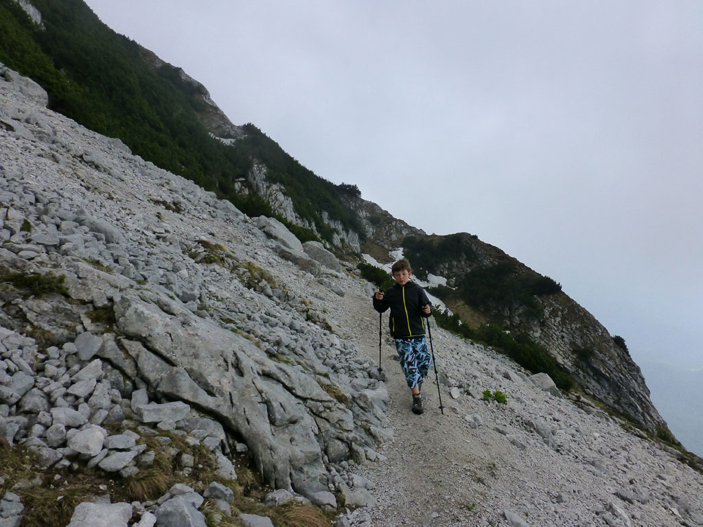 Das Wetter an diesem Tag gestaltete sich vorerst eher wechselhaft bevor ab Mittag dann doch immer mehr die Sonne zum Vorschein kam. David und ich berieten ob wir noch eine Bergtour angehen sollten, und vor allem wo. Wir schmöckerten also in meinen Wanderkarten der hiesigen Gebirgszüge und stießen auf den Gosaukamm mit seinen vielen Haupt- und Nebengipfeln. Wir entschieden uns für den Großen Donnerkogel mit Ausgangspunkt Gosausee. Dort starteten wir dann gegen 15:00 Uhr in Richtung Gablonzer Hütte, wanderten weiter über den Törlecksattel vorbei am Kleinen Donnerkogel und entlang der Westflanke zum Ziel unserer Bergtour. Stellenweise mussten wir noch kleinere Schneefelder queren bis wir gegen 18:00 Uhr den wolkenverhangenen Gipfel erreichten, und uns die mitgebrachten Brote einverleibten. Nach einer kurzen Rast traten wir zufrieden aber etwas abgekühlt den Rückweg zum See an. David war wieder einmal ein super Bergsteiger und ich bin mehr als stolz auf meinen großen Jungen!