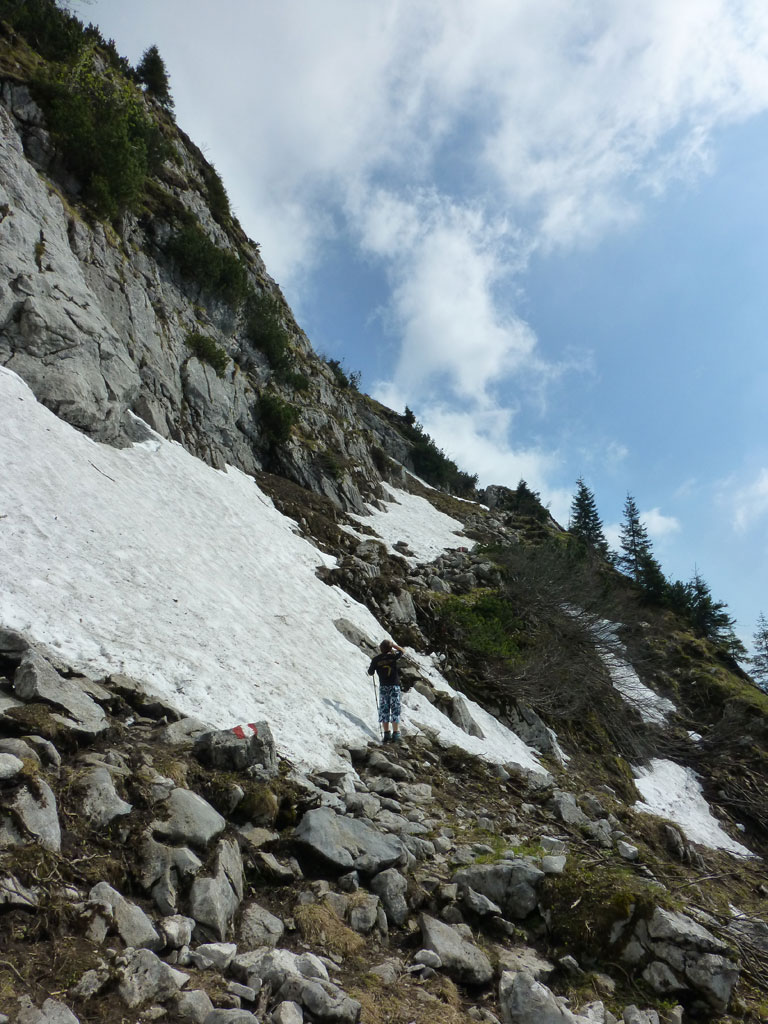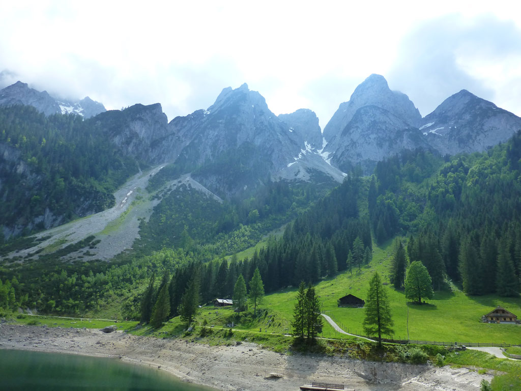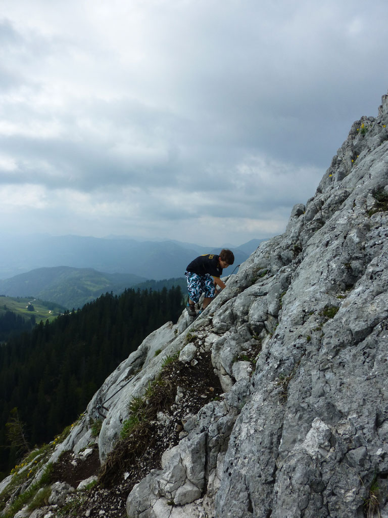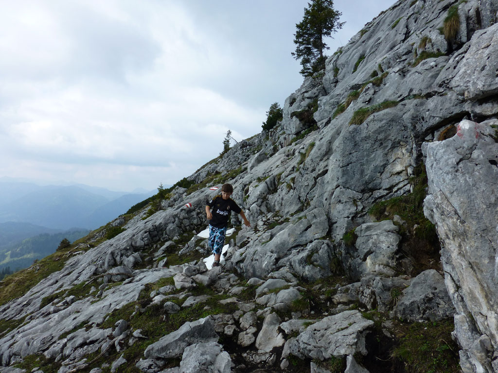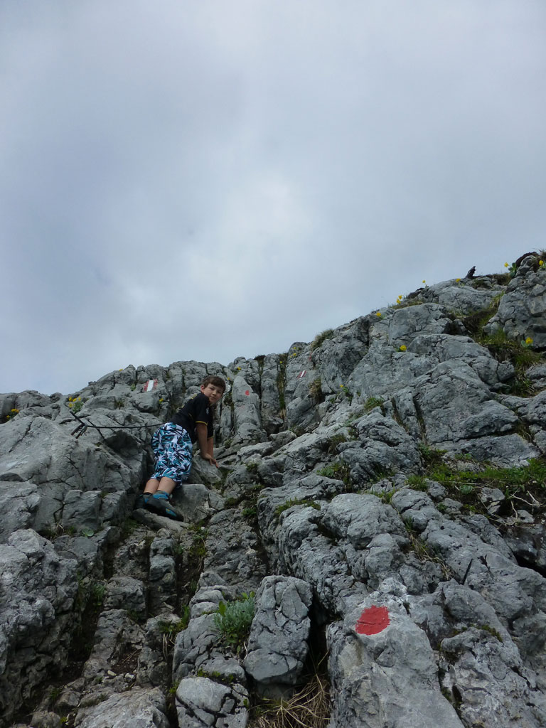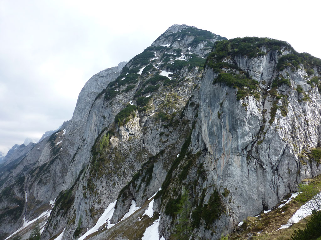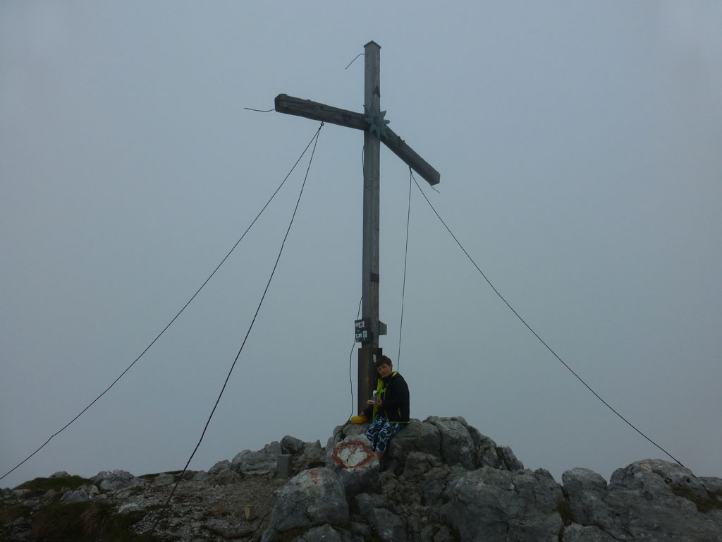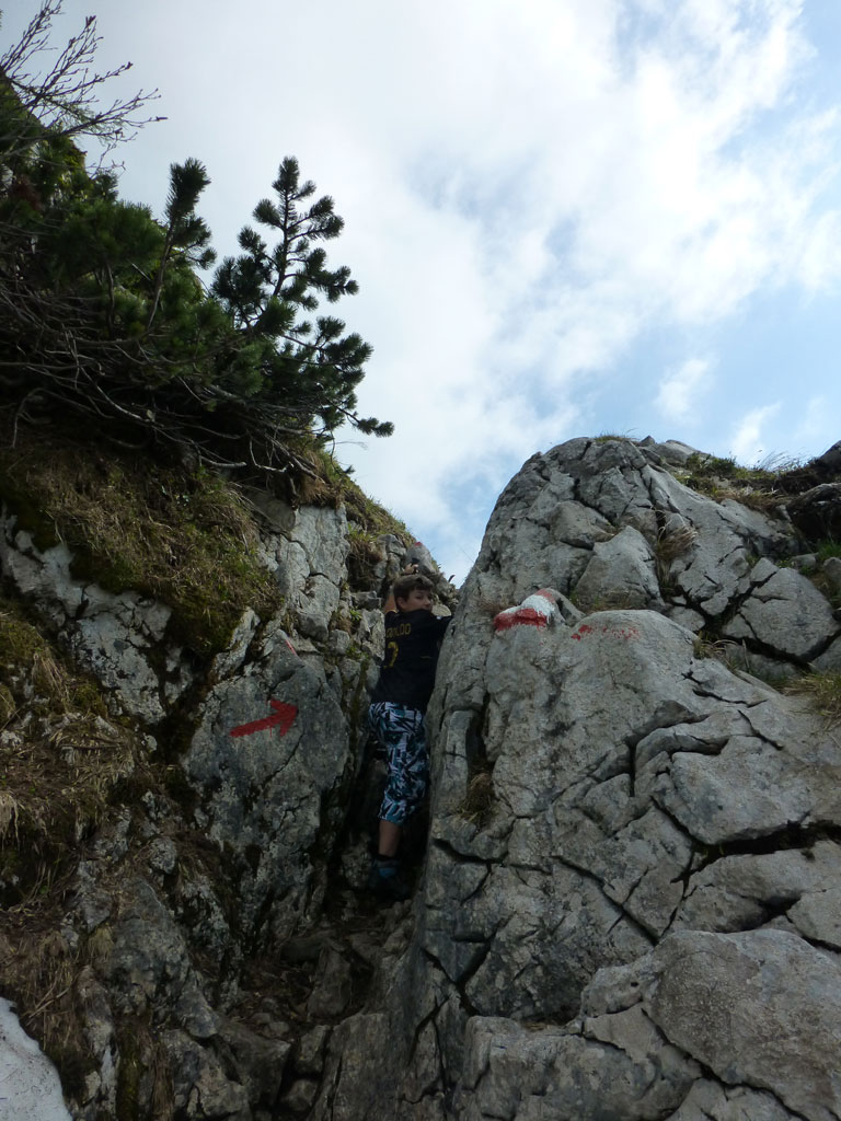 Das Wetter an diesem Tag gestaltete sich vorerst eher wechselhaft bevor ab Mittag dann doch immer mehr die Sonne zum Vorschein kam. David und ich berieten ob wir noch eine Bergtour angehen sollten, und vor allem wo. Wir schmöckerten also in meinen Wanderkarten der hiesigen Gebirgszüge und stießen auf den Gosaukamm mit seinen vielen Haupt- und Nebengipfeln. Wir entschieden uns für den Großen Donnerkogel mit Ausgangspunkt Gosausee. Dort starteten wir dann gegen 15:00 Uhr in Richtung Gablonzer Hütte, wanderten weiter über den Törlecksattel vorbei am Kleinen Donnerkogel und entlang der Westflanke zum Ziel unserer Bergtour. Stellenweise mussten wir noch kleinere Schneefelder queren bis wir gegen 18:00 Uhr den wolkenverhangenen Gipfel erreichten, und uns die mitgebrachten Brote einverleibten. Nach einer kurzen Rast traten wir zufrieden aber etwas abgekühlt den Rückweg zum See an. David war wieder einmal ein super Bergsteiger und ich bin mehr als stolz auf meinen großen Jungen!