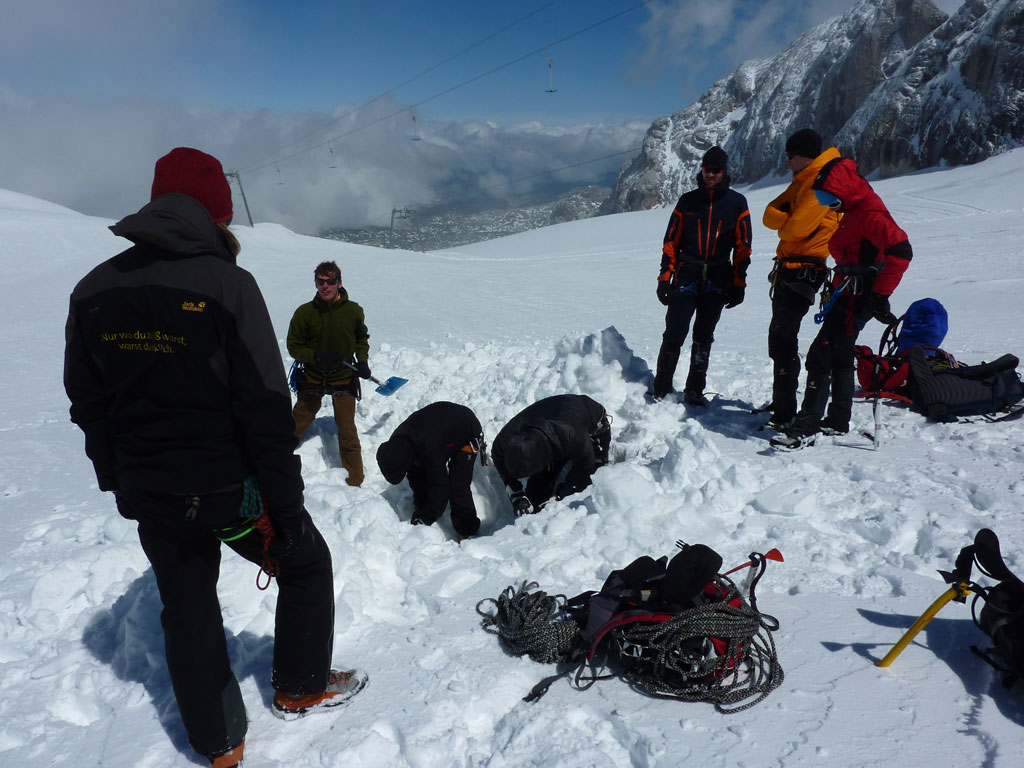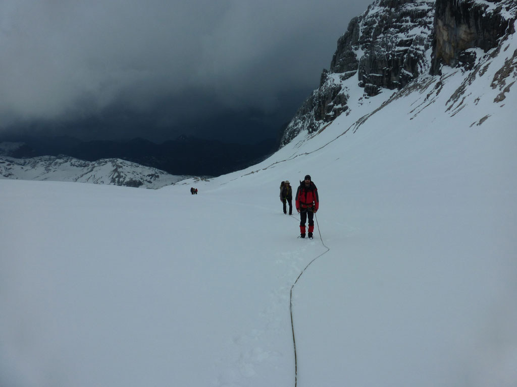 Um unsere bescheidenen Kenntnisse für Gletscher- und Hochtouren aufzufrischen, bzw. in erster Linie zu erweitern nahmen Andi und ich am diesjährigen Gletscherkurs des Salzburger AV vom 29. Mai bis zum 1. Juni am Dachstein teil. Zweifellos haben wir in den paar Tagen so einiges gelernt, was unter anderem an unserem überaus kompetenten und gemütlichen Bergführer Erich lag, aber auch durch unsere echt freundliche, motivierte und junge Truppe bedingt war. So macht Ausbildung Spass!