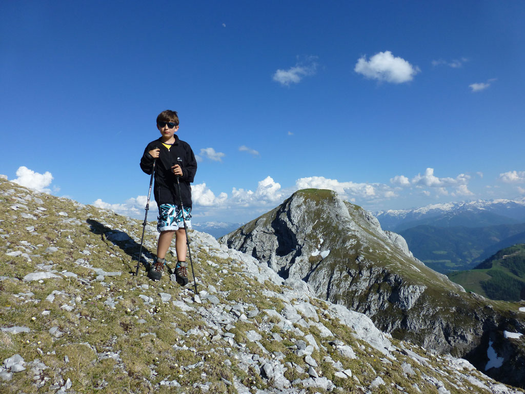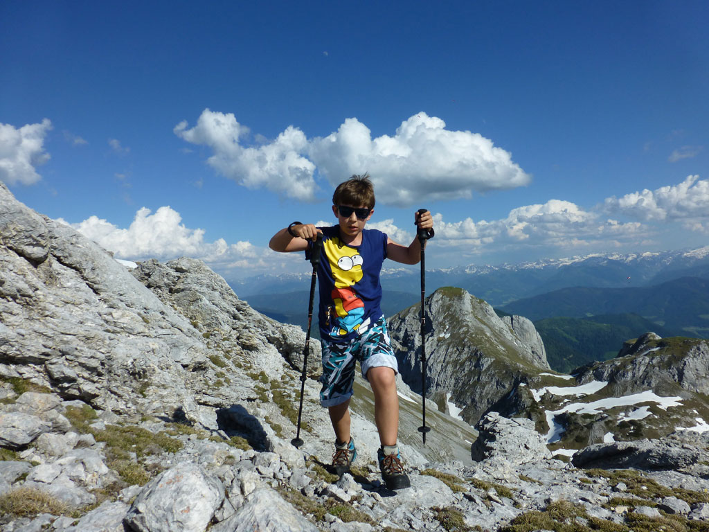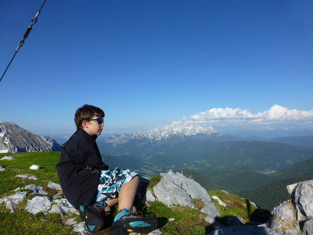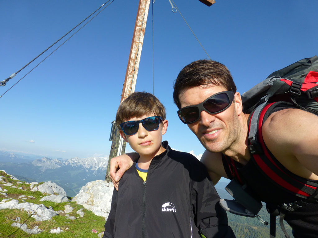 Der Abstieg vom Brietkogel zur Tauernscharte war wider Erwarten anspruchsvoller als gedacht, aber stellte uns vor keine nenenswerte Probleme. Auf der letzten Erhebung des Tages, dem Tauernkogel angekommen, machten wir abermals eine kleine Pause und schweiften mit den Blicken zum nahe gelegenen Dachsteingebirge. Aber noch viel wichtiger, wir beschlossen, dass wir uns heute zum Abendessen definitiv saftige Burger mit Pommes gönnen werden. Als kleine Auffrischung beim Abstieg zum Parkplatz tranken wir in der Hackel-Hütte noch ein Cola, bevor wir schließlich müde aber sehr zufrieden beim Auto ankamen. Wieder einmal konnten wir den Tag für eine spontane, sehr ausgiebige und erstklassige Bergtour nutzen, und David überraschte mich wie immer mit seinem mentalen Durchhaltevermögen und einer ausgezeichneten Kondition.