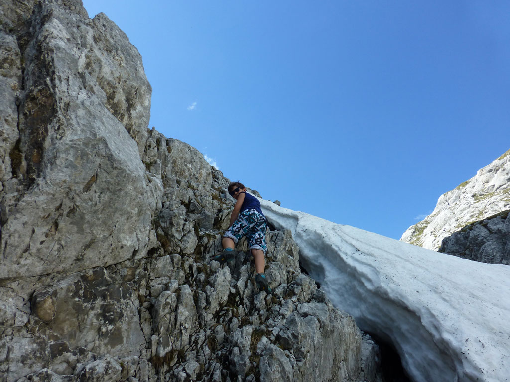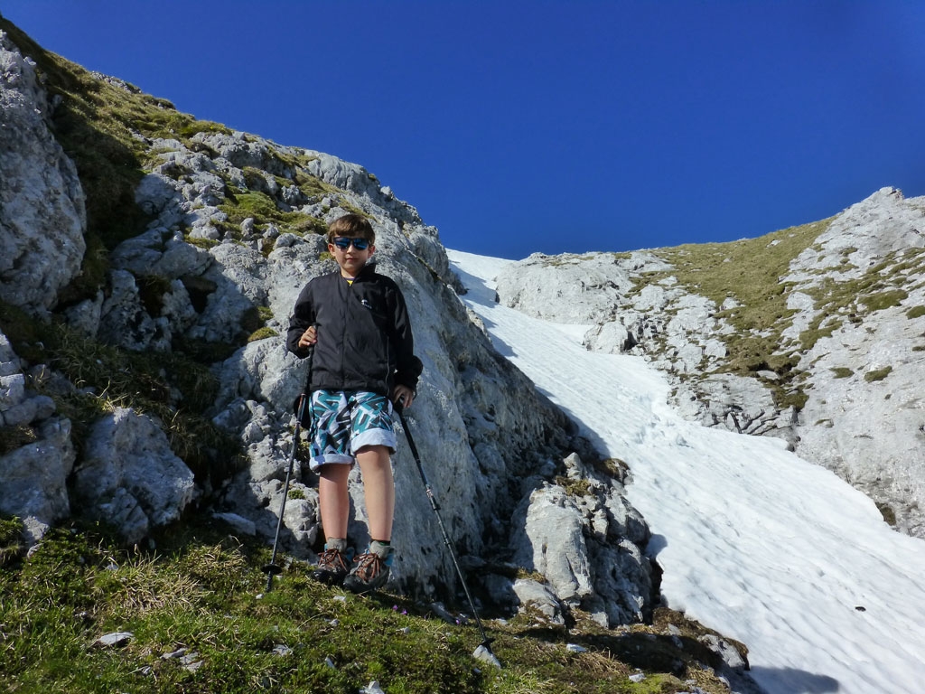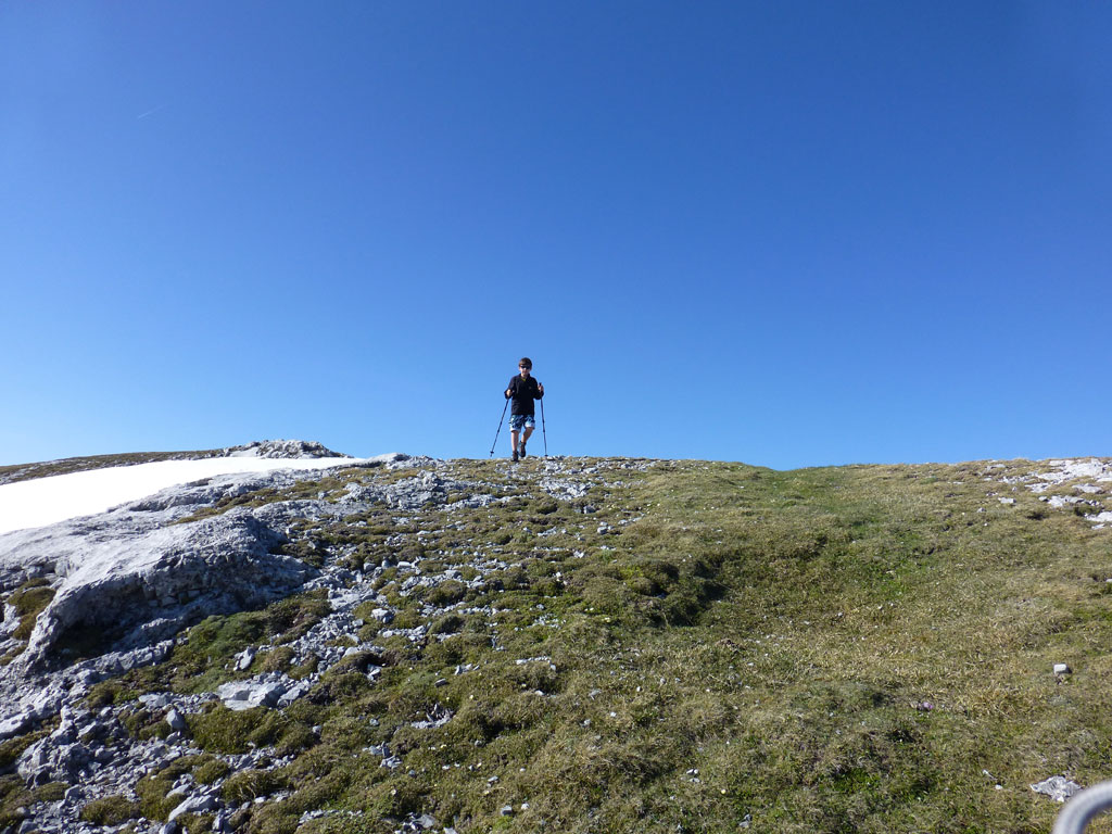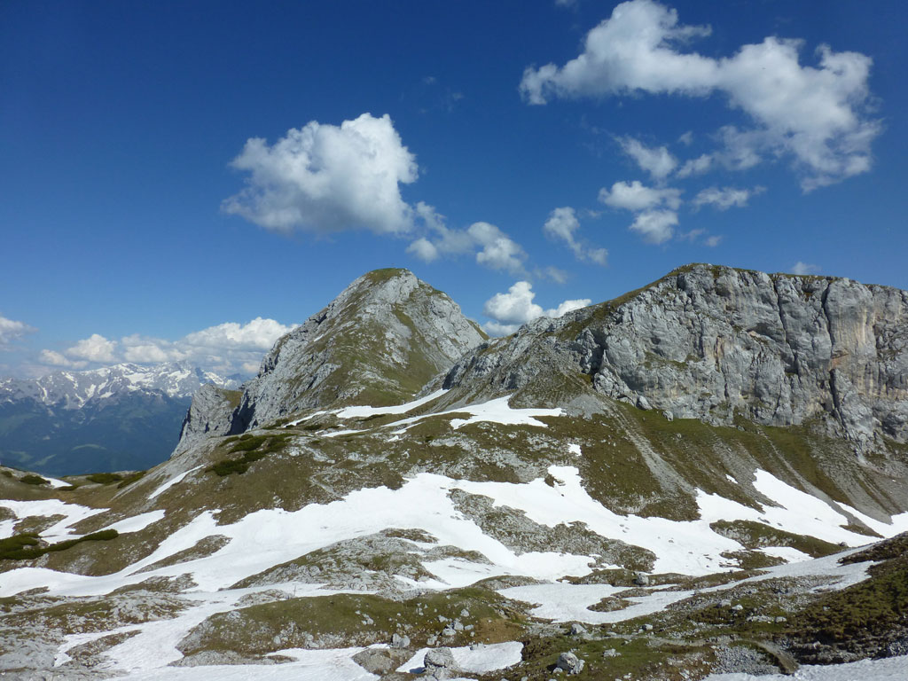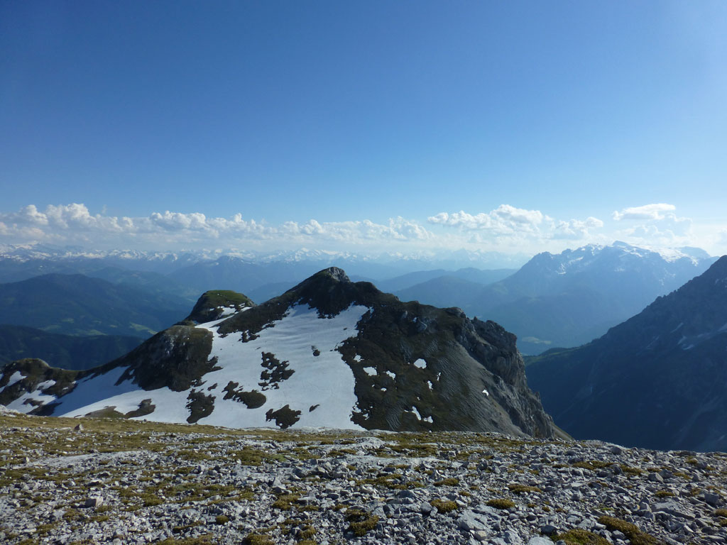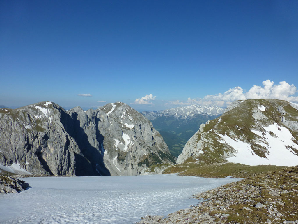 Zwei Wochen nach unserer letzten Tour auf den Großen Donnerkogel verschlug es David und mich an diesem überaus sonnigen und warmen Tag ins südliche Tennengebirge. Vom großen Parkplatz in der Wengerau brachen wir am frühen Nachmittag zur Dr.-Heinrich-Hackel-Hütte auf. Hinter der Hütte machten wir eine kurze Rast bevor wir den Aufstieg bis zur Tauernscharte in Angriff nahmen. Am Weg zur Scharte studierte ich eingängig die Südwand des Tauernkogel und vor allem den Routenverlauf der Tauerngold, die sich ganz oben auf meiner Liste lohnender Kletterziele befindet. Von der Tauernscharte aus eröffnete sich dann die herrlicher, teileweise noch mit viel Schnee bedeckte Berglandschaft des Tennengebirges. Frei nach dem Prinzip ‚Ronda Grande‘ bestiegen wir der Reihe nach den Eiskogel, die Schartwand, den Brietkogel und schließlich noch den Tauernkogel.