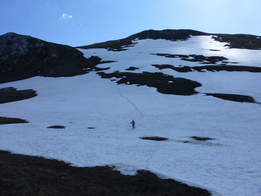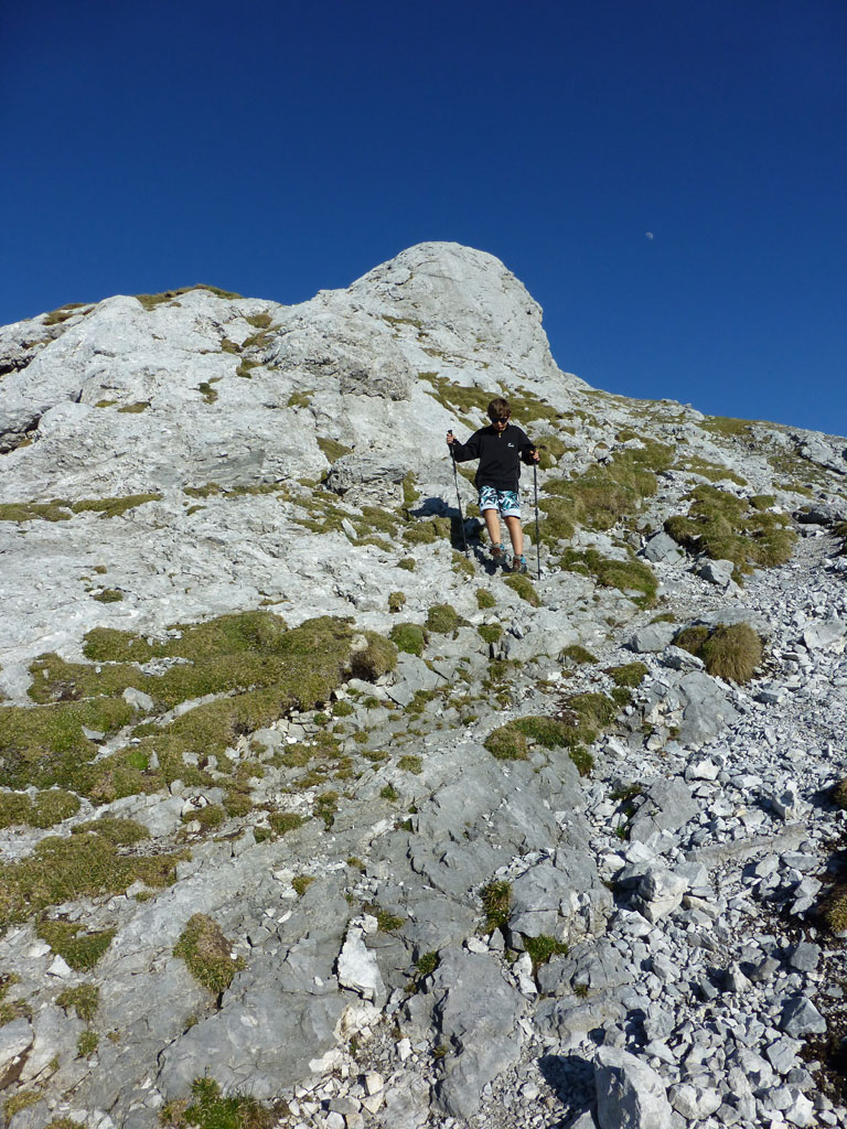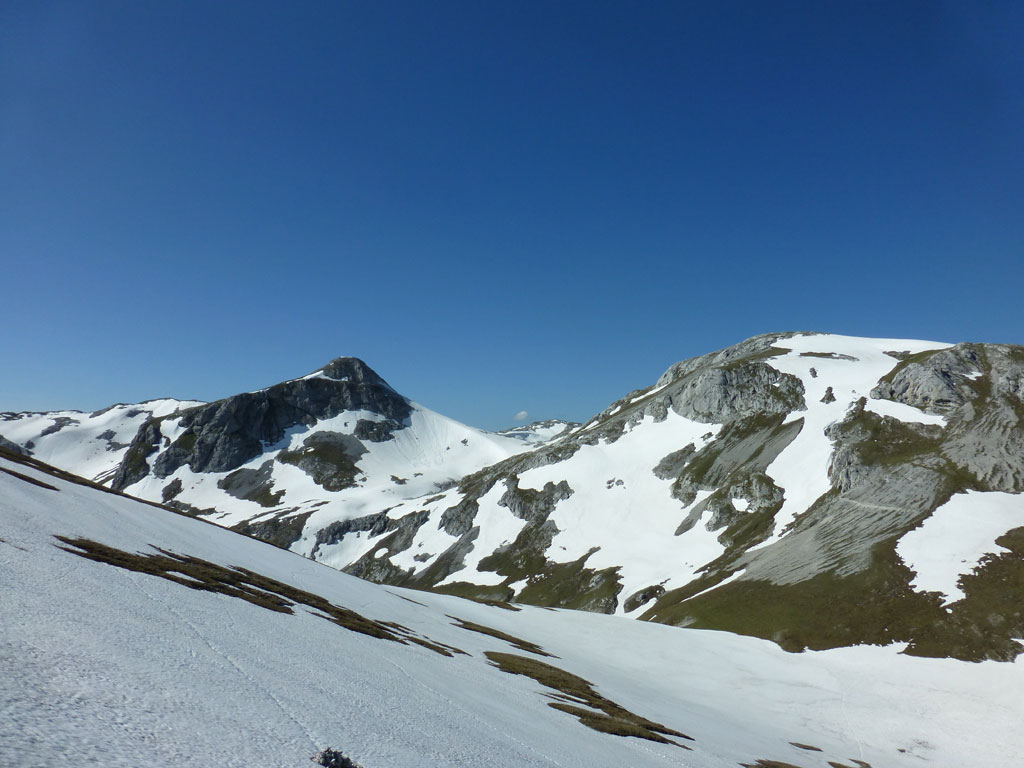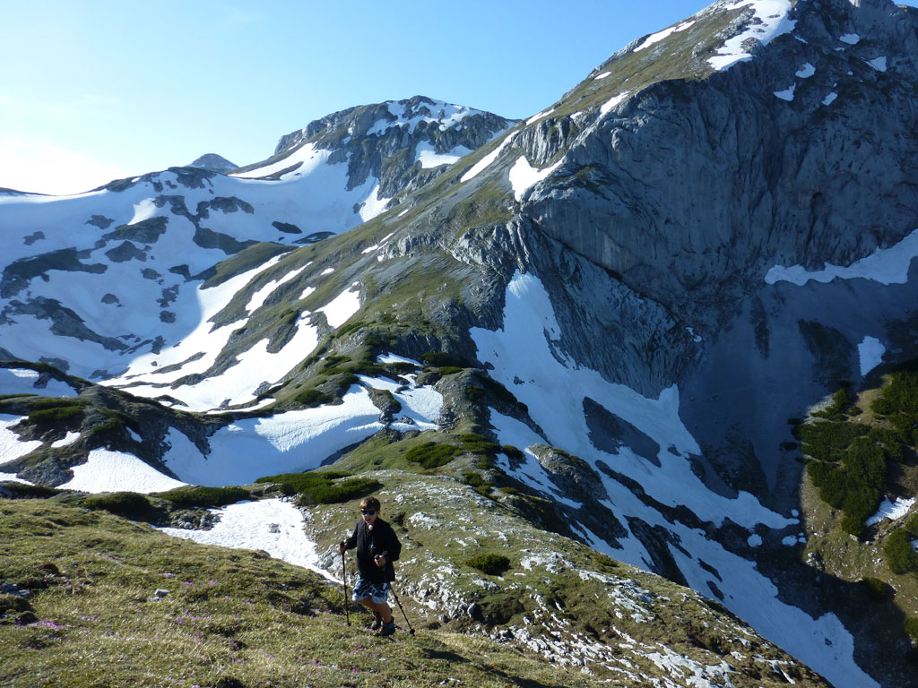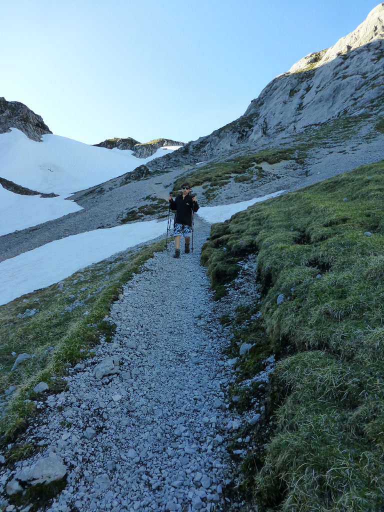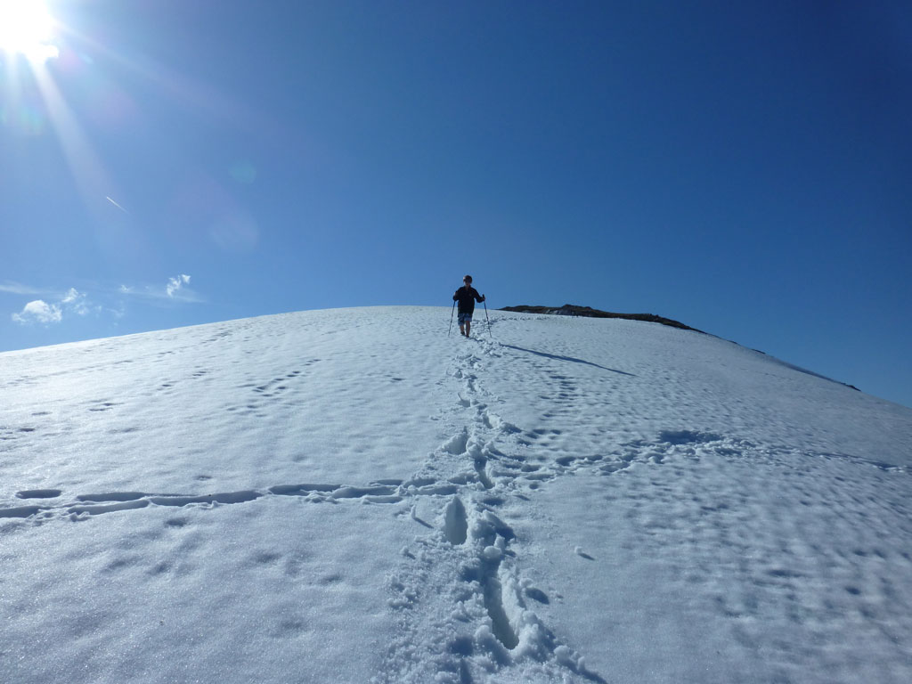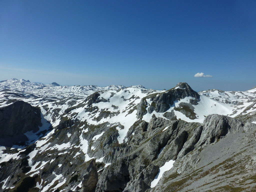 Zwei Wochen nach unserer letzten Tour auf den Großen Donnerkogel verschlug es David und mich an diesem überaus sonnigen und warmen Tag ins südliche Tennengebirge. Vom großen Parkplatz in der Wengerau brachen wir am frühen Nachmittag zur Dr.-Heinrich-Hackel-Hütte auf. Hinter der Hütte machten wir eine kurze Rast bevor wir den Aufstieg bis zur Tauernscharte in Angriff nahmen. Am Weg zur Scharte studierte ich eingängig die Südwand des Tauernkogel und vor allem den Routenverlauf der Tauerngold, die sich ganz oben auf meiner Liste lohnender Kletterziele befindet. Von der Tauernscharte aus eröffnete sich dann die herrlicher, teileweise noch mit viel Schnee bedeckte Berglandschaft des Tennengebirges. Frei nach dem Prinzip ‚Ronda Grande‘ bestiegen wir der Reihe nach den Eiskogel, die Schartwand, den Brietkogel und schließlich noch den Tauernkogel.