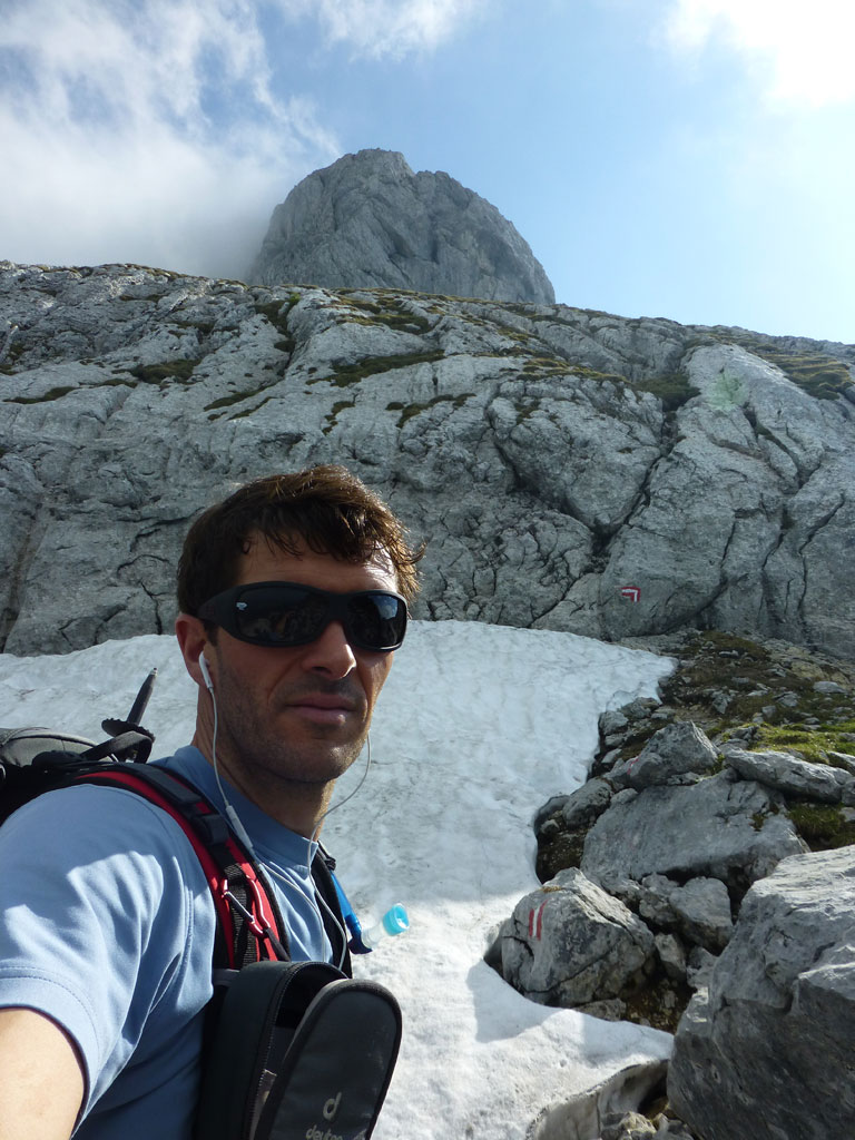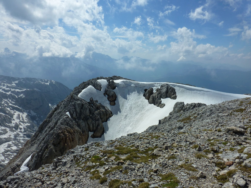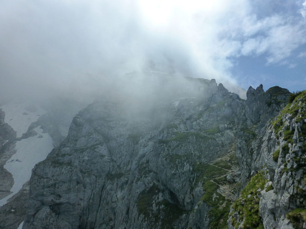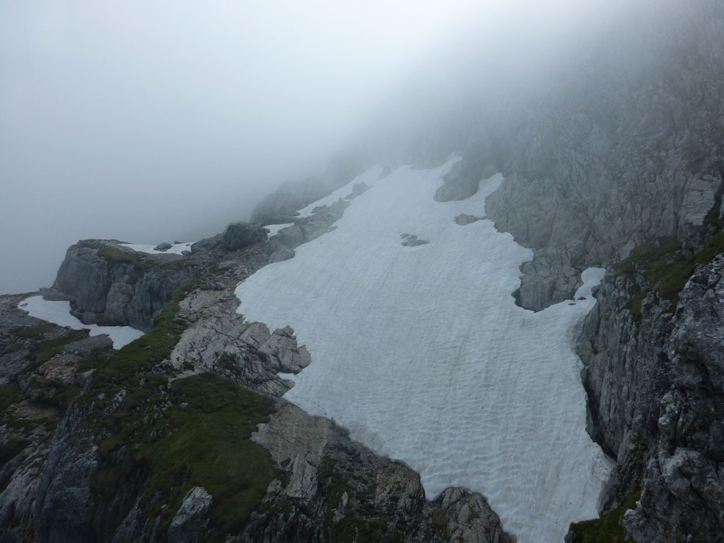 Es ist ein schöner Sonntagnachmittag, aber ich bin unschlüssig was ich mit dem Tag anstellen soll. Für eine großartige Planung ist es schon zu spät, also breche ich kurz entschlossen zum Hohen Göll über das Purtschellerhaus auf. Es ist schon einige Jahre her, dass ich den Anstieg über den Schustersteig unternommen habe, somit steht einer großartigen Bergtour nichts im Wege. Über den Eckersattel geht es folglich via Purtschellerhaus und Schustersteig auf den breiten Rücken des Hohen Gölls bis zum Gipfel. Erwartungsgemäß liegen an vielen Stellen hartnäckige Altschneefelder, und als ich beim Abstieg über den Kamin ein solches queren muss, stelle ich fest, dass ich ohnen Steighilfen oder Pickel garantiert einen Abflug auf der geradezu eisigen Oberfläche mache. Also zurück an den Start, oder zumindest wieder den Kamin hinauf und über den Schustersteig hinunter zum Purtschellerhaus. Für ein Bier wäre zwar noch genung Zeit, aber ich stapfe gleich weiter zum Parkplatz, fahre nach Hause und gehe im Kopf nochmals die Situation am Schneefeld durch. Mein Fazit ist, dass es (für mich) klug war, in solchen vermeintlich unkritischen Lagen lieber vorsichtiger zu sein, als irgendetwas zu riskieren. Wer auf einem steileren Schneefeld schon einmal einen Abflug gemacht hat, weiß vermutlich was ich meine…