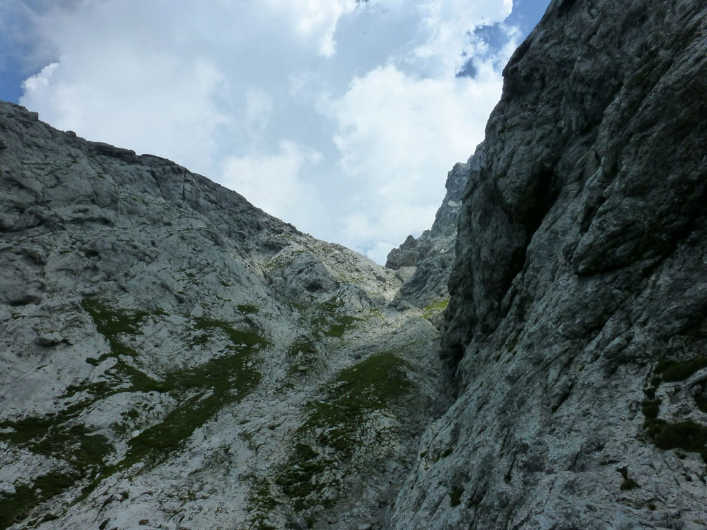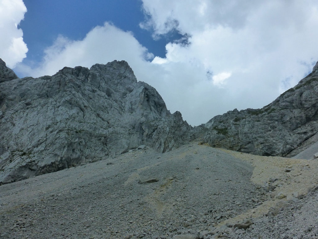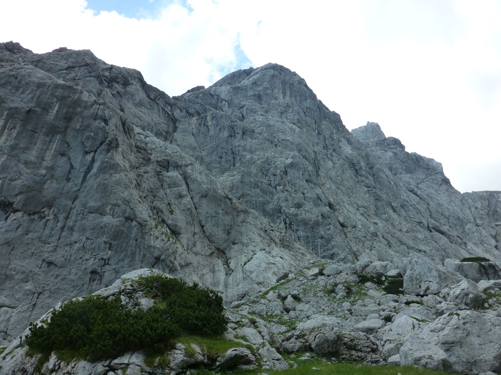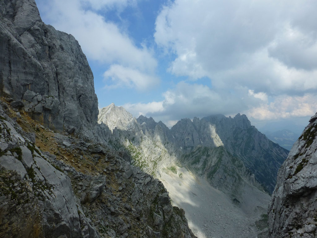 Im Kaiser war ich leider noch nicht wirklich oft unterwegs, also wird’s bald mal Zeit, sich dort einige Steige und Gipfel anzusehen. Beim Studieren meiner AV-Karte fällt mir der Kaiserschützensteig ins Auge, wo man mit einem Schlag drei Gipfel überschreiten kann, inkusive der höchsten Erhebung im Kaiser, der Ellmauer Halt. Problematisch, oder besser gesagt, mühsam erscheint mir nur der elends lange Zustieg durchs Kaisertal von Kufstein aus. Anders als vor einem Jahr auf dem Weg zum Kufsteiner Klettersteig trage ich dieses Mal mein Bike über die die knapp 300 Stufen vom Parkplatz im Ortsteil Sparchen bis zum Beginn des Wanderwegs, der bald in eine breite Straße mündet. Über diese geht es dann recht flott und entspannt bis zur Abzweigung des Wanderwegs in den Scharlinger Boden knapp vor dem Hans-Berger-Haus. Eigentlich ist das Biken im Kaisertal ausnahmslos verboten, aber es wird derzeit offensichtlich noch geduldet, und man muss nicht gleich mit einer saftigen Strafe rechnen. Ich deponiere etwas abseits des Wanderwegs mein Bike und mache mich zu Fuss auf den Weg zum Einstieg des Kaiserschützensteigs. Beim Zustieg zieht die gewaltige Westwand der Kleinen Halt ständig meine Blicke auf sich. Interessante und spannende Kletterrouten ziehen sich dort die Wand hinauf, Projekte für die nächsten Jahre also, wenn es die Zeit erlaubt. Nach über einer Stunde Fussmarsch erreiche ich dann endlich den Beginn des Steigs der auch mit recht deutlich mit Schild und einem roten Punkt markiert ist. Anfänglich führt durch den recht einfache Klettersteig nahezu durchgängig ein Sicherungsseil, welches man weiter oben nur mehr stellenweise vorfindet. Nach einem schnellen Abstecher zum Gipfel der Kleinen Halt geht es zurück am Steig, weiter in Richtung Gamshalt und Ellmauer Halt. Den markanten Gipfelaufbau der Gamshalt umrundet man dabei in einem größeren Bogen und gelangt erneut an eine Wegzweigung, nun zwischen Gamshalt und Ellmauer Halt. Ich folge dem Steig zur Gamshalt, deren Gipfel sich dann anders als von der Kleinen Halt aus vermutet, als recht unspektakulär entpuppt, und auch kein Gipfelkreuz besitzt. Nun fehlt noch der letzte Gipfel, und nach knapp einer halben Stunden stehe am höchsten Punkt im Wilden Kaiser. Ich gönne mir eine paar Minuten Pause, bevor ich mich an den Abstieg zur Rote-Rinn-Scharte mache. In der Scharte zweigt dann der Gamsängersteig in Richtung Gruttenhütte ab, ich folge aber dem Steig zurück in den Scharlinger Boden. Über die mittelsteilen Schotterfelder mache ich schnell Höhenmeter bis ich schließlich wieder den Einstieg zum Kaiserschützensteig erreiche. Der weitere Abstieg bis zum Bike zieht sich ein wenig, und ich merke, dass ich seit einigen Stunden fast pausenlos auf den Beinen bin. Beim Bike angekommen, bin ich wirklich froh, dass ich nun den restlichen Rückweg durch das Kaisertal entspannt und genußvoll mit dem Bike zurücklegen kann. Im Kaisertal bleibe ich noch einmal stehen und blicke zurück auf die lange Wandflucht der Kleinen Halt, die mich auch aus der Ferne immer noch beeindruckt. Hier war ich heute sicher nicht zum letzten Mal…
