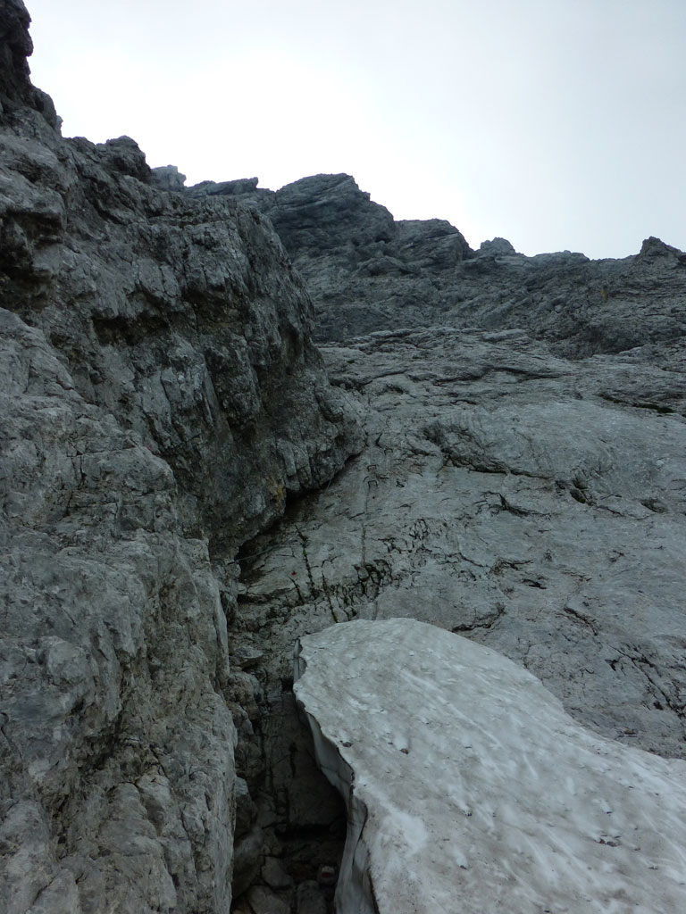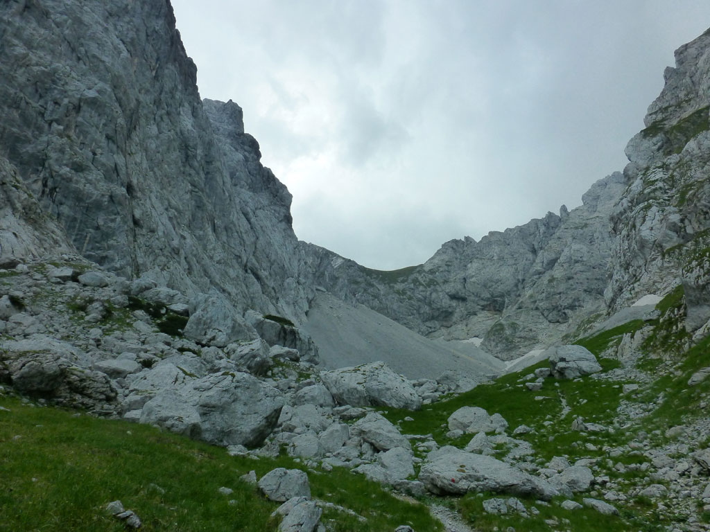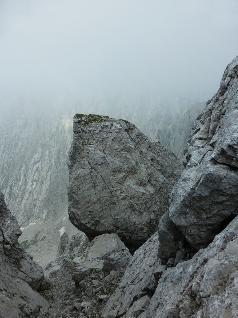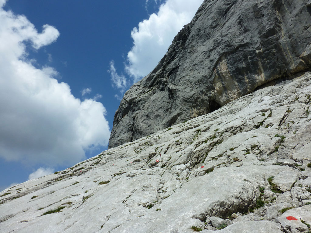 Im Kaiser war ich leider noch nicht wirklich oft unterwegs, also wird’s bald mal Zeit, sich dort einige Steige und Gipfel anzusehen. Beim Studieren meiner AV-Karte fällt mir der Kaiserschützensteig ins Auge, wo man mit einem Schlag drei Gipfel überschreiten kann, inkusive der höchsten Erhebung im Kaiser, der Ellmauer Halt. Problematisch, oder besser gesagt, mühsam erscheint mir nur der elends lange Zustieg durchs Kaisertal von Kufstein aus. Anders als vor einem Jahr auf dem Weg zum Kufsteiner Klettersteig trage ich dieses Mal mein Bike über die die knapp 300 Stufen vom Parkplatz im Ortsteil Sparchen bis zum Beginn des Wanderwegs, der bald in eine breite Straße mündet. Über diese geht es dann recht flott und entspannt bis zur Abzweigung des Wanderwegs in den Scharlinger Boden knapp vor dem Hans-Berger-Haus. Eigentlich ist das Biken im Kaisertal ausnahmslos verboten, aber es wird derzeit offensichtlich noch geduldet, und man muss nicht gleich mit einer saftigen Strafe rechnen. Ich deponiere etwas abseits des Wanderwegs mein Bike und mache mich zu Fuss auf den Weg zum Einstieg des Kaiserschützensteigs. Beim Zustieg zieht die gewaltige Westwand der Kleinen Halt ständig meine Blicke auf sich. Interessante und spannende Kletterrouten ziehen sich dort die Wand hinauf, Projekte für die nächsten Jahre also, wenn es die Zeit erlaubt. Nach über einer Stunde Fussmarsch erreiche ich dann endlich den Beginn des Steigs der auch mit recht deutlich mit Schild und einem roten Punkt markiert ist. Anfänglich führt durch den recht einfache Klettersteig nahezu durchgängig ein Sicherungsseil, welches man weiter oben nur mehr stellenweise vorfindet. Nach einem schnellen Abstecher zum Gipfel der Kleinen Halt geht es zurück am Steig, weiter in Richtung Gamshalt und Ellmauer Halt. Den markanten Gipfelaufbau der Gamshalt umrundet man dabei in einem größeren Bogen und gelangt erneut an eine Wegzweigung, nun zwischen Gamshalt und Ellmauer Halt. Ich folge dem Steig zur Gamshalt, deren Gipfel sich dann anders als von der Kleinen Halt aus vermutet, als recht unspektakulär entpuppt, und auch kein Gipfelkreuz besitzt. Nun fehlt noch der letzte Gipfel, und nach knapp einer halben Stunden stehe am höchsten Punkt im Wilden Kaiser. Ich gönne mir eine paar Minuten Pause, bevor ich mich an den Abstieg zur Rote-Rinn-Scharte mache. In der Scharte zweigt dann der Gamsängersteig in Richtung Gruttenhütte ab, ich folge aber dem Steig zurück in den Scharlinger Boden. Über die mittelsteilen Schotterfelder mache ich schnell Höhenmeter bis ich schließlich wieder den Einstieg zum Kaiserschützensteig erreiche. Der weitere Abstieg bis zum Bike zieht sich ein wenig, und ich merke, dass ich seit einigen Stunden fast pausenlos auf den Beinen bin. Beim Bike angekommen, bin ich wirklich froh, dass ich nun den restlichen Rückweg durch das Kaisertal entspannt und genußvoll mit dem Bike zurücklegen kann. Im Kaisertal bleibe ich noch einmal stehen und blicke zurück auf die lange Wandflucht der Kleinen Halt, die mich auch aus der Ferne immer noch beeindruckt. Hier war ich heute sicher nicht zum letzten Mal…
