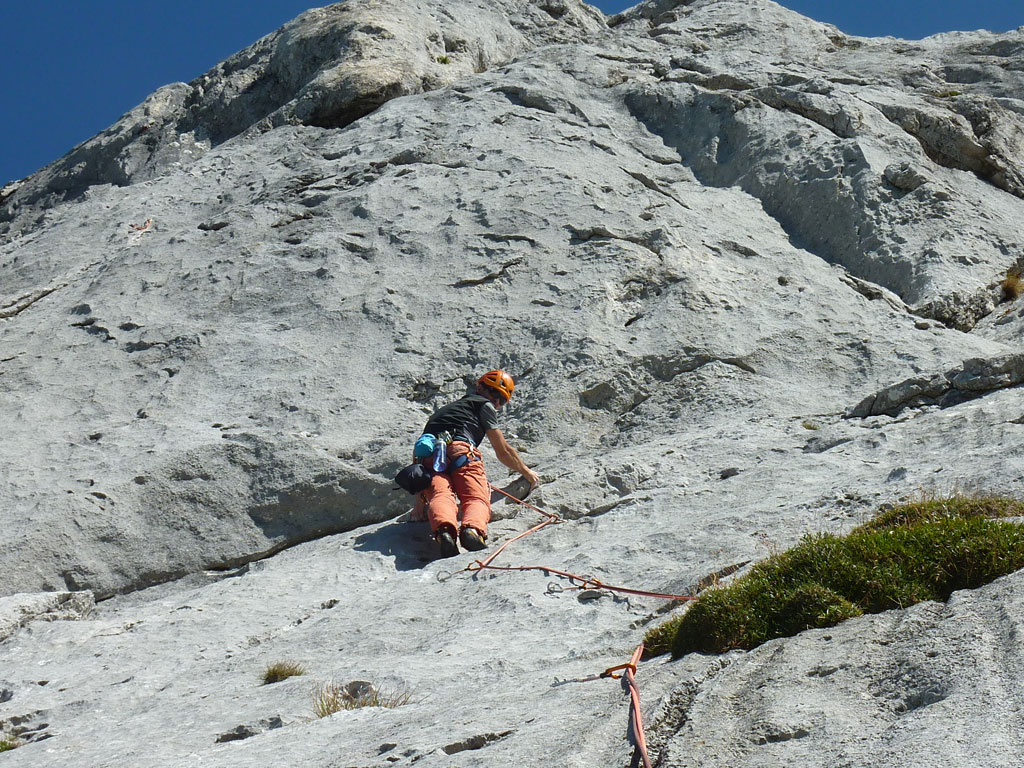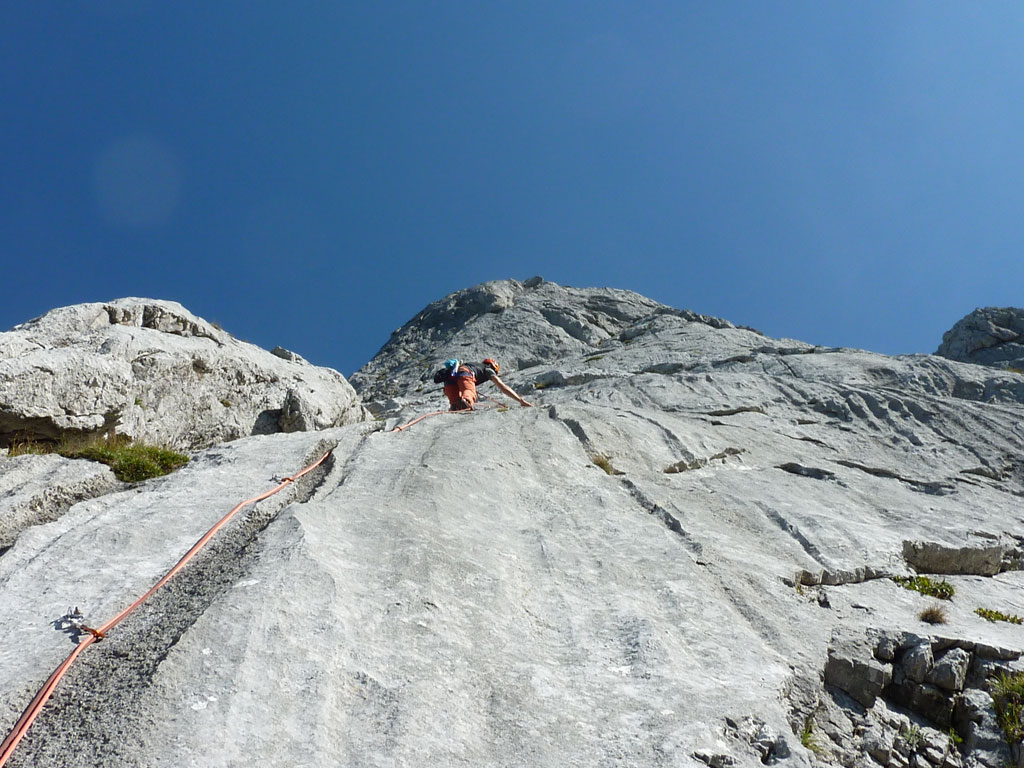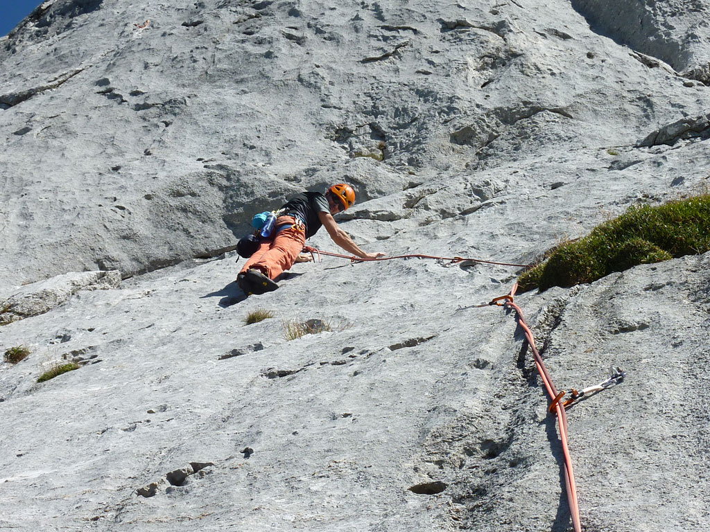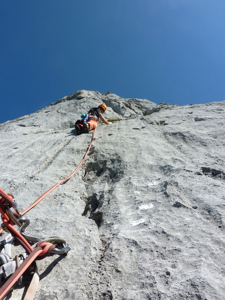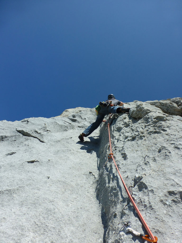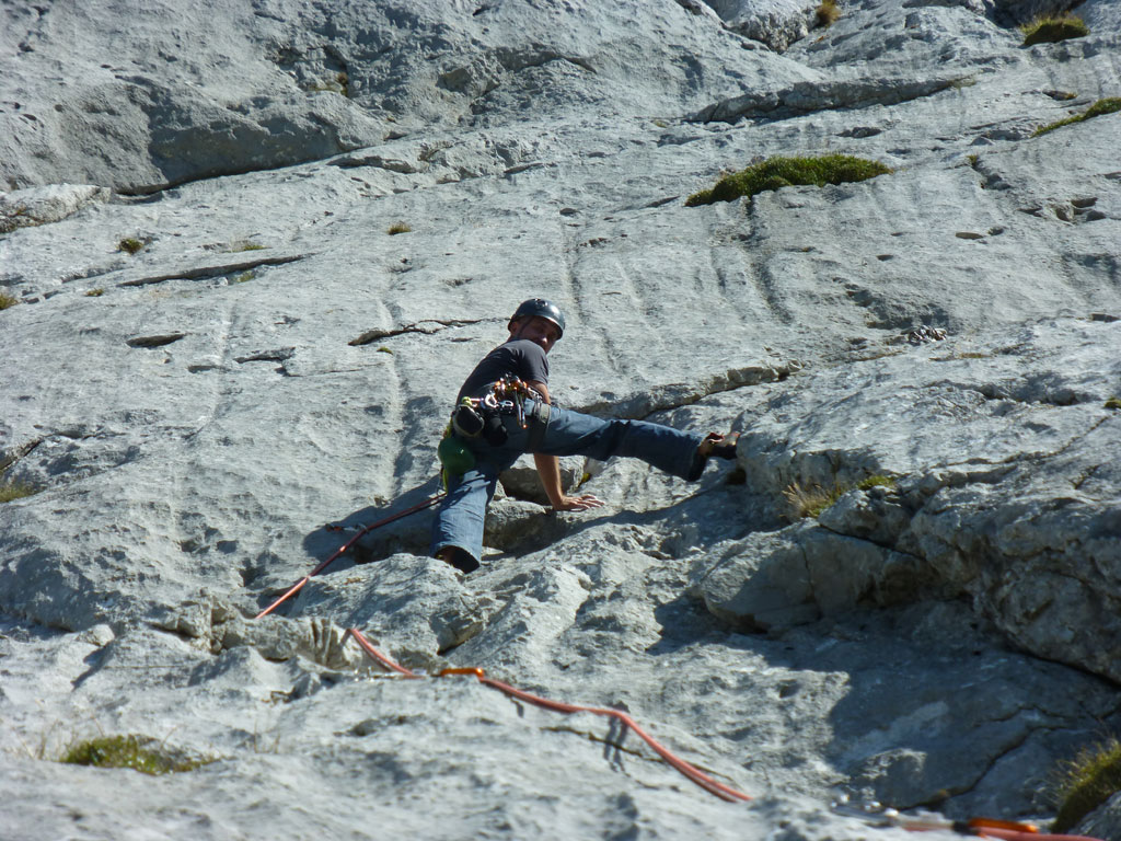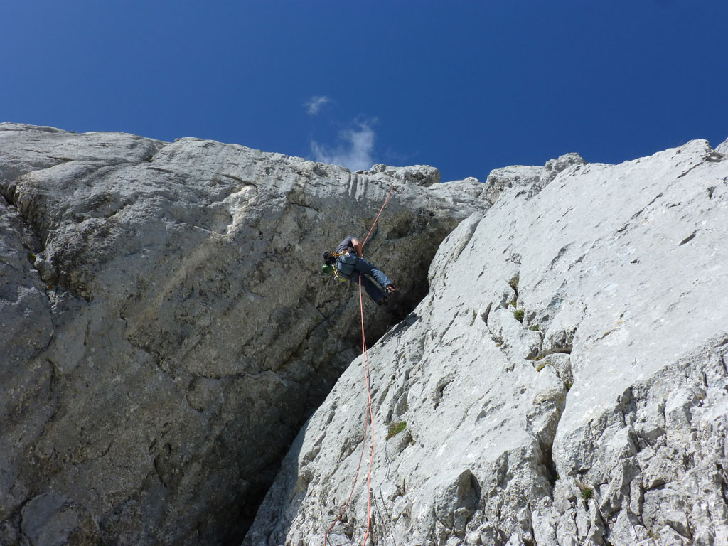 Nach unserem letzten Versuch im Juli war klar, dass wir diese Route sobald als möglich wieder angehen mussten. Chris war schon früher mal mit Andi in dieser Tour unterwegs und wusste somit genau, was uns in den kommenden fünf Seillängen erwartet. In der dritten Seillänge kam ich dann schon mal richtig ins schwitzen, und versuchte mich mit behutsamen Bewegungen die eher grifflose Platte bis zum nächsten guten Griff hochzuschieben – „Hurra, hurra, ein Untergriff…!!!!“ :-). Aber nun war Chris an der Reihe und kämpfte sich ebenfalls schwitzend und brüllend die Schlüsselstelle, eine stumpfe glatte Verschneidung, hoch. Meine Performance im Nachstieg (!) war eher sehr bescheiden, und ich weiss bis heute nicht, wie ich mich in dieser Verschneidung verdrehen hätte müssen, um die Stelle sauber klettern zu können. Nun ja, so wie’s aussieht, kommen wir hier früher oder später wieder vorbei und dann hoffe ich, dass ich mich mit einem soliden Vorstieg ein wenig rehabilitieren kann. Jedenfalls war es eine erstklassige Kletterei am super-rauen Fels des rechten Pfeilers, wo wir zukünftig noch in einige andere lässige Route einsteigen müssen.