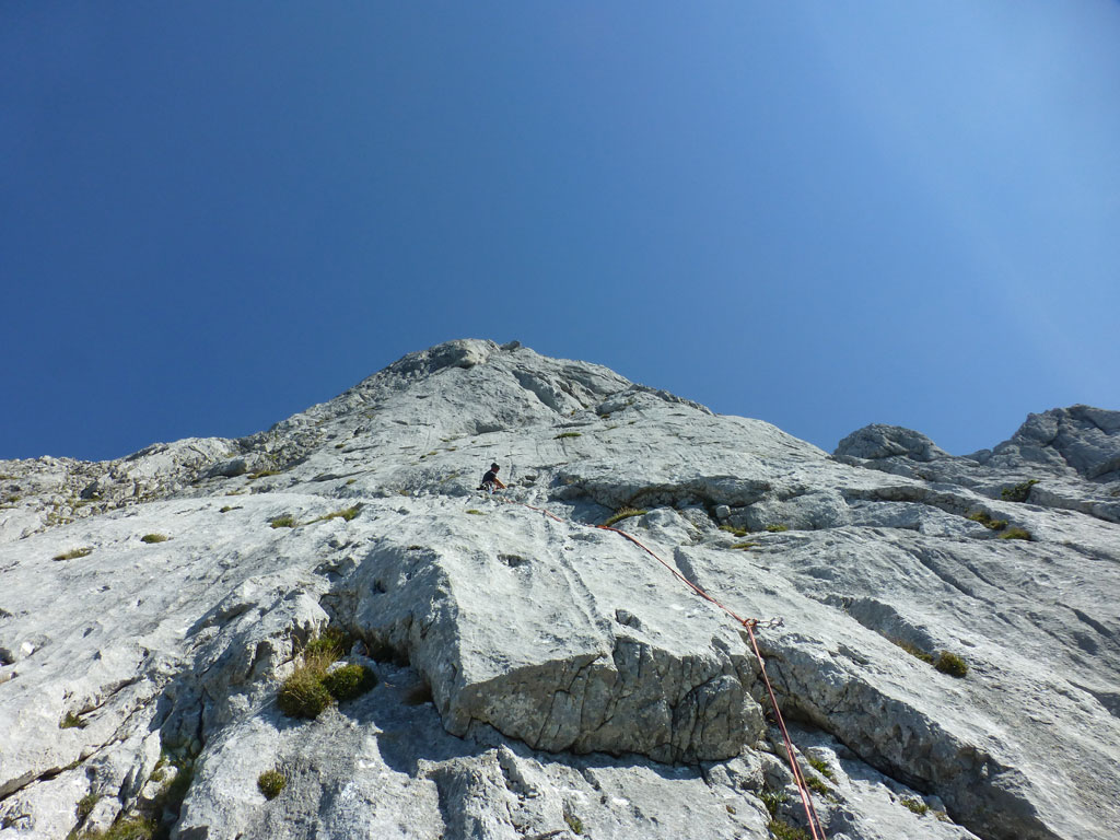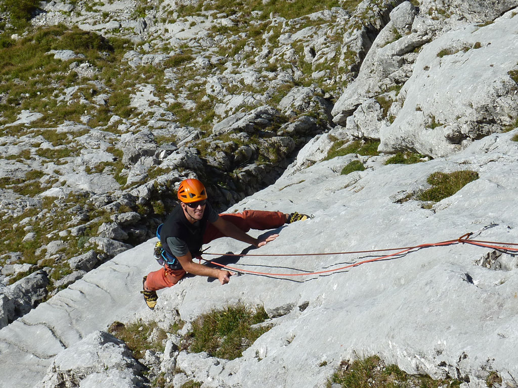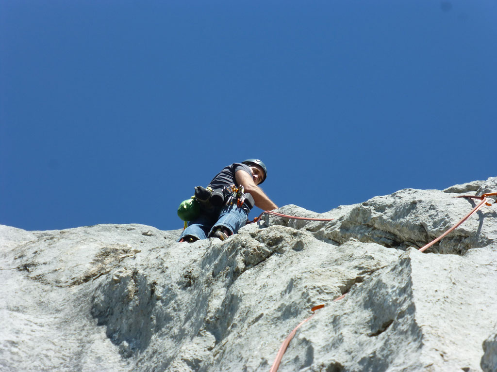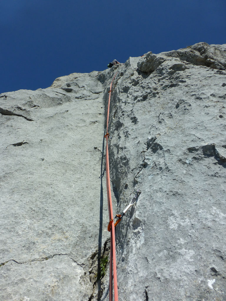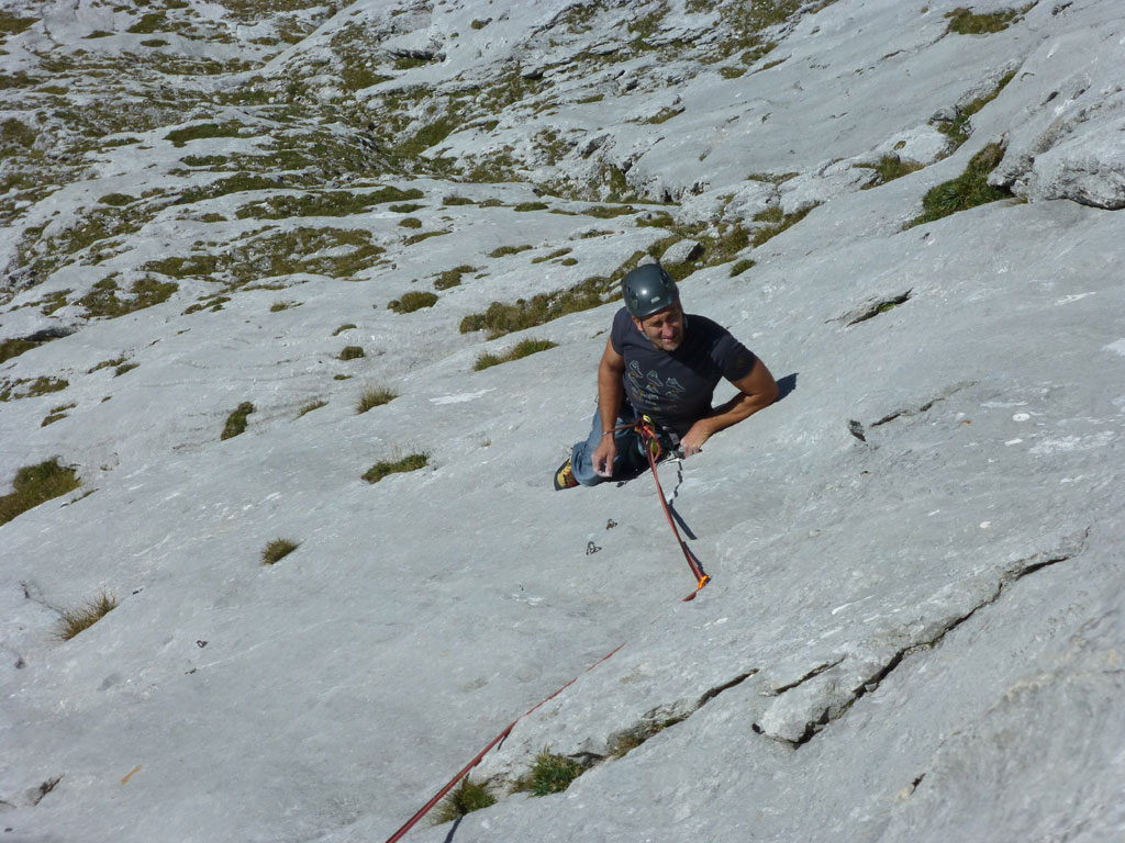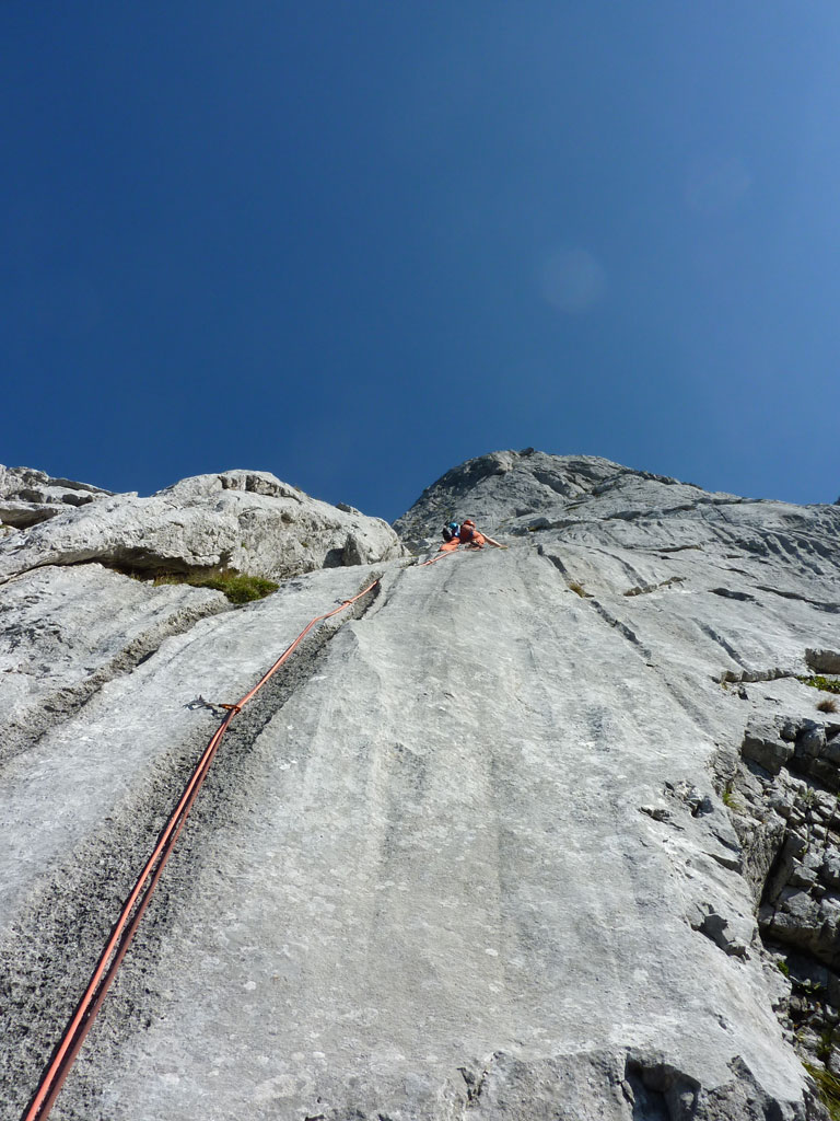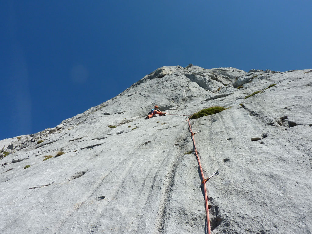 Nach unserem letzten Versuch im Juli war klar, dass wir diese Route sobald als möglich wieder angehen mussten. Chris war schon früher mal mit Andi in dieser Tour unterwegs und wusste somit genau, was uns in den kommenden fünf Seillängen erwartet. In der dritten Seillänge kam ich dann schon mal richtig ins schwitzen, und versuchte mich mit behutsamen Bewegungen die eher grifflose Platte bis zum nächsten guten Griff hochzuschieben – „Hurra, hurra, ein Untergriff…!!!!“ :-). Aber nun war Chris an der Reihe und kämpfte sich ebenfalls schwitzend und brüllend die Schlüsselstelle, eine stumpfe glatte Verschneidung, hoch. Meine Performance im Nachstieg (!) war eher sehr bescheiden, und ich weiss bis heute nicht, wie ich mich in dieser Verschneidung verdrehen hätte müssen, um die Stelle sauber klettern zu können. Nun ja, so wie’s aussieht, kommen wir hier früher oder später wieder vorbei und dann hoffe ich, dass ich mich mit einem soliden Vorstieg ein wenig rehabilitieren kann. Jedenfalls war es eine erstklassige Kletterei am super-rauen Fels des rechten Pfeilers, wo wir zukünftig noch in einige andere lässige Route einsteigen müssen.