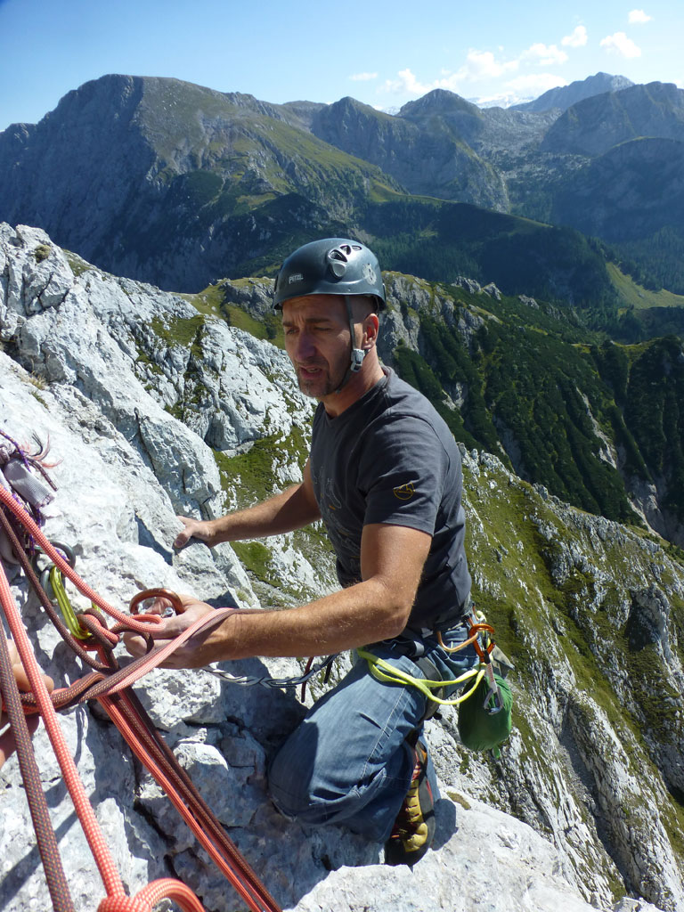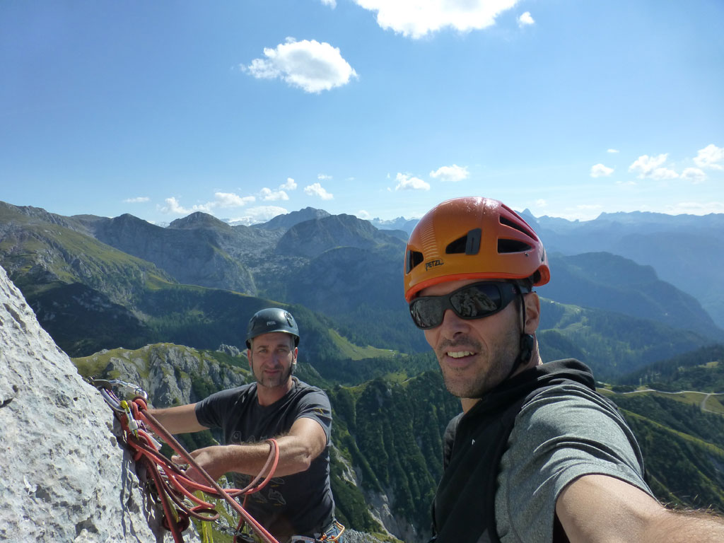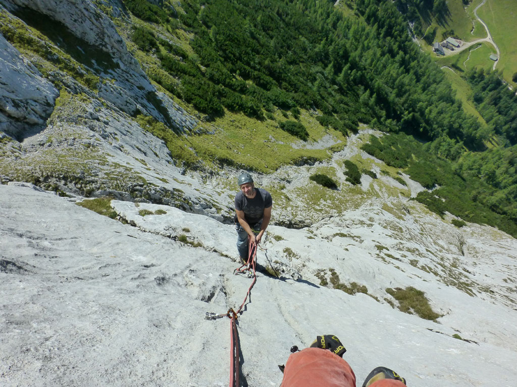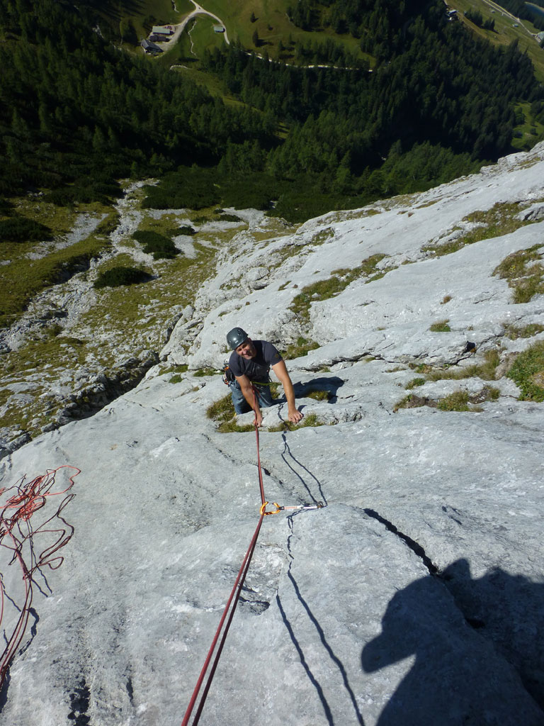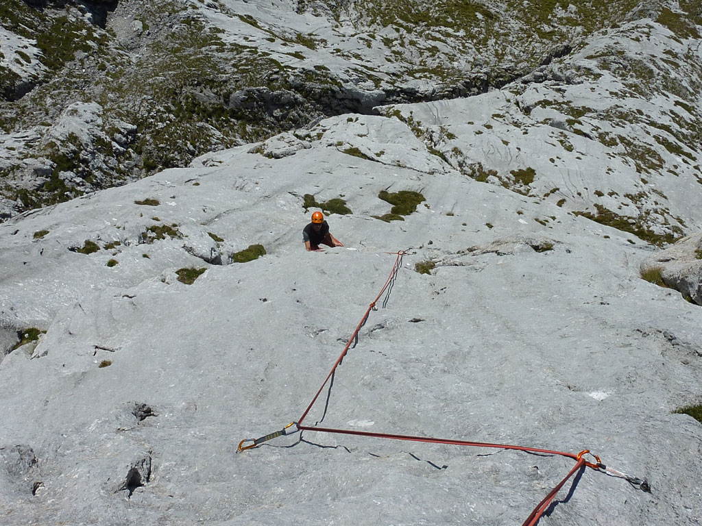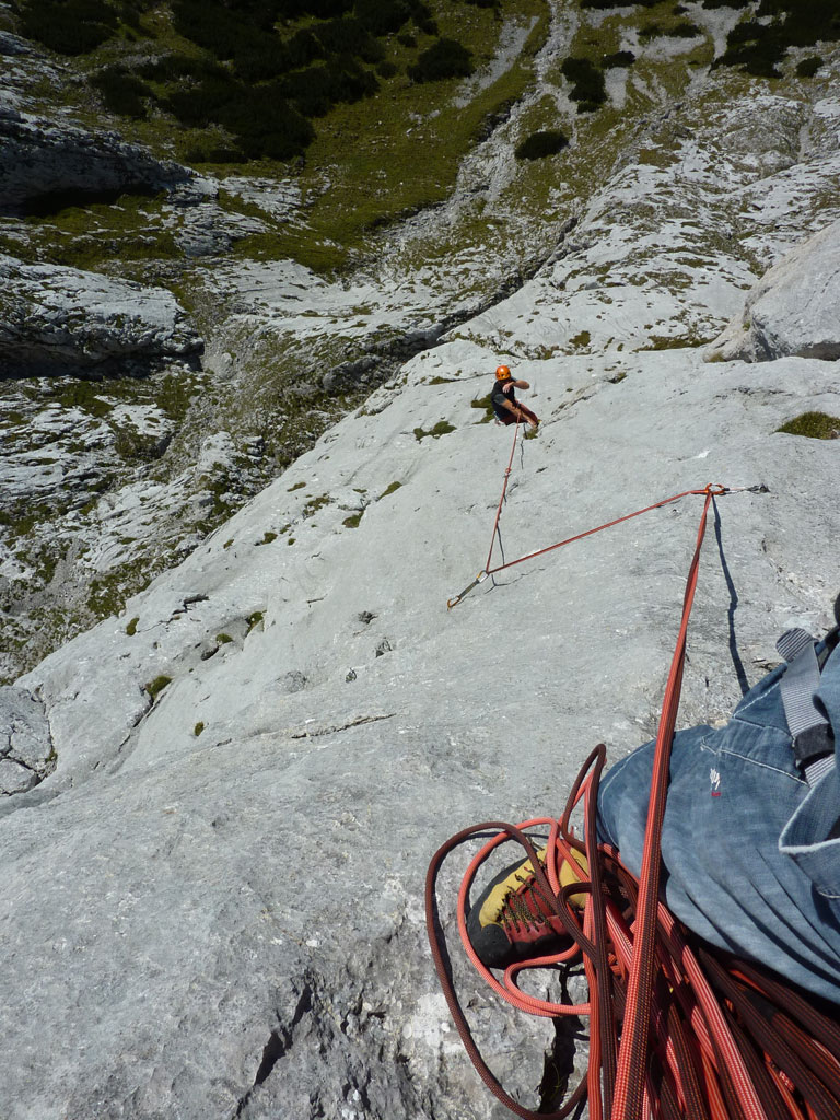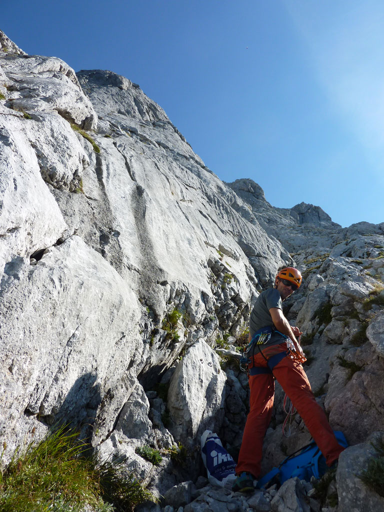Nach unserem letzten Versuch im Juli war klar, dass wir diese Route sobald als möglich wieder angehen mussten. Chris war schon früher mal mit Andi in dieser Tour unterwegs und wusste somit genau, was uns in den kommenden fünf Seillängen erwartet. In der dritten Seillänge kam ich dann schon mal richtig ins schwitzen, und versuchte mich mit behutsamen Bewegungen die eher grifflose Platte bis zum nächsten guten Griff hochzuschieben – „Hurra, hurra, ein Untergriff…!!!!“ :-). Aber nun war Chris an der Reihe und kämpfte sich ebenfalls schwitzend und brüllend die Schlüsselstelle, eine stumpfe glatte Verschneidung, hoch. Meine Performance im Nachstieg (!) war eher sehr bescheiden, und ich weiss bis heute nicht, wie ich mich in dieser Verschneidung verdrehen hätte müssen, um die Stelle sauber klettern zu können. Nun ja, so wie’s aussieht, kommen wir hier früher oder später wieder vorbei und dann hoffe ich, dass ich mich mit einem soliden Vorstieg ein wenig rehabilitieren kann. Jedenfalls war es eine erstklassige Kletterei am super-rauen Fels des rechten Pfeilers, wo wir zukünftig noch in einige andere lässige Route einsteigen müssen.