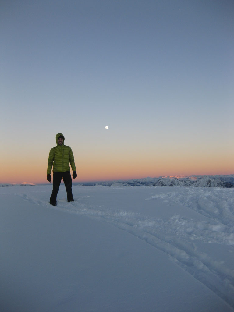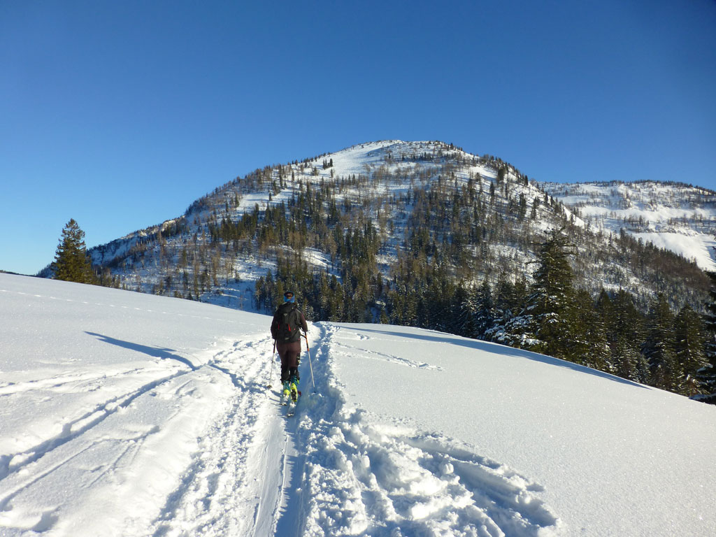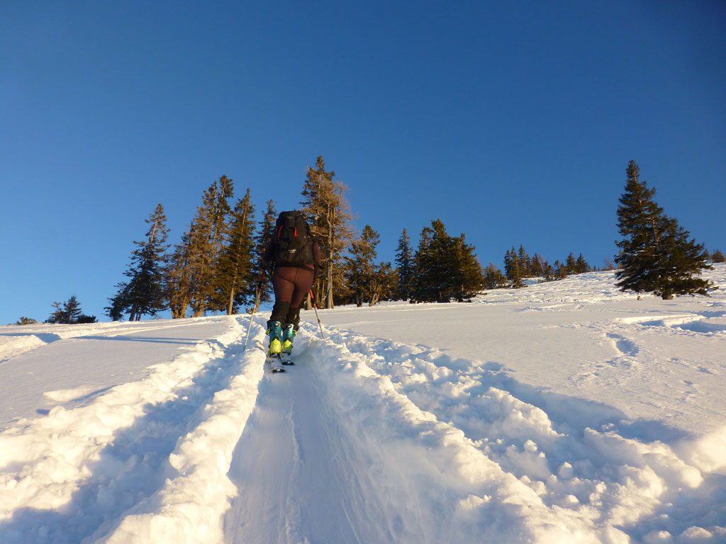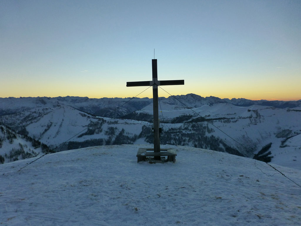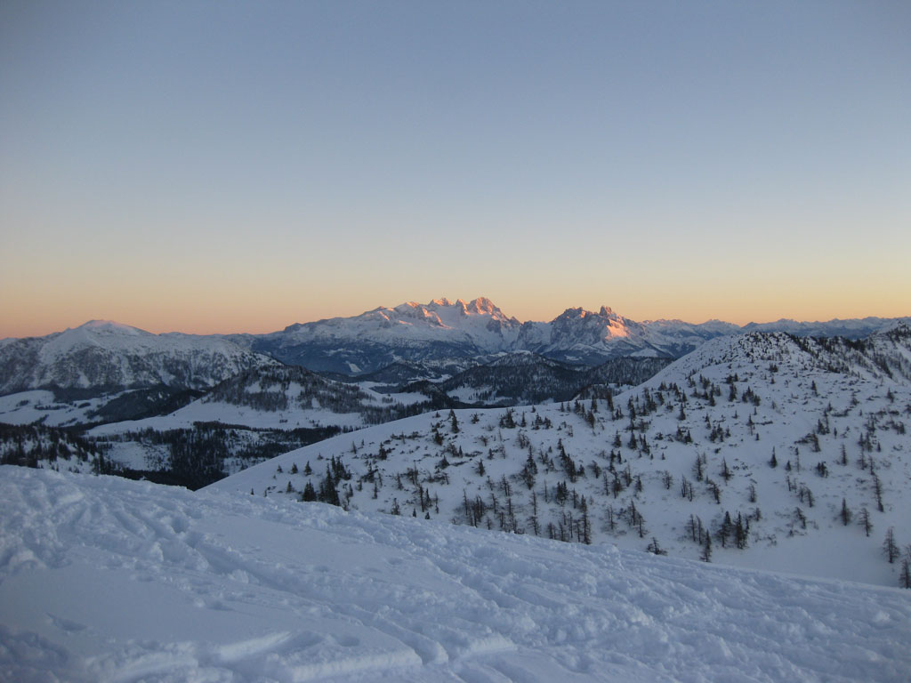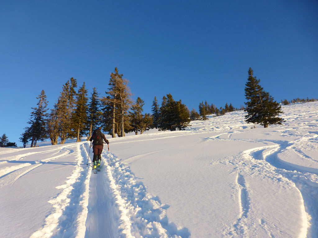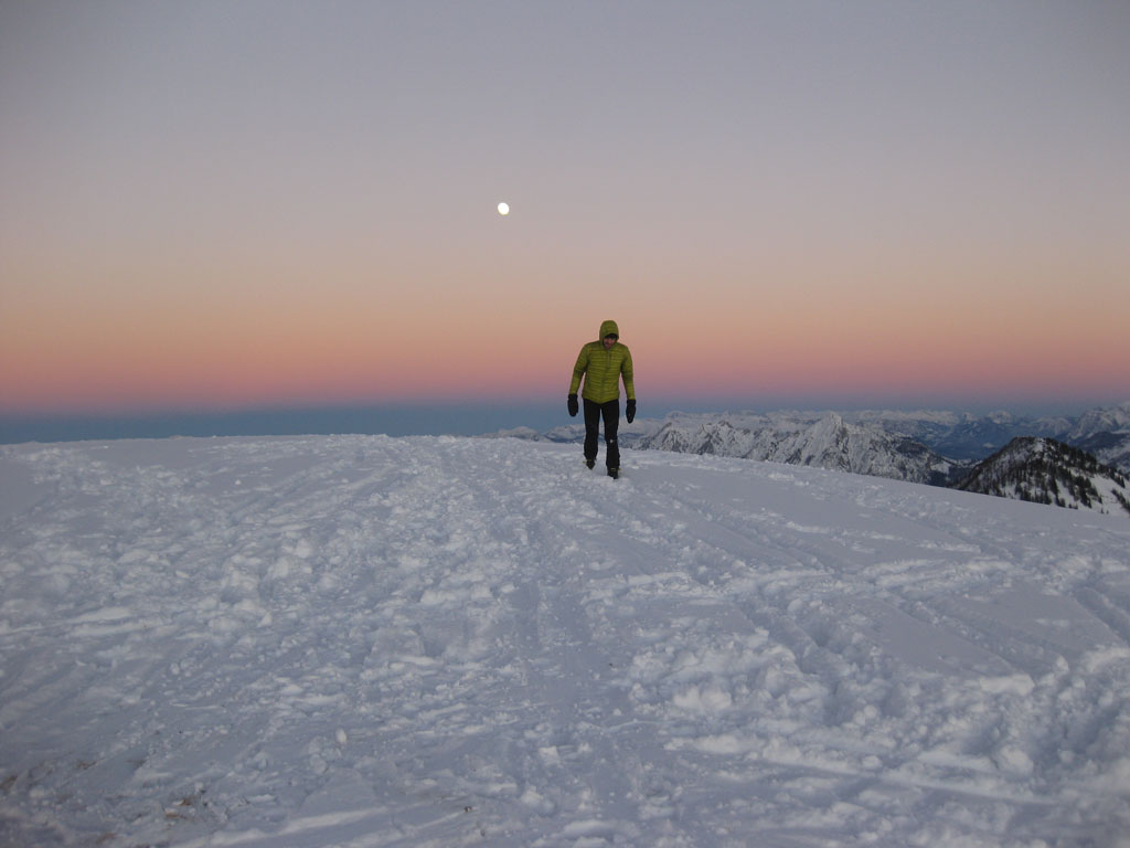 Zwei Wochen nach meinem ersten missglückten Ausflug am Göll starteten Gerlinde und ich für eine Nachmittagsschitour von Lämmerbach bei Hintersee über die Genneralm auf den Hohen Zinken. Das Wetter war einfach perfekt, wolkenlos, und die kühlen Temperaturen haben die Pulverauflage bestens konserviert. Am Gipfel war es dafür schon recht frisch, also gab’s nur eine kurze Fotosession bevor wir im Schein der untergehenden Sonne die Abfahrt antraten. Anders als sonst war ich bei den ersten Schwüngen etwas nervös, weil ich noch kein Gefühl für meinen neuen Schi hatte, der mit einer moderaten Rocker-Bauweise schon etwas Gewöhnung bedarf. Aber nach den ersten Höhenmettern im Pulverschnee war klar, dass Gerät ist der Hammer!! Lässige Tour, super Nachmittag, so kann der Winter weitergehen…