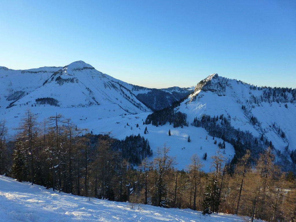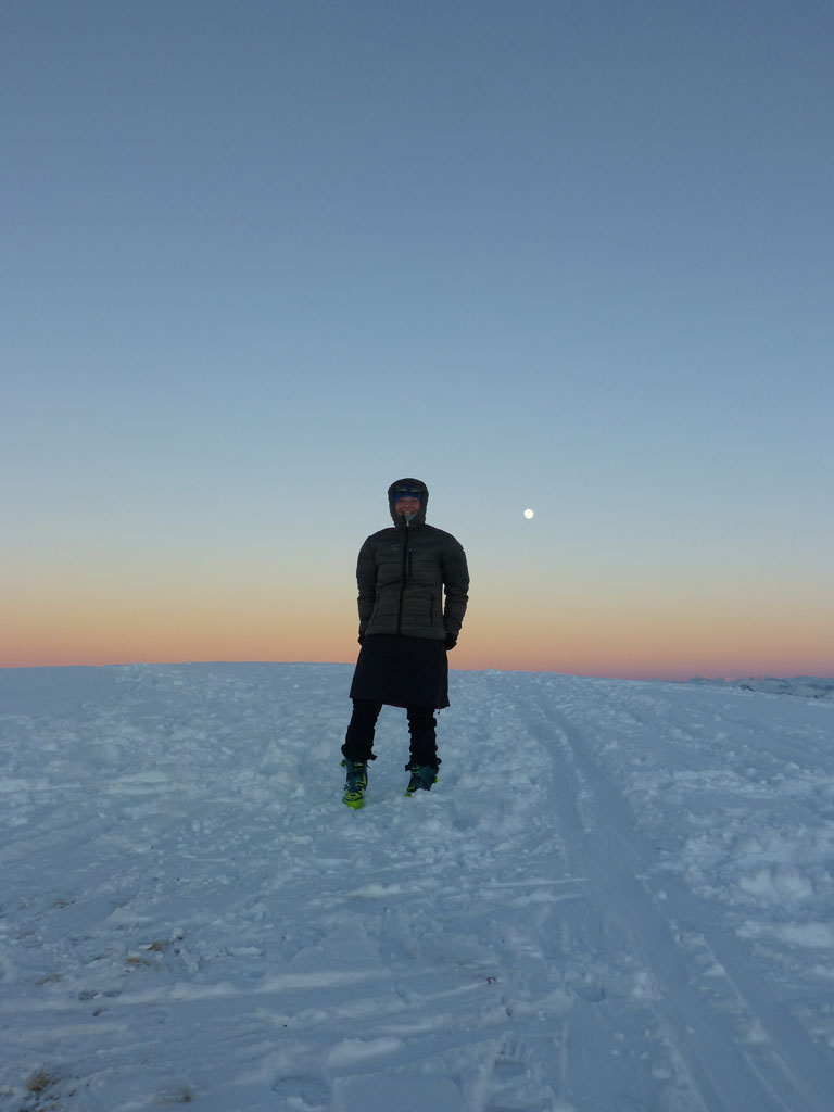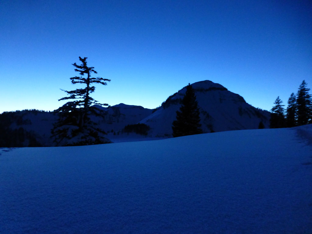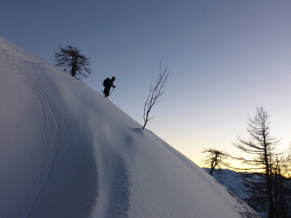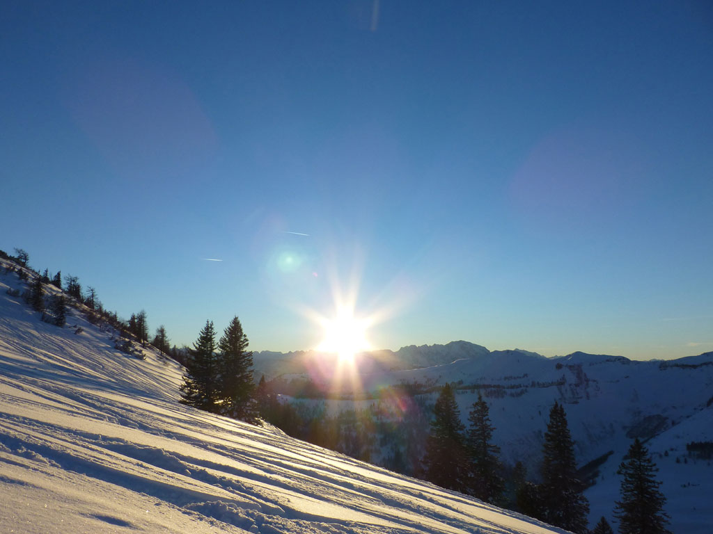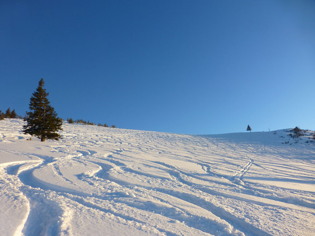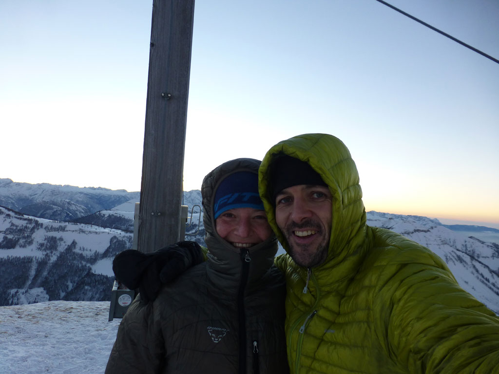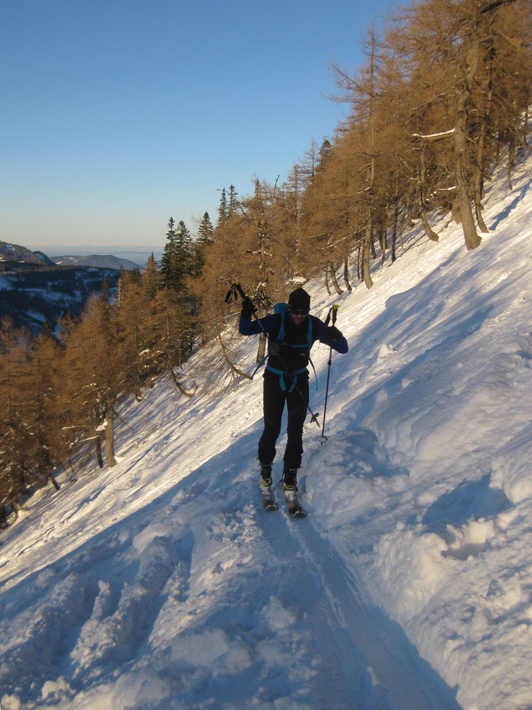 Zwei Wochen nach meinem ersten missglückten Ausflug am Göll starteten Gerlinde und ich für eine Nachmittagsschitour von Lämmerbach bei Hintersee über die Genneralm auf den Hohen Zinken. Das Wetter war einfach perfekt, wolkenlos, und die kühlen Temperaturen haben die Pulverauflage bestens konserviert. Am Gipfel war es dafür schon recht frisch, also gab’s nur eine kurze Fotosession bevor wir im Schein der untergehenden Sonne die Abfahrt antraten. Anders als sonst war ich bei den ersten Schwüngen etwas nervös, weil ich noch kein Gefühl für meinen neuen Schi hatte, der mit einer moderaten Rocker-Bauweise schon etwas Gewöhnung bedarf. Aber nach den ersten Höhenmettern im Pulverschnee war klar, dass Gerät ist der Hammer!! Lässige Tour, super Nachmittag, so kann der Winter weitergehen…