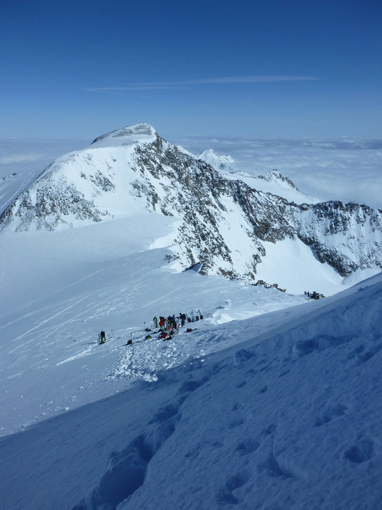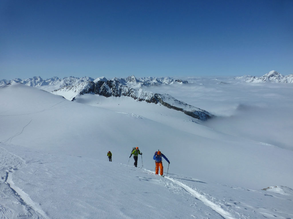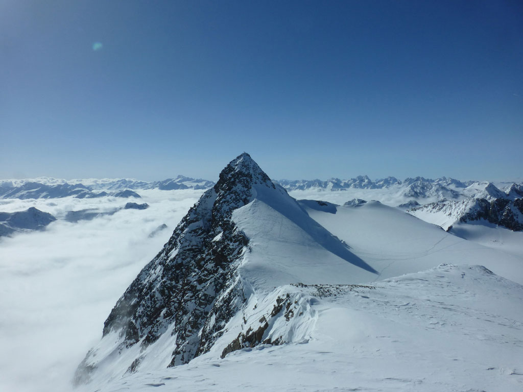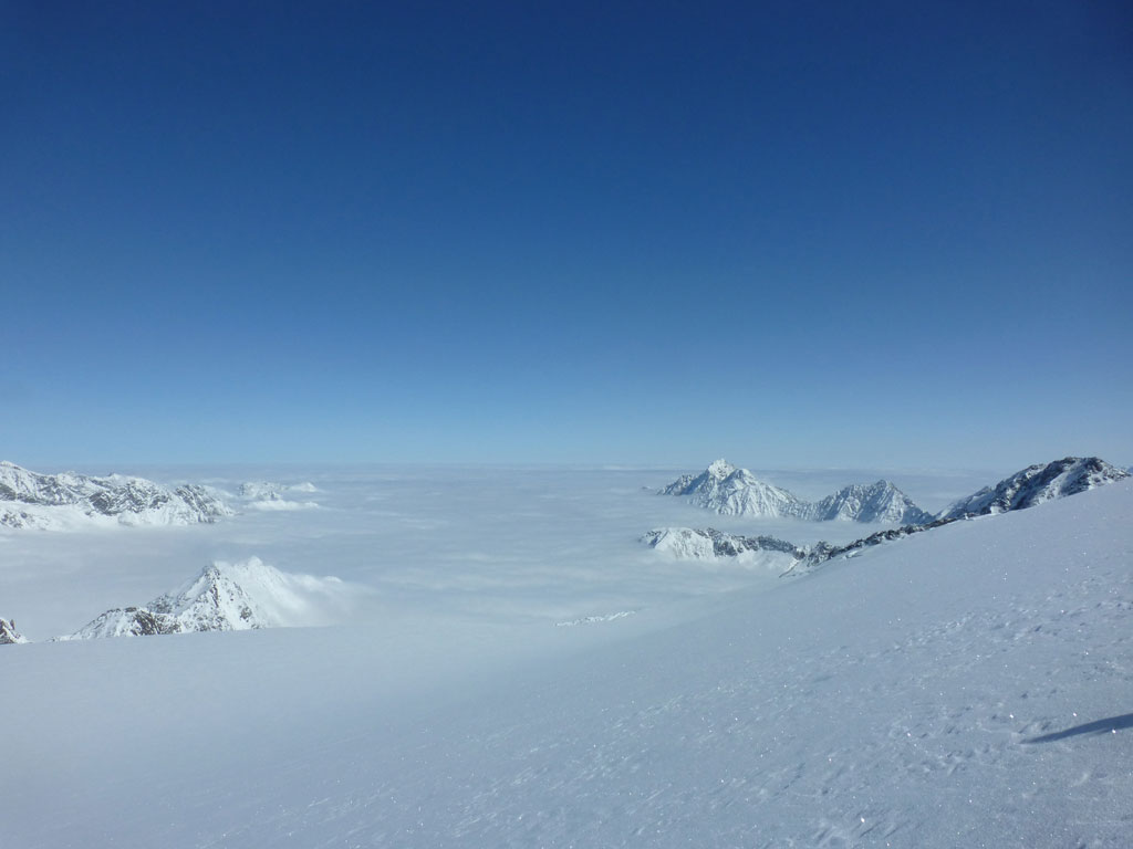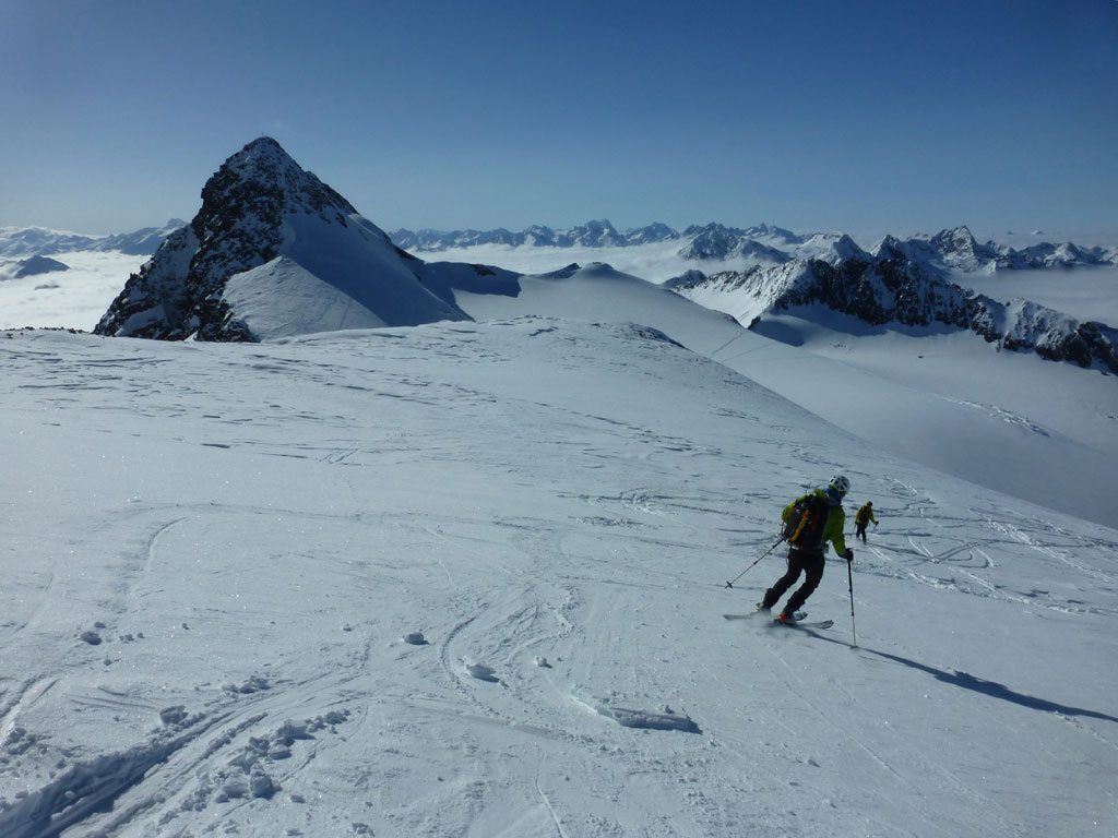 Mittels Pickel und Steigeisen wühlten wir uns über den kurzen, unschwierigen Ostgrat zum Gipfel. Der Ausblick vom Zuckerhütl ist beeindruckend, und viele der umliegenden Berge scheinen zum Greifen nahe. So nahe, dass wir uns nach einer Pause mit Fotosession noch den Wilden Pfaff gegenüber vornehmen wollten. Wieder beim Schidepot angekommen, fuhren wir soweit als möglich in Richtung Wilder Paff ab, bevor wir es wieder unsteil aber zunehmend anstrengender nach oben ging. Am Gipfel des Wilden Pfaff hat man dann einen grandiosen Blick auf das Zuckerhütl, aber was uns vor allem auffiel war, dass das dichte Wolkenmeer immer mehr die niedrigeren Berge um uns herum verschlang. Was bedeutet, wir sollten uns nun doch an den Rückweg zum Schigebiet machen, weil schlechte Sicht oder gar ein Whiteout am Gletscher mit Sicherheit ein ernstzunehmendes Problem darstellen können. Aber es kam, wie es kommen musste: Bei der Abfahrt am Sulzenauferner lachte uns die Sonne ins Gesicht, während wir unterhalb des Pfaffenferners schon im trüben Nebel in Richtung Schlepplift zum Schaufeljoch fuhren. Als wir dann beim Lift ankamen, es war genau 16:00 Uhr, wurde der natürlich genau vor uns abgeschaltet. Die Sicht wurde immer schlechter und wir mussten nun also den Anstieg zum Schaufeljoch aus eigener Kraft bewältigen. Langsam und suchend ging es im Trüben Weiß nach oben, immer wieder mit Pausen um bloß nicht die falsche Richtung einzuschlagen. Die Bergstation beim Schaufeljoch konnten wir dann erst sehen, als wir unmittelbar davor standen. Wir hatten eigentlich keine Ahnung, wie oder wo wir nun nach unten zur Talstation kommen, somit versuchten wir schon etwas angespannt eine Übersicht aller Abfahrten und Pisten zu finden. Leider mit wenig Erfolg. Das erstbeste Schild mit einer ausgewiesenen Abfahrt war die einzige Alternative um irgendwie nach unten zu kommen. Dicht hintereinander fuhren wir im Schneckentempo in einem satten Whiteout orientierungslos nach unten. In manchen Augenblicken hatte ich keine Ahnung, ob ich nach oben oder unten fahre, ja es fühlte sich so an, als wäre man betrunken und alles drehte sich. Der eine oder andere tolpatschige Sturz war vorprogrammiert. Wir hatten keine Ahnung wo wir waren, geschweige denn wo uns diese Abfahrt hinführt. Hin und wieder deuteten Markierungen und Stangen darauf hin, dass wir uns zumindest noch auf einer Schipiste, oder zumindest nicht weit weg davon befanden. Wir landeten schließlich viel zu weit östlich bei der Dresdner Hütte, wo zwar keine Piste ins Tal führt, aber man zumindest über eine steinige Forststrasse zu Fuss ins Tal hinunterkommt. Knappe 600 Höhenmeter die Schi tragend kamen wir erleichtert, aber auch müde und erschöpft beim Parkplatz an. Den letzten Teil der Tour hatten wir uns natürlich anderes vorgestellte, den im Blindflug und super langsam abfahren, die Schi nach unten tragen, macht eben weniger Spass. Dafür haben wir aus diesem Tag auch einige Lehren gezogen. Alles in allem war es ein super Tour mit spannendem Abschluss, die ich gerne nochmals bei guter Sicht und mit einer alternativen Abfahrt wiederholen möchte.