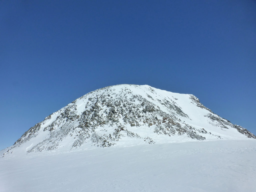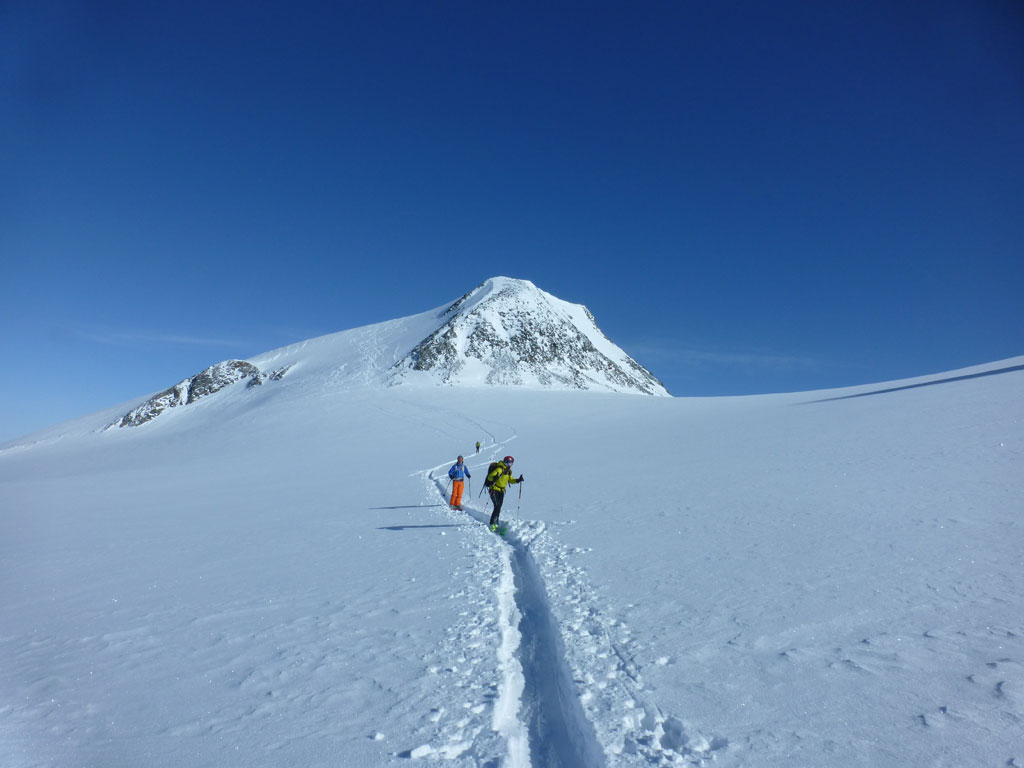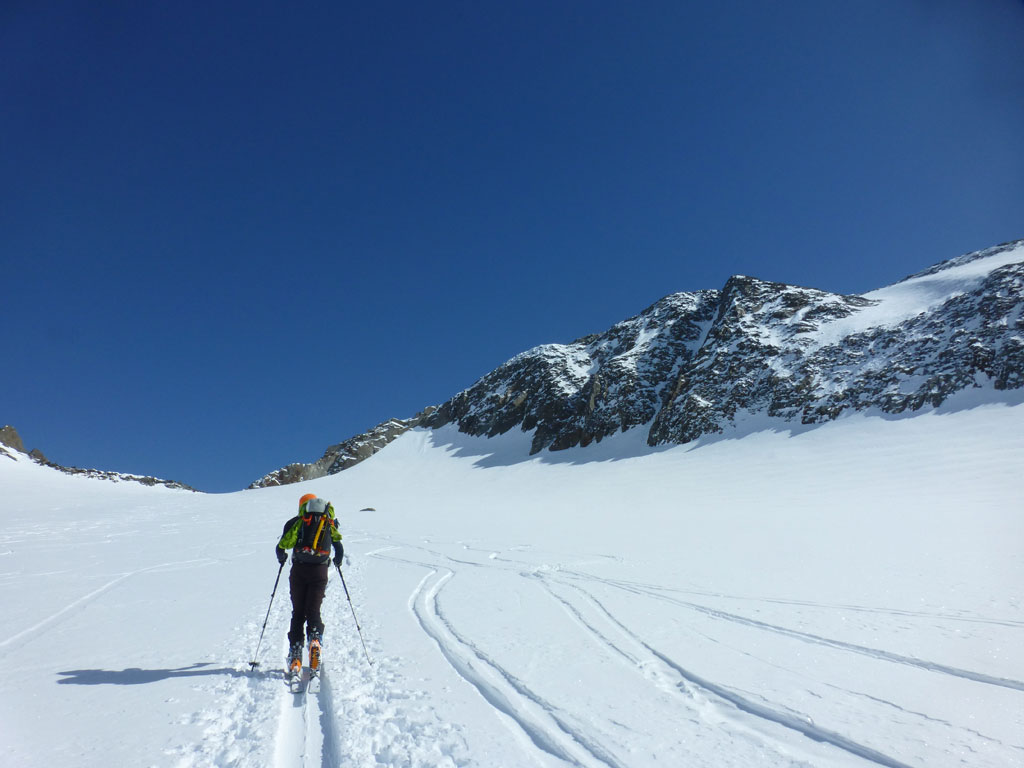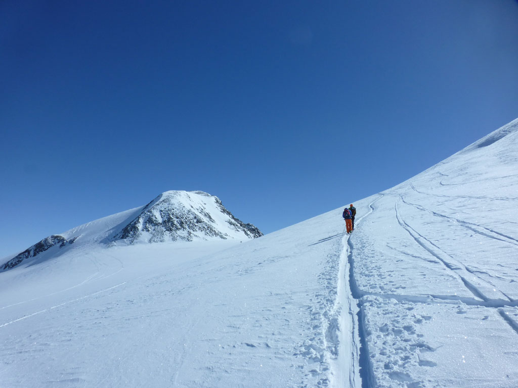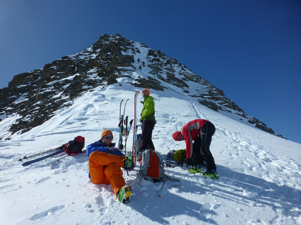 Mittels Pickel und Steigeisen wühlten wir uns über den kurzen, unschwierigen Ostgrat zum Gipfel. Der Ausblick vom Zuckerhütl ist beeindruckend, und viele der umliegenden Berge scheinen zum Greifen nahe. So nahe, dass wir uns nach einer Pause mit Fotosession noch den Wilden Pfaff gegenüber vornehmen wollten. Wieder beim Schidepot angekommen, fuhren wir soweit als möglich in Richtung Wilder Paff ab, bevor wir es wieder unsteil aber zunehmend anstrengender nach oben ging. Am Gipfel des Wilden Pfaff hat man dann einen grandiosen Blick auf das Zuckerhütl, aber was uns vor allem auffiel war, dass das dichte Wolkenmeer immer mehr die niedrigeren Berge um uns herum verschlang. Was bedeutet, wir sollten uns nun doch an den Rückweg zum Schigebiet machen, weil schlechte Sicht oder gar ein Whiteout am Gletscher mit Sicherheit ein ernstzunehmendes Problem darstellen können. Aber es kam, wie es kommen musste: Bei der Abfahrt am Sulzenauferner lachte uns die Sonne ins Gesicht, während wir unterhalb des Pfaffenferners schon im trüben Nebel in Richtung Schlepplift zum Schaufeljoch fuhren. Als wir dann beim Lift ankamen, es war genau 16:00 Uhr, wurde der natürlich genau vor uns abgeschaltet. Die Sicht wurde immer schlechter und wir mussten nun also den Anstieg zum Schaufeljoch aus eigener Kraft bewältigen. Langsam und suchend ging es im Trüben Weiß nach oben, immer wieder mit Pausen um bloß nicht die falsche Richtung einzuschlagen. Die Bergstation beim Schaufeljoch konnten wir dann erst sehen, als wir unmittelbar davor standen. Wir hatten eigentlich keine Ahnung, wie oder wo wir nun nach unten zur Talstation kommen, somit versuchten wir schon etwas angespannt eine Übersicht aller Abfahrten und Pisten zu finden. Leider mit wenig Erfolg. Das erstbeste Schild mit einer ausgewiesenen Abfahrt war die einzige Alternative um irgendwie nach unten zu kommen. Dicht hintereinander fuhren wir im Schneckentempo in einem satten Whiteout orientierungslos nach unten. In manchen Augenblicken hatte ich keine Ahnung, ob ich nach oben oder unten fahre, ja es fühlte sich so an, als wäre man betrunken und alles drehte sich. Der eine oder andere tolpatschige Sturz war vorprogrammiert. Wir hatten keine Ahnung wo wir waren, geschweige denn wo uns diese Abfahrt hinführt. Hin und wieder deuteten Markierungen und Stangen darauf hin, dass wir uns zumindest noch auf einer Schipiste, oder zumindest nicht weit weg davon befanden. Wir landeten schließlich viel zu weit östlich bei der Dresdner Hütte, wo zwar keine Piste ins Tal führt, aber man zumindest über eine steinige Forststrasse zu Fuss ins Tal hinunterkommt. Knappe 600 Höhenmeter die Schi tragend kamen wir erleichtert, aber auch müde und erschöpft beim Parkplatz an. Den letzten Teil der Tour hatten wir uns natürlich anderes vorgestellte, den im Blindflug und super langsam abfahren, die Schi nach unten tragen, macht eben weniger Spass. Dafür haben wir aus diesem Tag auch einige Lehren gezogen. Alles in allem war es ein super Tour mit spannendem Abschluss, die ich gerne nochmals bei guter Sicht und mit einer alternativen Abfahrt wiederholen möchte.