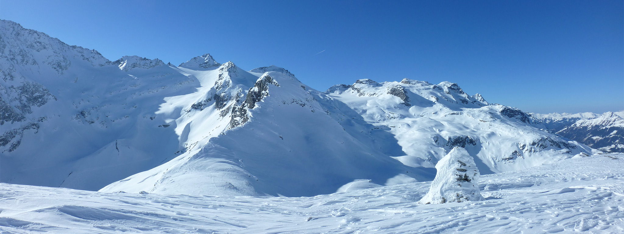 Am Gipfel des Stubacher Sonnblick ist die Aussicht auf die umliegenden Berge der Granatspitzgruppe bis zum Großvenediger, die genau gegenüber liegende Glocknergruppe nicht minder spektakulär, ja sogar der Gloßglockner mit Glocknerwand taucht hinter dem Eiskögele auf. Nun aber weiter zu den Schi und über den Gletscher hinüber zur Granatspitze. Viel Abfahrt gibts zwar nicht, dafür aber bald wieder auffellen, über den Sonnblickkees queren bis man unterhalb des Ostgrates erneut Schidepot macht. Mit Steigeisen und Pickel mache ich mich dann auf den kurzen, schönen Aufstieg und erreiche in knapp 10 Minuten den Gipfel der Granatspitze. Es ist gerade mal früher Nachmittag, weshalb ich mir überlege, eine andere Abfahrtsvariante anstelle der Aufstiegsroute zu probieren. Vom Gipfel aus hat man besten Einblick auf das Granatspitzkees, wo formschöne Abfahrtsspuren darauf hindeuten, dass hier mit viel Spass im Pulver zu rechnen ist. Und genauso war es dann auch: Bester Powder, eigene Spur, Spass!