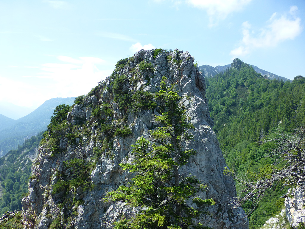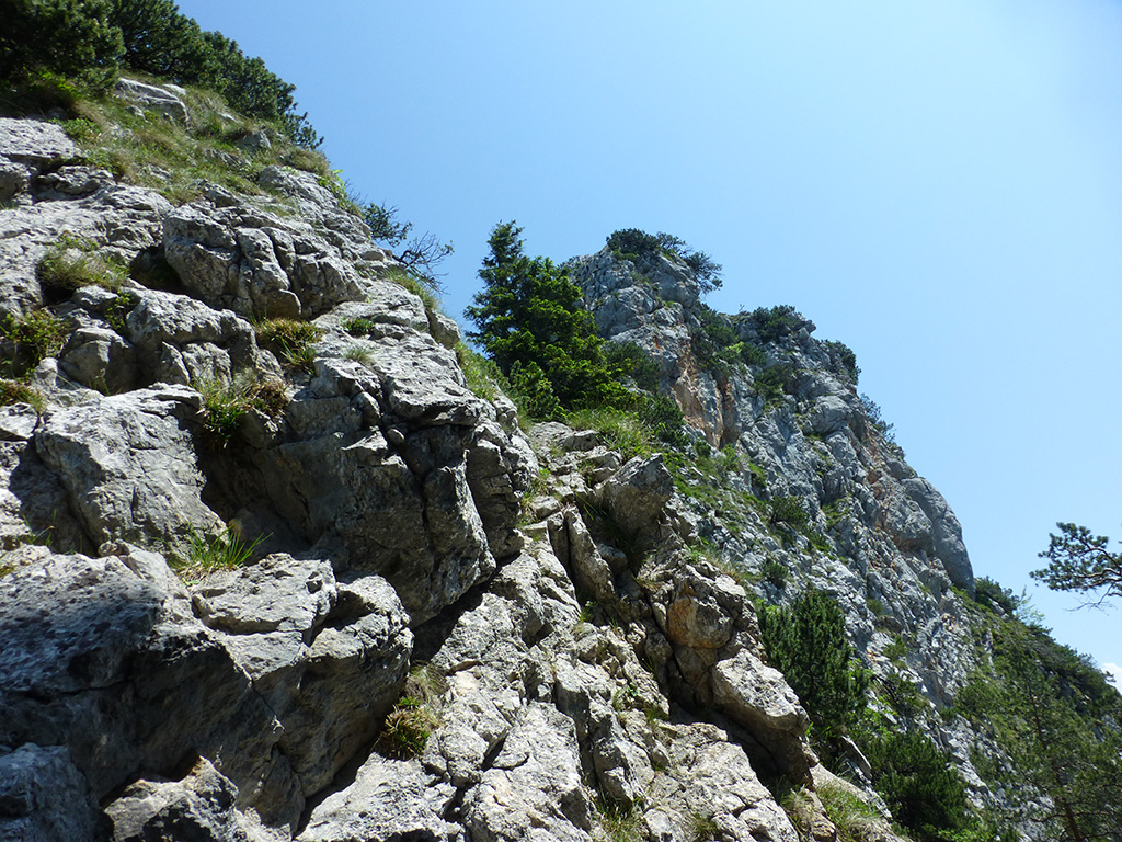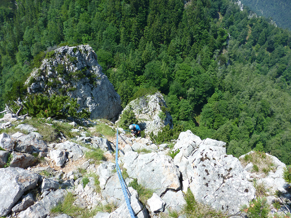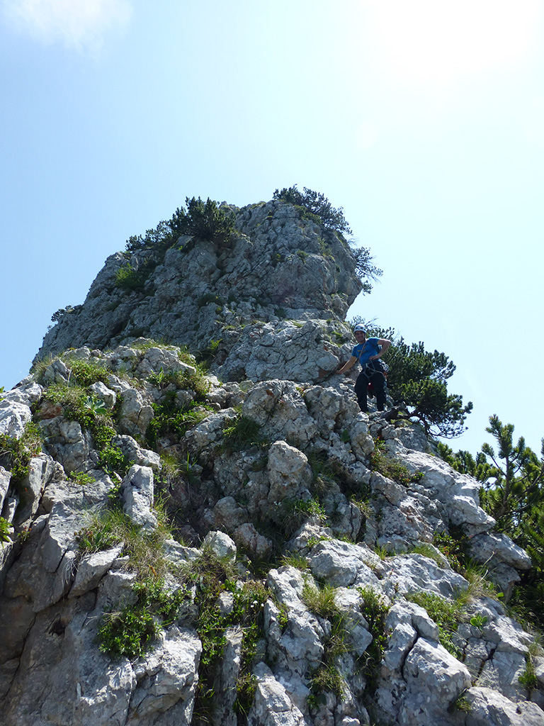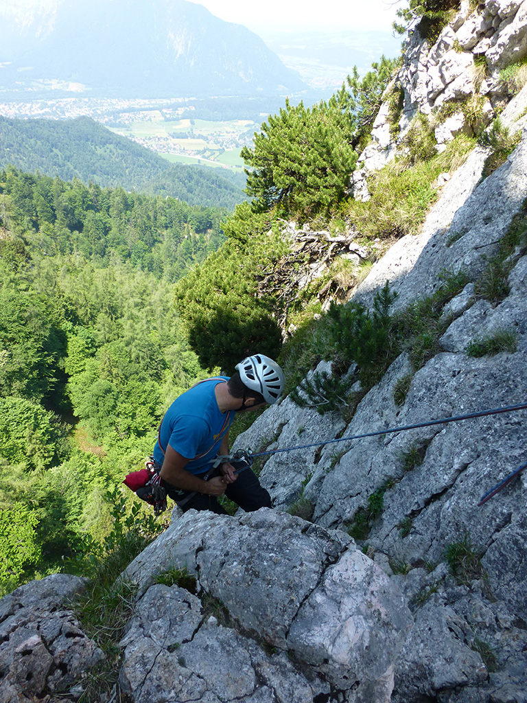 Nach der Kletterei am Signalkopf standen Hias und ich beim Abstieg bald wieder am Normalweg der zwischen Signalkopf und vorderem Rotofen vorbei führt. Das Wetter schien noch halbwegs stabil zu sein, also machten wir uns an den Aufstieg zum Gipfel des vorderen Rotofens, auch bekannt als großer Rotofenturm. Durch den fragilen, mit Gras durchsetzten Fels sollte man alles woran man sich festhält und worauf man steigt doppelt und dreifach prüfen. Darum zogen wir auch ein Abseilen dem Abklettern vor und standen nach einer kurzen Pause am Gipfel bald wieder auf den Wanderweg. Wir machten uns im Laufschritt auf den Weg zum Parkplatz, und unser Timing war im Endeffekt ganz gut, denn bei Bier und Essen im nächstgelegenen Gasthaus kam dann das prognostizierte Gewitter.