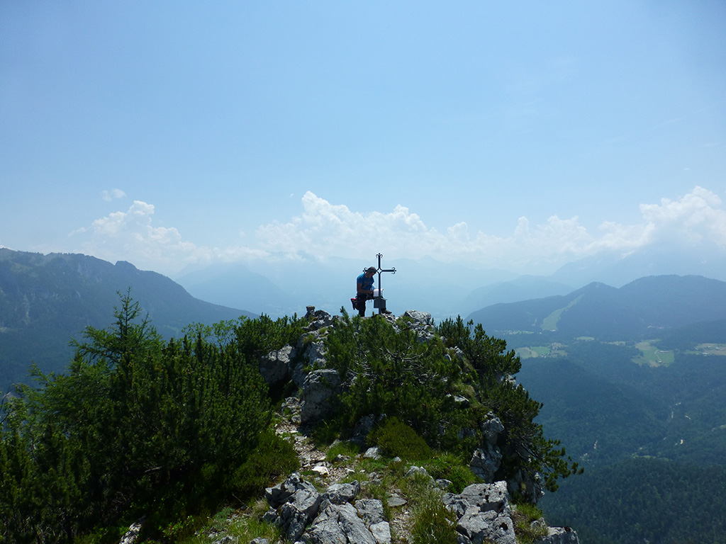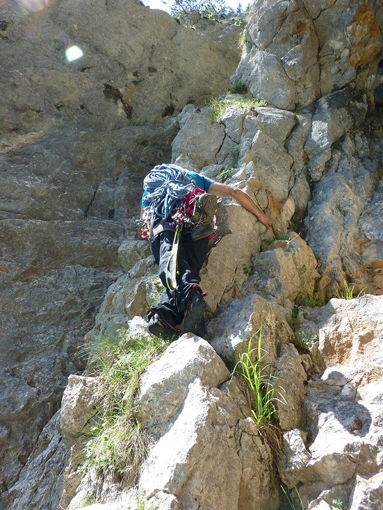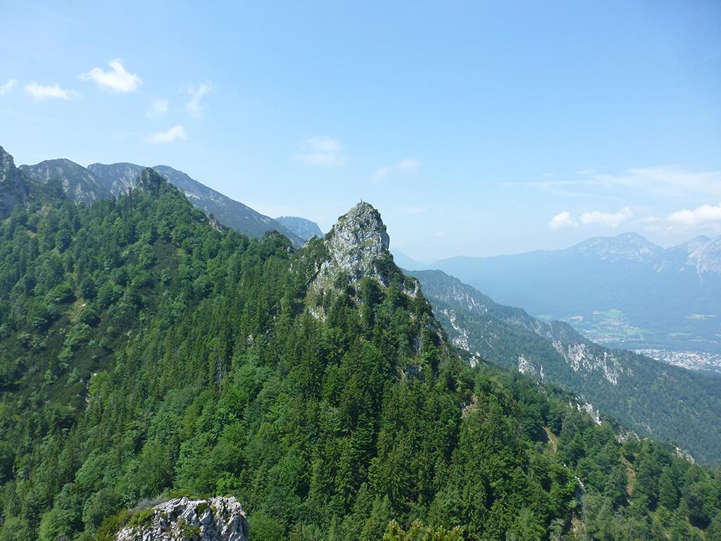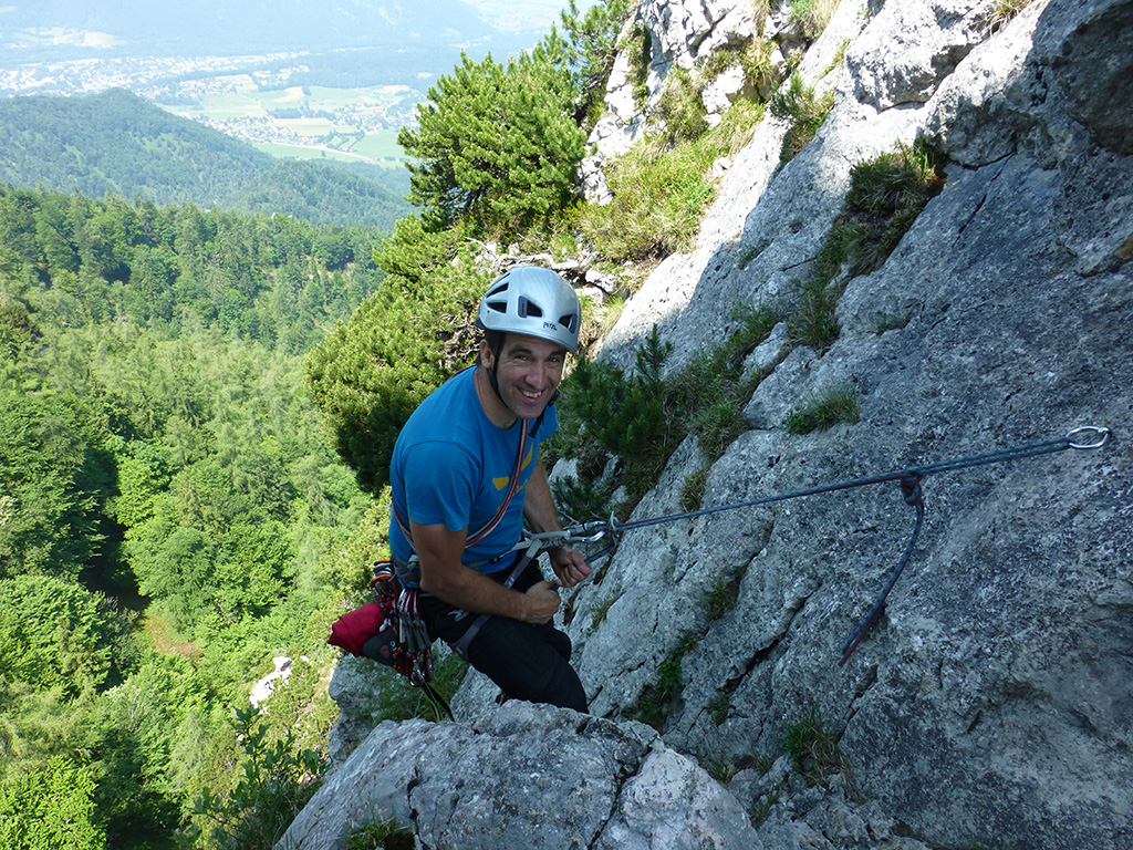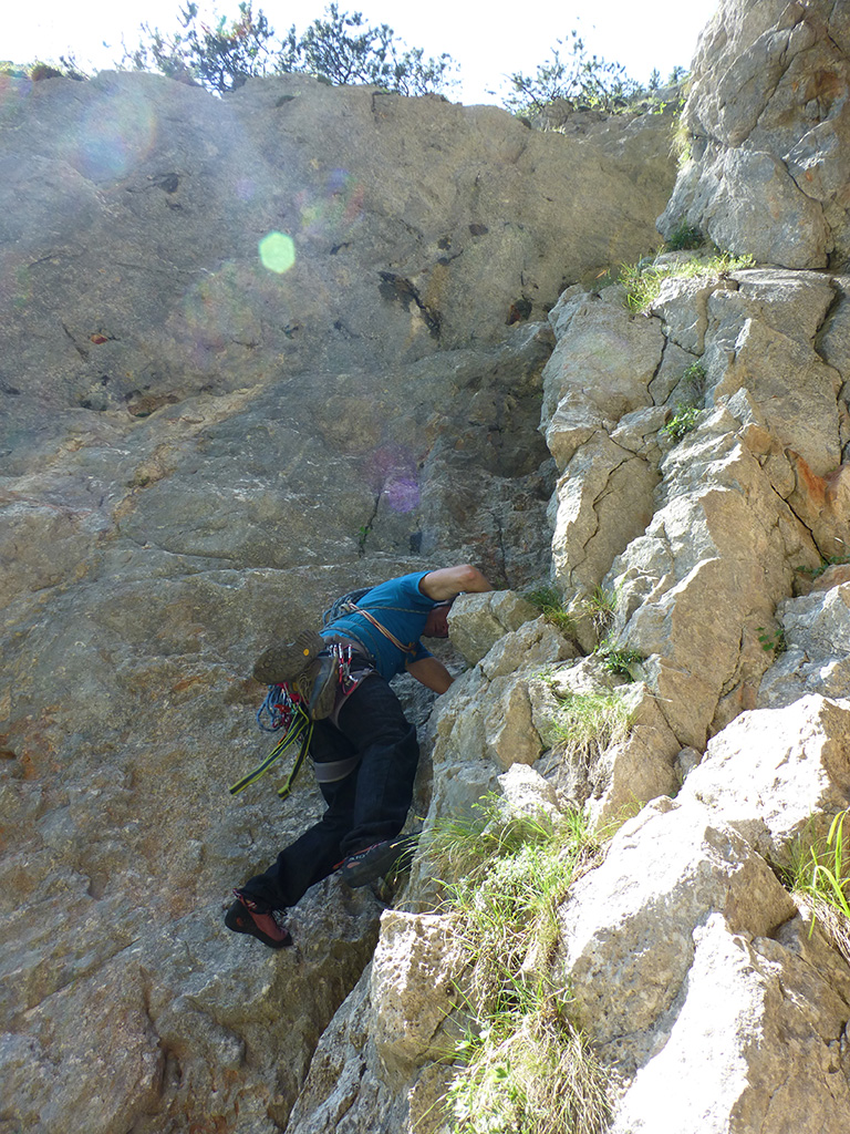 Nach der Kletterei am Signalkopf standen Hias und ich beim Abstieg bald wieder am Normalweg der zwischen Signalkopf und vorderem Rotofen vorbei führt. Das Wetter schien noch halbwegs stabil zu sein, also machten wir uns an den Aufstieg zum Gipfel des vorderen Rotofens, auch bekannt als großer Rotofenturm. Durch den fragilen, mit Gras durchsetzten Fels sollte man alles woran man sich festhält und worauf man steigt doppelt und dreifach prüfen. Darum zogen wir auch ein Abseilen dem Abklettern vor und standen nach einer kurzen Pause am Gipfel bald wieder auf den Wanderweg. Wir machten uns im Laufschritt auf den Weg zum Parkplatz, und unser Timing war im Endeffekt ganz gut, denn bei Bier und Essen im nächstgelegenen Gasthaus kam dann das prognostizierte Gewitter.
