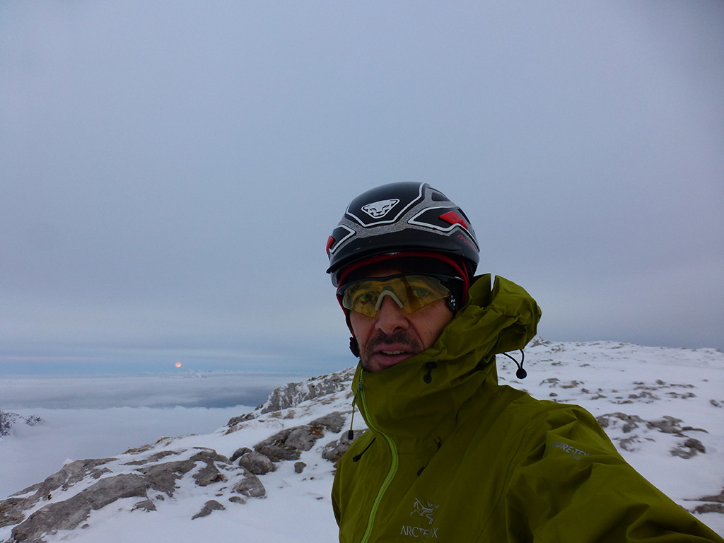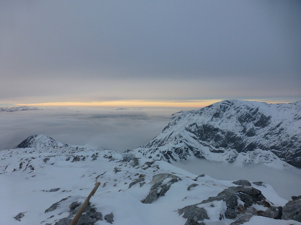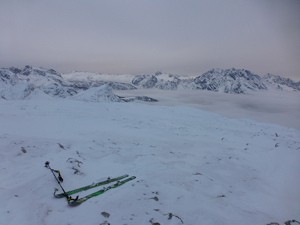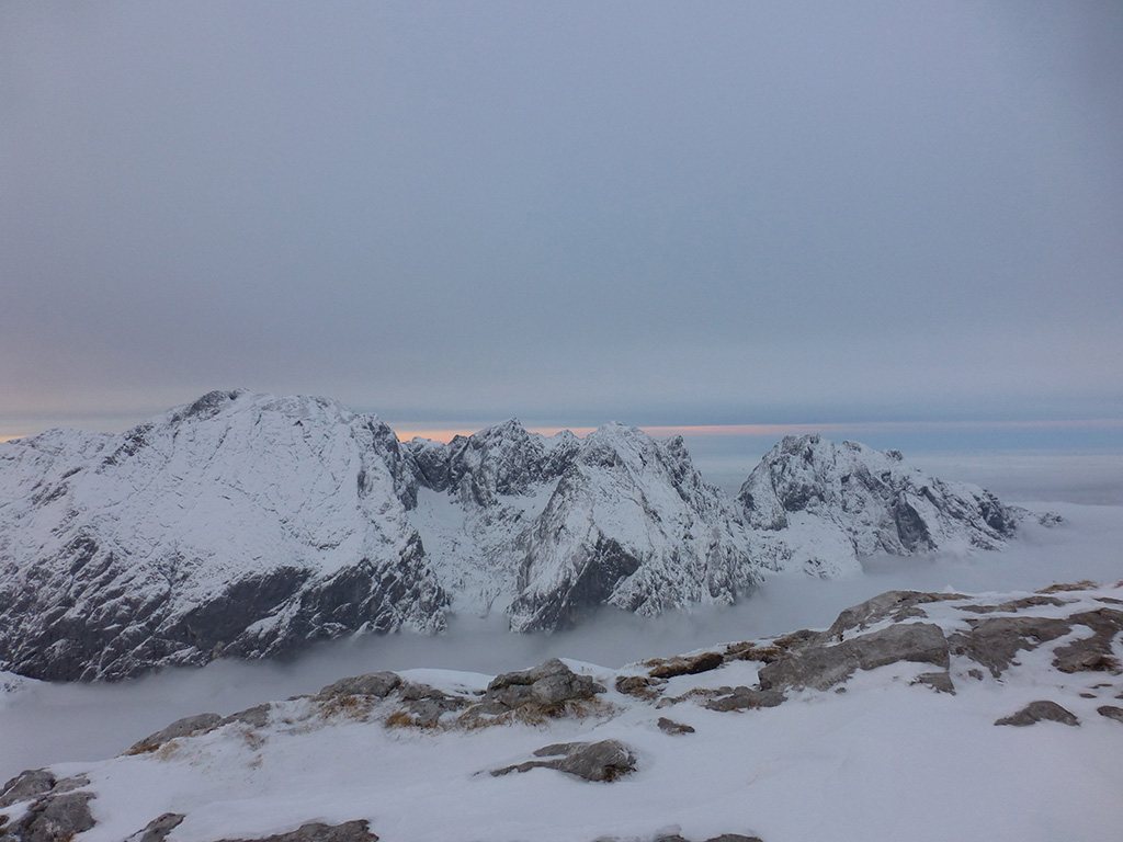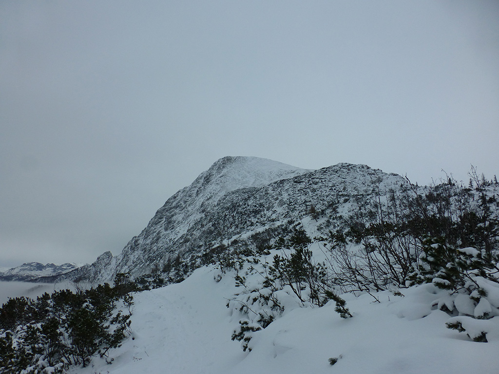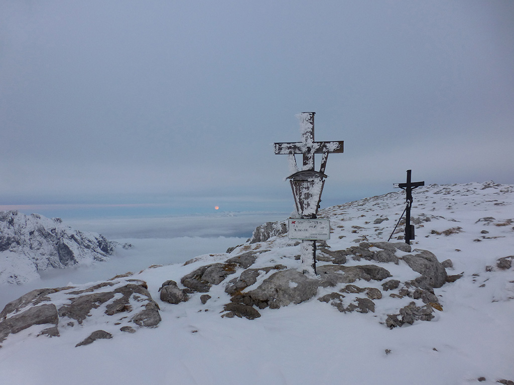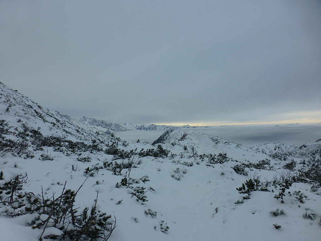 Es gab schon schönere Tage für eine Schitour, sicher auch welche wo üppigere Schneemengen die hiesigen Berge bedeckten, aber daheim die Zeit totschlagen, macht auch nicht so glücklich. Also dann lieber raus an die frische Luft, und mit Schi rauf auf einen Berg in der Umgebung. Es ist schon spät und ich entscheide mich für den Schneibstein, in der Hoffnung, dass zumindest ab Hinterbrand etwas mehr Schnee als im Tal liegt. Schnee gibts zwar nicht wirklich viel, für eine Schitour reichts aber allemal. Zu meiner Überraschung lasse ich bald den Nebel hinter mir, und der Schneibstein liegt wolkenlos vor mir, so wie fast alle umliegenden Berge, die aus dem Wolkenmeer herausragen. Am Gipfel genieße ich die gewaltige Stimmung beim Sonnenuntergang und bin gespannt, was die Abfahrt schließlich hergibt. Na ja, ohne Felskontakt ging das ganz nicht von statten, aber lässig wars auf alle Fälle. Hoffentlich gibts bald mehr Schnee, denn ich freue mich so richtig auf den Winter!