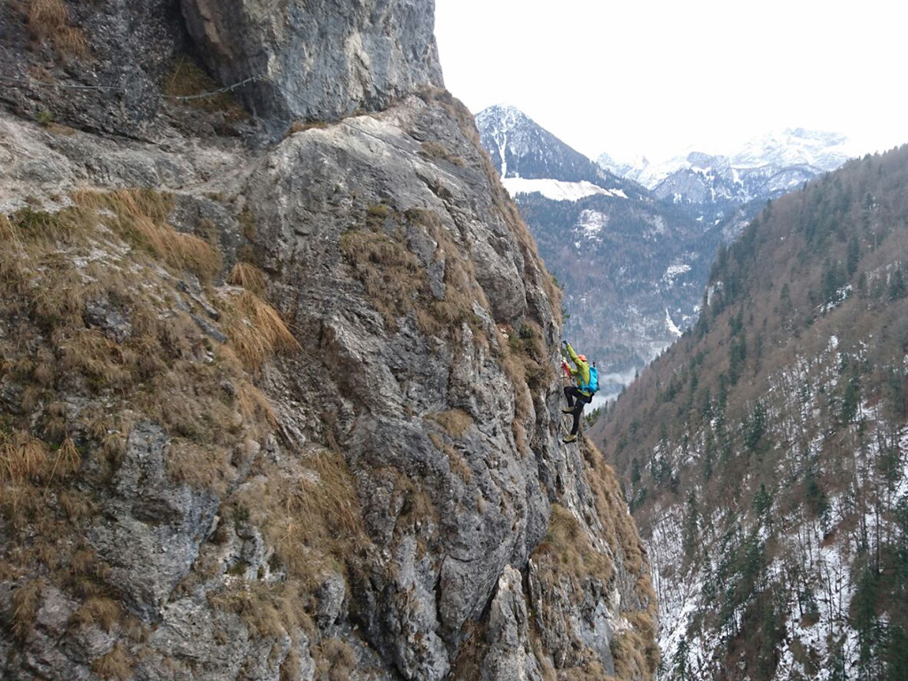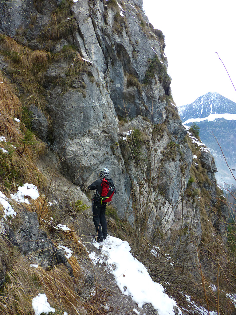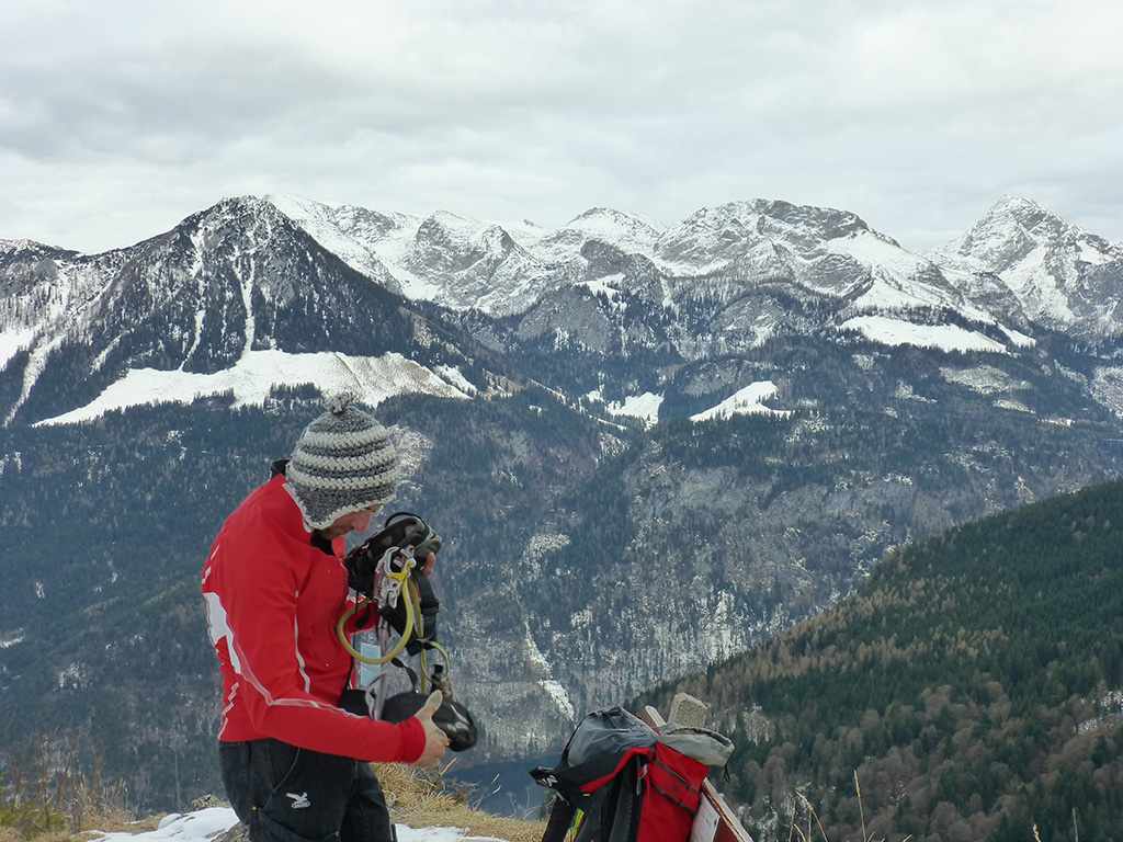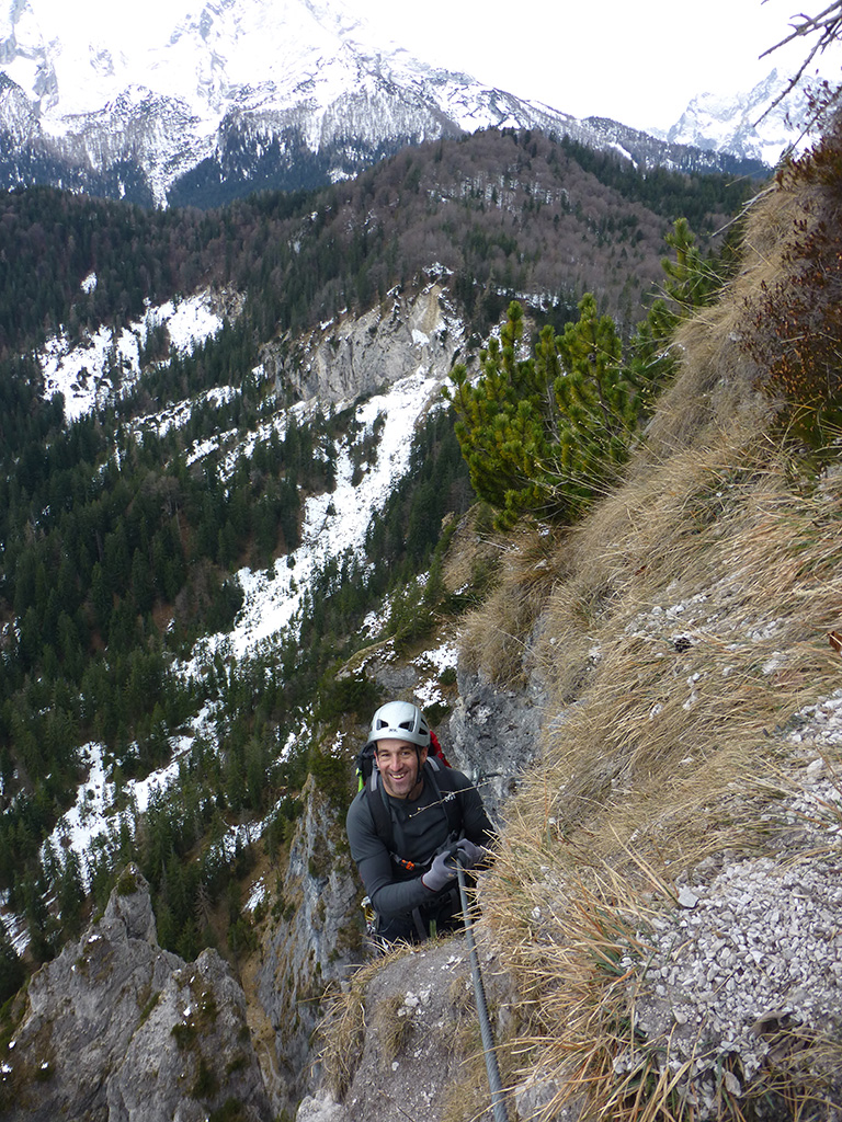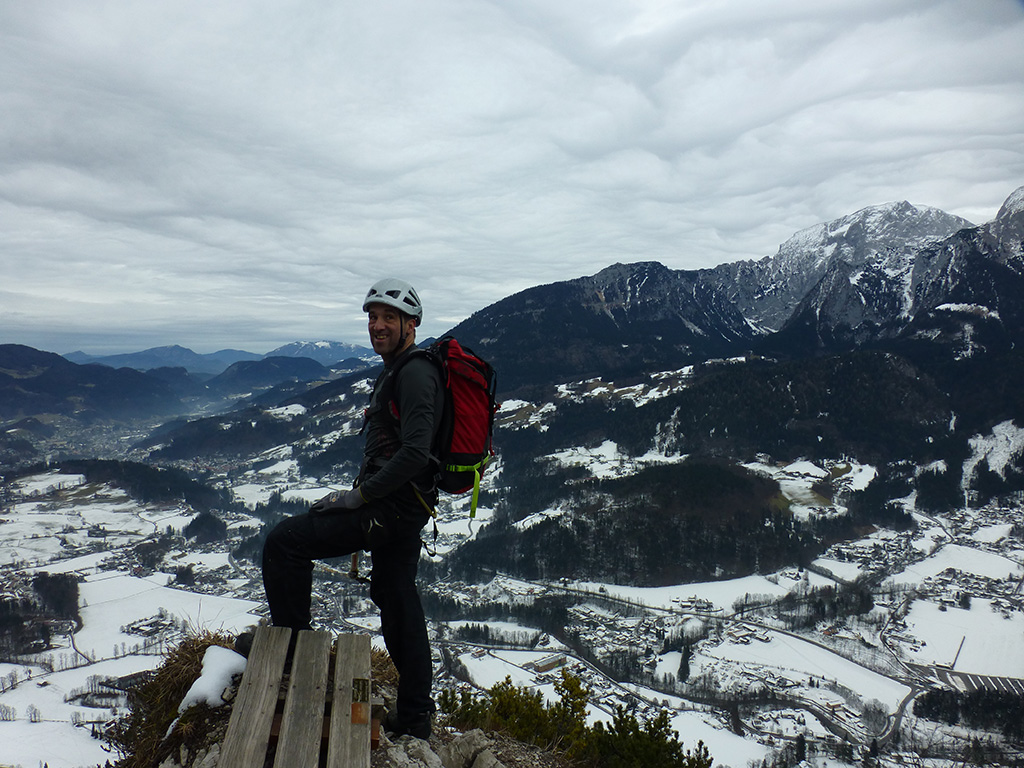 Ja ist den heute schon Weihnachten? Schaut fast so aus, aber eben nur fast, und wenn man sich die Berge so anschaut, dann hatten wir früher um diese Zeit schon bedeutend mehr Schnee. Zugegeben, es ist nicht überall völlig grün oder braun, und in den höher gelegenen Regionen hüllt eine hauchdünne Schicht alles in ein dezentes Weiß. Apropos grün: Hias und ich haben aufgrund der bescheidenen Schneesituation keine konkreten Pläne für den Nachmittag vor dem Weihnachstfest, also machen wir uns auf den Weg zum Grünstein Klettersteig, um wenigstens auf diese Art ein wenig frische Luft zu schnappen. Der Tag ist eher trübe, aber im Gegensatz zu so machen warmen Sommertagen am Wochenende sind wir heute beim Einstieg definitiv alleine. Bei den ersten paar Höhenmetern über die Variante Räuberleiter wird uns dann doch bald warm, und es kommt auch schnell Spass an der für diese Jahreszeit ungewöhnlichen sportlichen Betätigung auf. Gemütlich aber nicht langsam kommen wir am Steig voran und sind bald bei der Abzweigung zur Gipfelwand, einer weiteren Variante wo man zum Schluss doch nochmal hinhalten muss, bevor man beim Gipfelkreuz des Grünstein ankommt. Der Blick auf die umliegenden Gipfel wie Watzmann, Jenner, Fagstein, Kahlersberg usw. beweist leider, dass für Schitouren noch viel zu wenig Schnee liegt, aber die Hoffnung stirbt bekanntlich zuletzt. Mittlerweile wäre es fatal, die Qualität eines (Schitouren-)Winters an der Schneemenge zu Weihnachten zu bewerten.