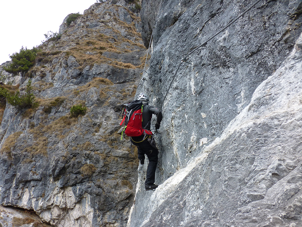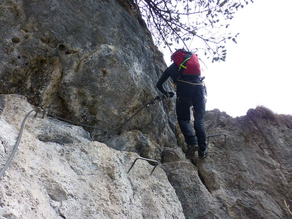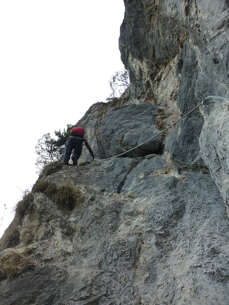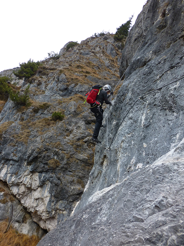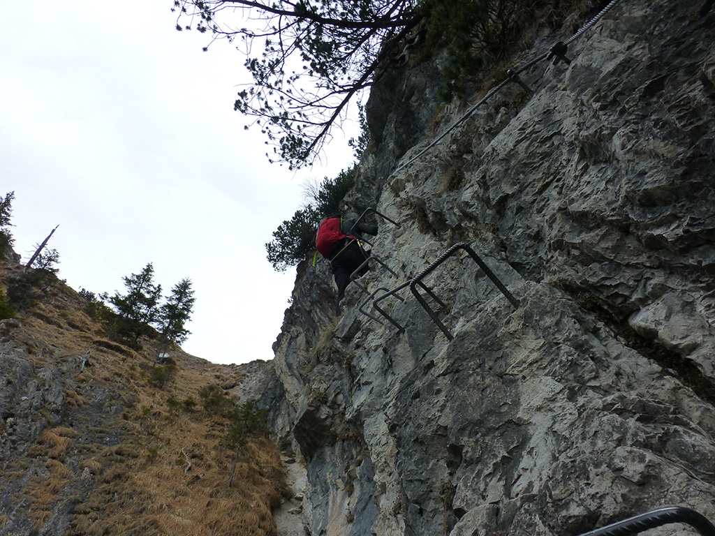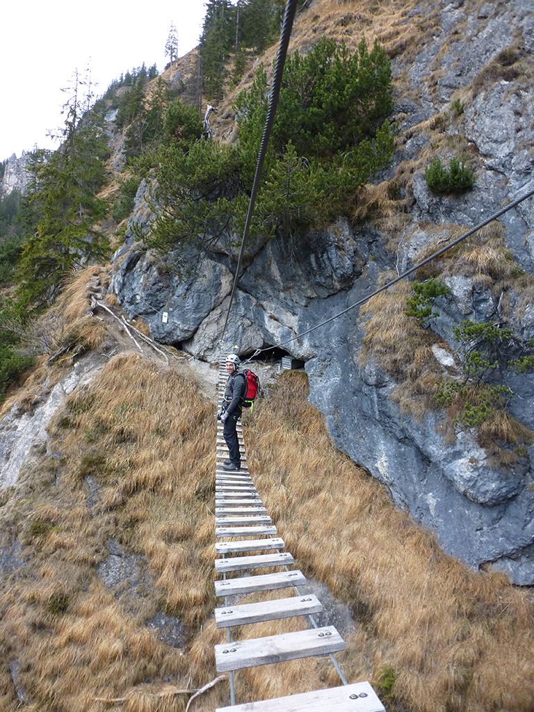 Ja ist den heute schon Weihnachten? Schaut fast so aus, aber eben nur fast, und wenn man sich die Berge so anschaut, dann hatten wir früher um diese Zeit schon bedeutend mehr Schnee. Zugegeben, es ist nicht überall völlig grün oder braun, und in den höher gelegenen Regionen hüllt eine hauchdünne Schicht alles in ein dezentes Weiß. Apropos grün: Hias und ich haben aufgrund der bescheidenen Schneesituation keine konkreten Pläne für den Nachmittag vor dem Weihnachstfest, also machen wir uns auf den Weg zum Grünstein Klettersteig, um wenigstens auf diese Art ein wenig frische Luft zu schnappen. Der Tag ist eher trübe, aber im Gegensatz zu so machen warmen Sommertagen am Wochenende sind wir heute beim Einstieg definitiv alleine. Bei den ersten paar Höhenmetern über die Variante Räuberleiter wird uns dann doch bald warm, und es kommt auch schnell Spass an der für diese Jahreszeit ungewöhnlichen sportlichen Betätigung auf. Gemütlich aber nicht langsam kommen wir am Steig voran und sind bald bei der Abzweigung zur Gipfelwand, einer weiteren Variante wo man zum Schluss doch nochmal hinhalten muss, bevor man beim Gipfelkreuz des Grünstein ankommt. Der Blick auf die umliegenden Gipfel wie Watzmann, Jenner, Fagstein, Kahlersberg usw. beweist leider, dass für Schitouren noch viel zu wenig Schnee liegt, aber die Hoffnung stirbt bekanntlich zuletzt. Mittlerweile wäre es fatal, die Qualität eines (Schitouren-)Winters an der Schneemenge zu Weihnachten zu bewerten.