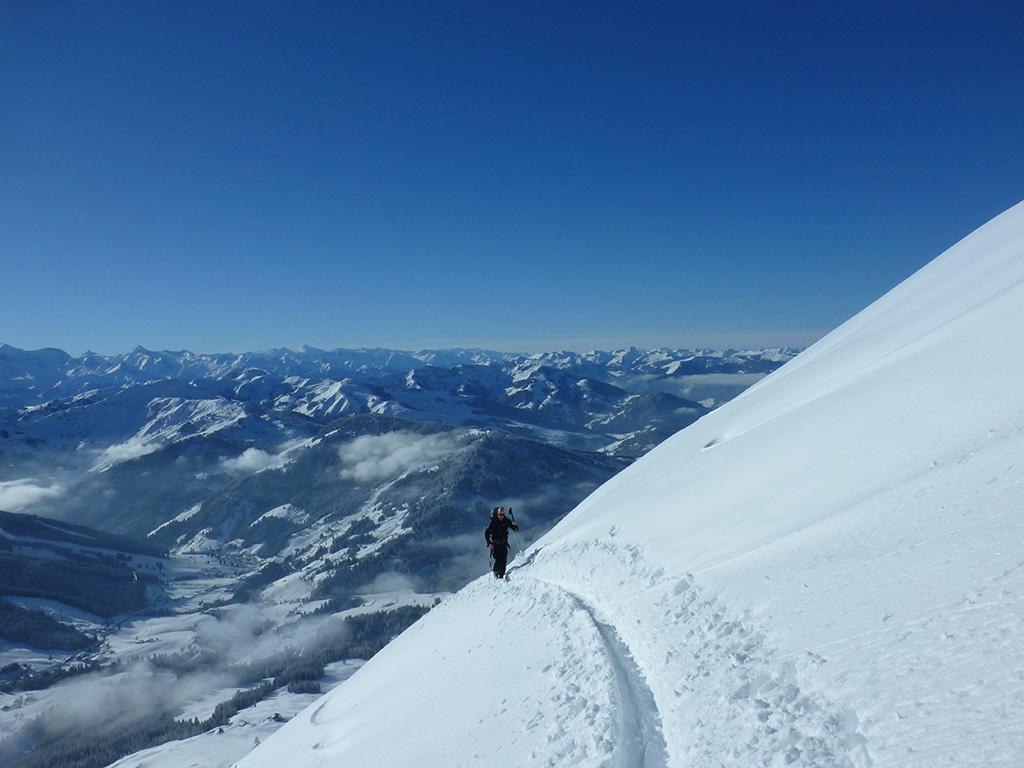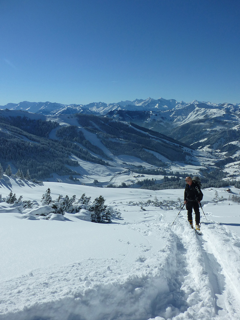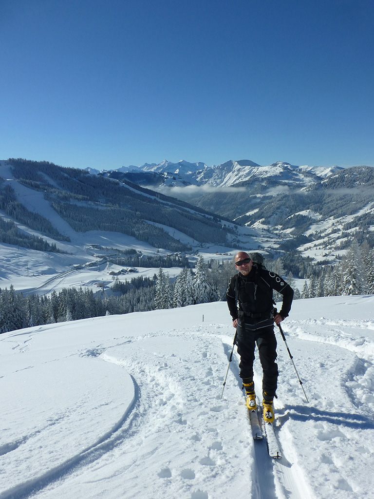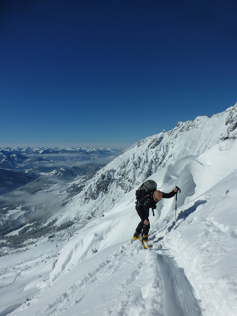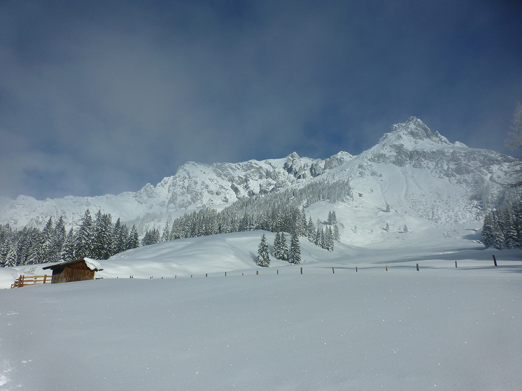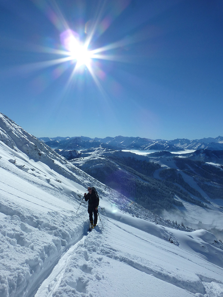 Was sagt man den dazu: Chris ist voll motiviert für eine Schitour, und hat sich dafür auch einen perfekten Tag ausgesucht! Strahlender Sonnenschein, winterliche Temperaturen, Neuschnee, alles was man für einen super Tour im Schnee braucht. Wir fahren am Vormittag über Mühlbach am Hochkönig hinauf auf den Dientener Sattel und wollen über die Erichhütte auf die Taghaubenscharte gehen. Klar, dass wir am späten Vormittag nicht mehr die ersten Tourengeher sind, die auf diese Idee gekommen sind. Aber es stört auch nicht besonders, dass wir uns den Aufstieg aufgrund einer ausgezeichnet angelegten Aufstiegsspur erleichtern. Chris macht auch ohne Snowboard dafür mit Schi unter den Füßen einen gute Figur und wir genießen die fast unwirkliche Winterlandschaft. Zwischen Grandlspitz und Taghaube gelangen wir in stetig weiter nach oben bis schließlich die Rinne hinunter zum Birgkar darauf hindeutet, dass wir die Taghaubenscharte, und somit das heutige Ziel unserer Schitour erreicht haben. Nach einer kurzen Pause, einer Kleinigkeit zu essen und trinken, dem Bewundern der umliegenden Gipfel wie Grandlspitz, Hochkönig und Taghaube machen wir uns an die vielversprechende Abfahrt im Pulverschnee. Nur wenige Spuren ziehen sich bereits durch den frischen Neuschnee, wodurch genung Platz für die eigene Abfahrtsspur bleibt. Spaß pur, super Bedingungen, und wir genießen unsere Schwünge im kalten Schnee. Viel zu schnell sind wir dann leider wieder bei der Erichhütte angekommen und werfen einen letzten Blick zurück. Was für eine super Tour, endlich ist der Winter auch bei uns angekommen. So kann es gerne weitergehen und ich hoffe, Chris is bald wieder mit mir am Start.