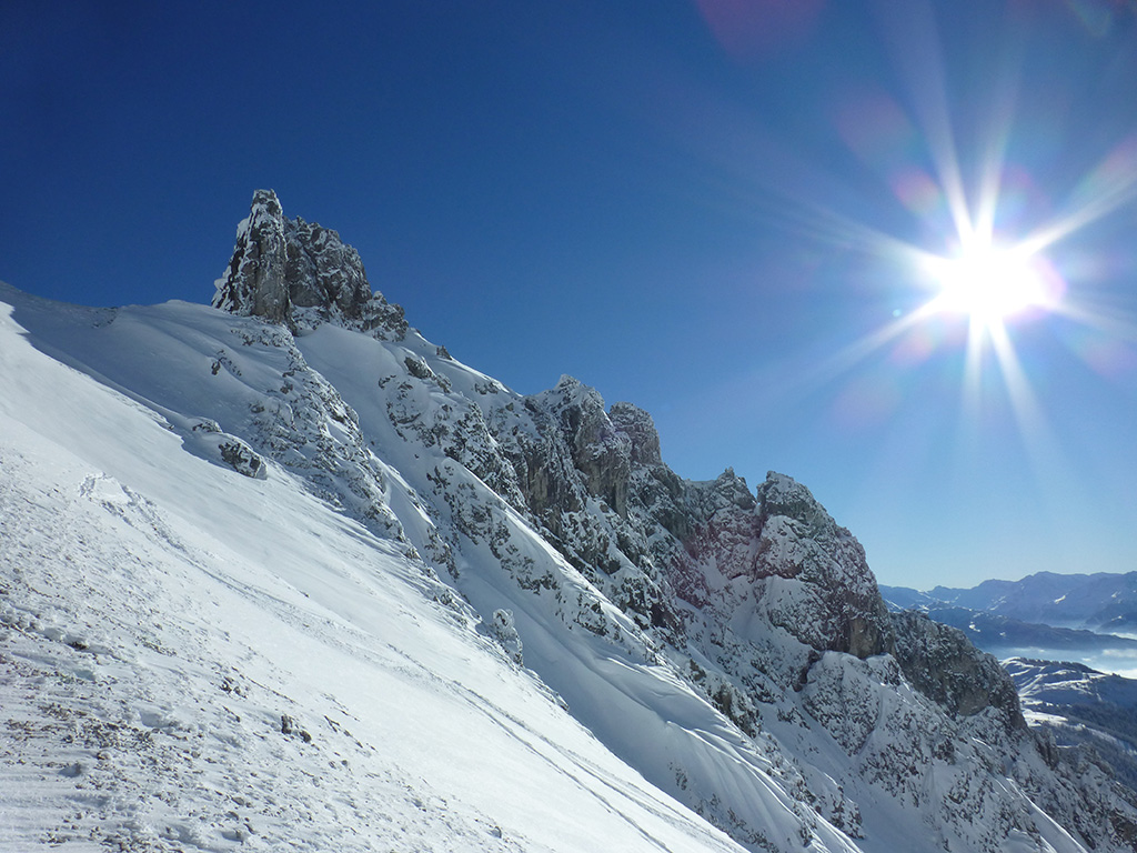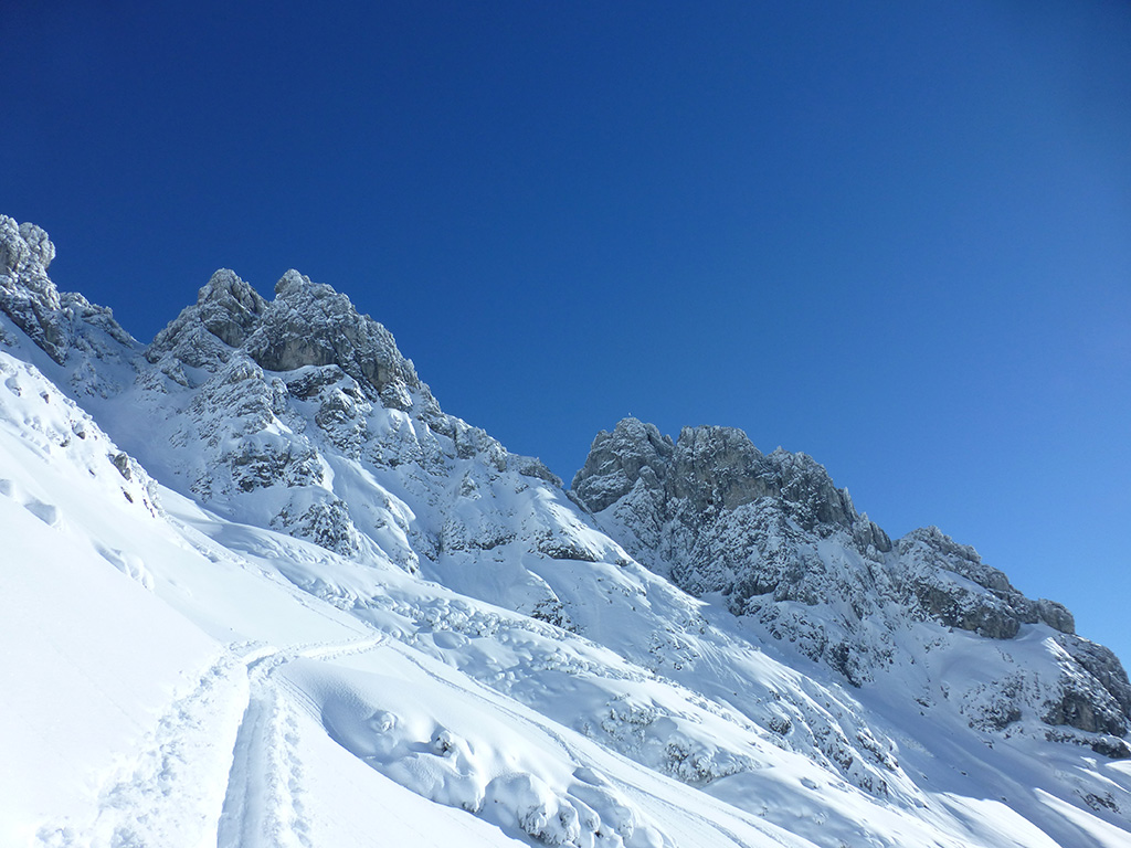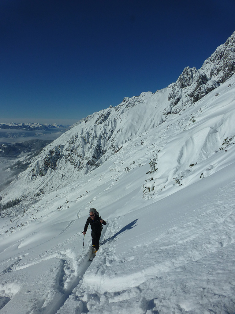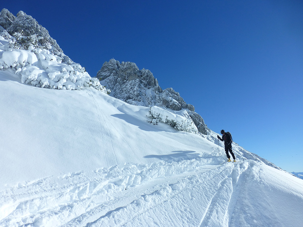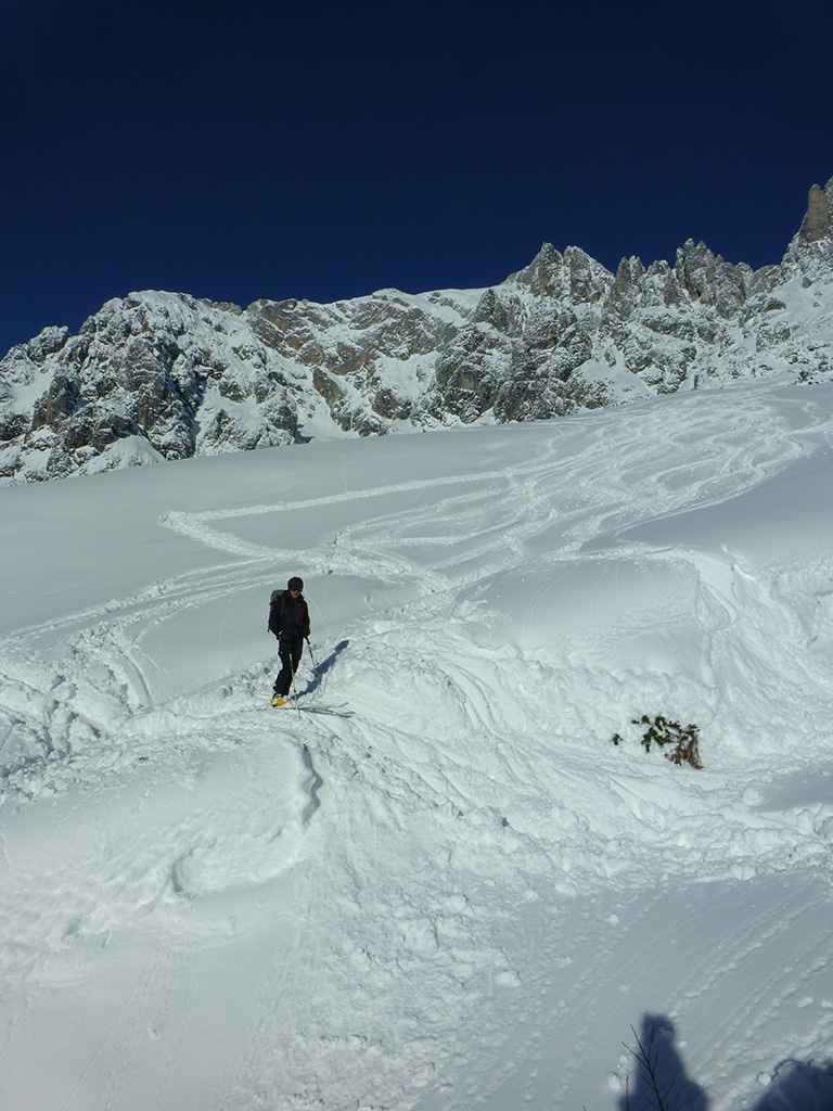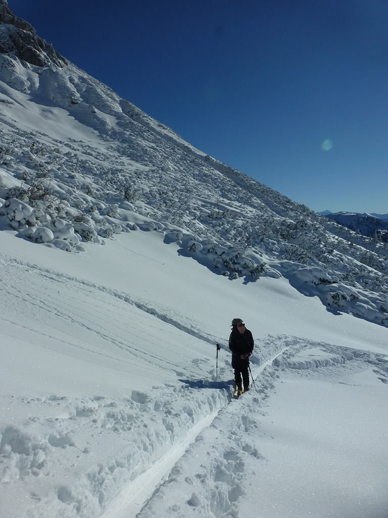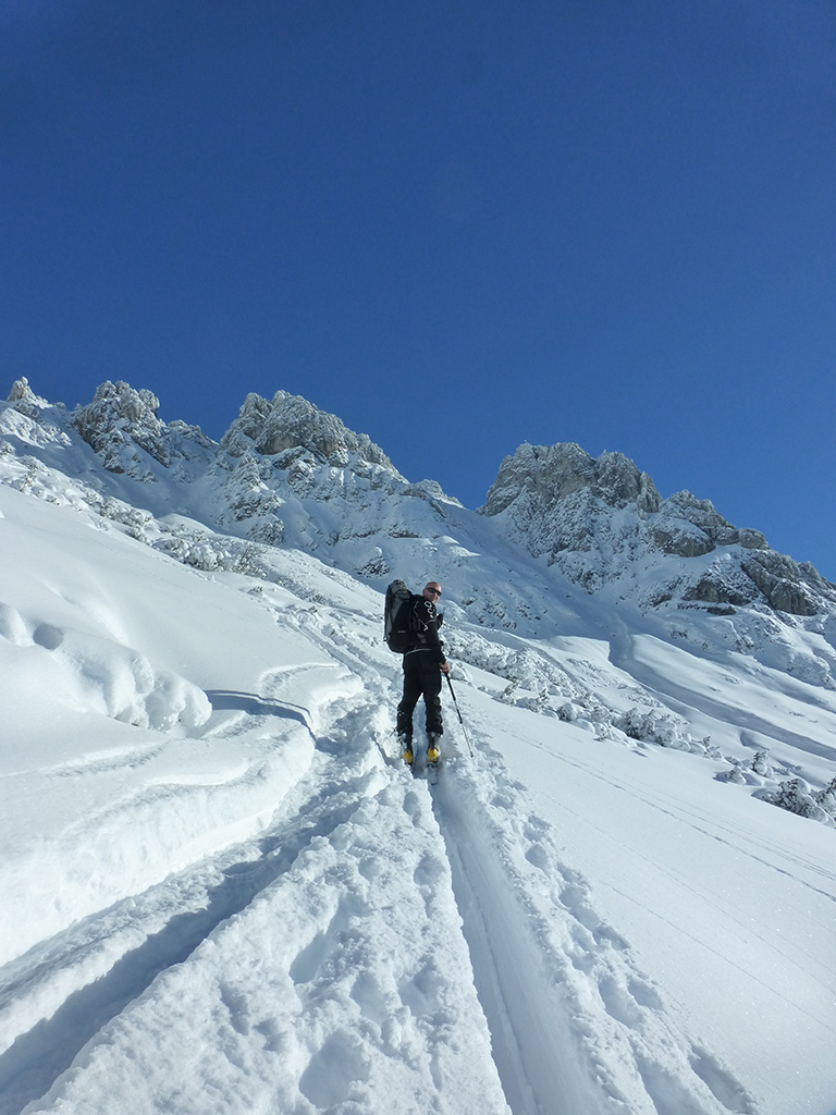Was sagt man den dazu: Chris ist voll motiviert für eine Schitour, und hat sich dafür auch einen perfekten Tag ausgesucht! Strahlender Sonnenschein, winterliche Temperaturen, Neuschnee, alles was man für einen super Tour im Schnee braucht. Wir fahren am Vormittag über Mühlbach am Hochkönig hinauf auf den Dientener Sattel und wollen über die Erichhütte auf die Taghaubenscharte gehen. Klar, dass wir am späten Vormittag nicht mehr die ersten Tourengeher sind, die auf diese Idee gekommen sind. Aber es stört auch nicht besonders, dass wir uns den Aufstieg aufgrund einer ausgezeichnet angelegten Aufstiegsspur erleichtern. Chris macht auch ohne Snowboard dafür mit Schi unter den Füßen einen gute Figur und wir genießen die fast unwirkliche Winterlandschaft. Zwischen Grandlspitz und Taghaube gelangen wir in stetig weiter nach oben bis schließlich die Rinne hinunter zum Birgkar darauf hindeutet, dass wir die Taghaubenscharte, und somit das heutige Ziel unserer Schitour erreicht haben. Nach einer kurzen Pause, einer Kleinigkeit zu essen und trinken, dem Bewundern der umliegenden Gipfel wie Grandlspitz, Hochkönig und Taghaube machen wir uns an die vielversprechende Abfahrt im Pulverschnee. Nur wenige Spuren ziehen sich bereits durch den frischen Neuschnee, wodurch genung Platz für die eigene Abfahrtsspur bleibt. Spaß pur, super Bedingungen, und wir genießen unsere Schwünge im kalten Schnee. Viel zu schnell sind wir dann leider wieder bei der Erichhütte angekommen und werfen einen letzten Blick zurück. Was für eine super Tour, endlich ist der Winter auch bei uns angekommen. So kann es gerne weitergehen und ich hoffe, Chris is bald wieder mit mir am Start.