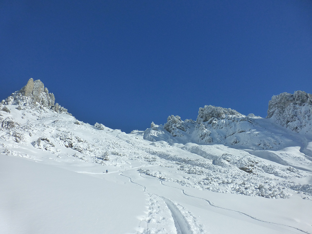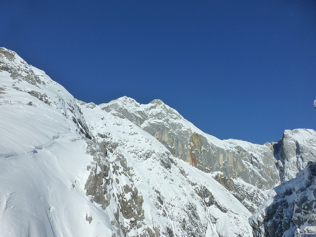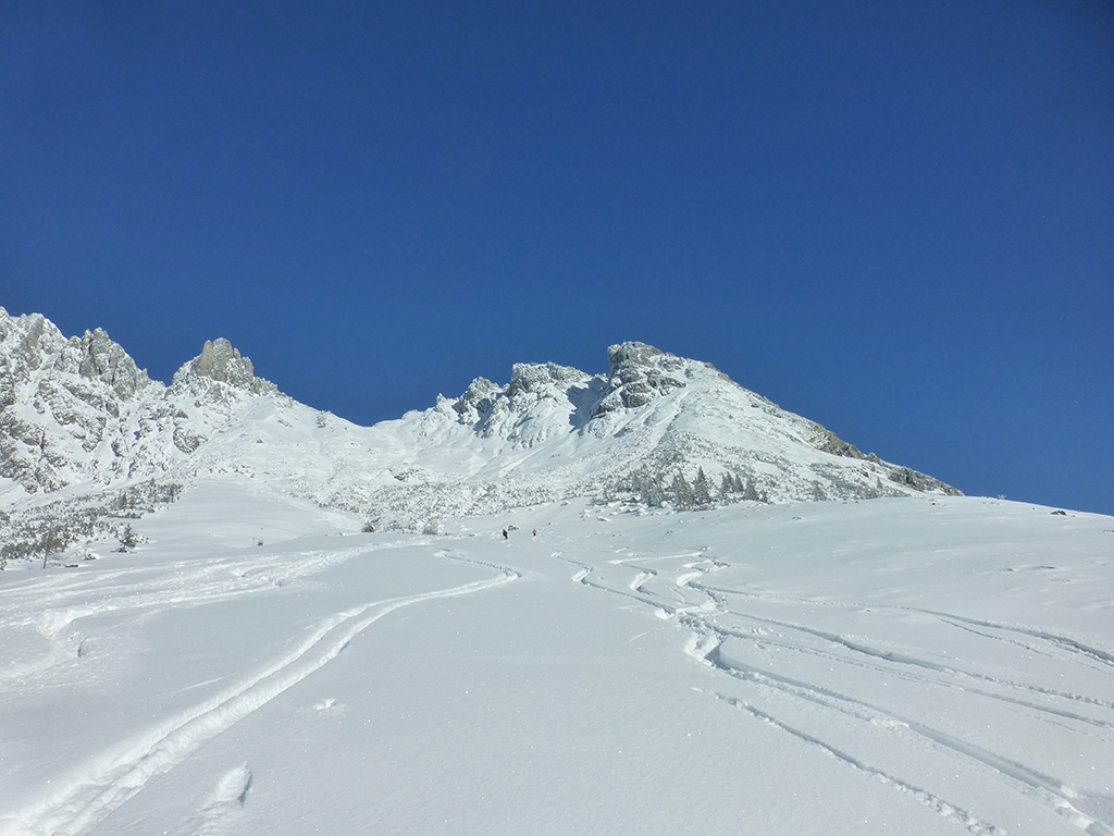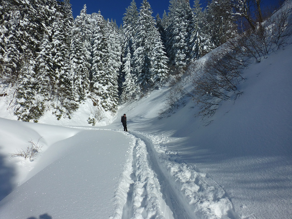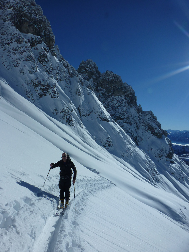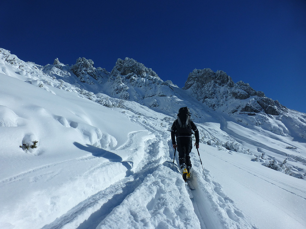 Was sagt man den dazu: Chris ist voll motiviert für eine Schitour, und hat sich dafür auch einen perfekten Tag ausgesucht! Strahlender Sonnenschein, winterliche Temperaturen, Neuschnee, alles was man für einen super Tour im Schnee braucht. Wir fahren am Vormittag über Mühlbach am Hochkönig hinauf auf den Dientener Sattel und wollen über die Erichhütte auf die Taghaubenscharte gehen. Klar, dass wir am späten Vormittag nicht mehr die ersten Tourengeher sind, die auf diese Idee gekommen sind. Aber es stört auch nicht besonders, dass wir uns den Aufstieg aufgrund einer ausgezeichnet angelegten Aufstiegsspur erleichtern. Chris macht auch ohne Snowboard dafür mit Schi unter den Füßen einen gute Figur und wir genießen die fast unwirkliche Winterlandschaft. Zwischen Grandlspitz und Taghaube gelangen wir in stetig weiter nach oben bis schließlich die Rinne hinunter zum Birgkar darauf hindeutet, dass wir die Taghaubenscharte, und somit das heutige Ziel unserer Schitour erreicht haben. Nach einer kurzen Pause, einer Kleinigkeit zu essen und trinken, dem Bewundern der umliegenden Gipfel wie Grandlspitz, Hochkönig und Taghaube machen wir uns an die vielversprechende Abfahrt im Pulverschnee. Nur wenige Spuren ziehen sich bereits durch den frischen Neuschnee, wodurch genung Platz für die eigene Abfahrtsspur bleibt. Spaß pur, super Bedingungen, und wir genießen unsere Schwünge im kalten Schnee. Viel zu schnell sind wir dann leider wieder bei der Erichhütte angekommen und werfen einen letzten Blick zurück. Was für eine super Tour, endlich ist der Winter auch bei uns angekommen. So kann es gerne weitergehen und ich hoffe, Chris is bald wieder mit mir am Start.