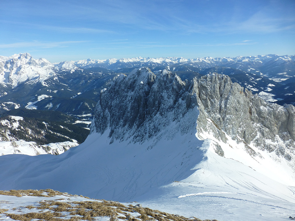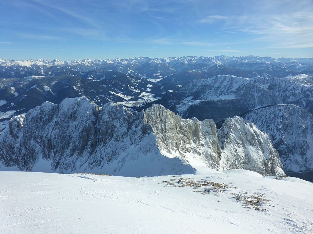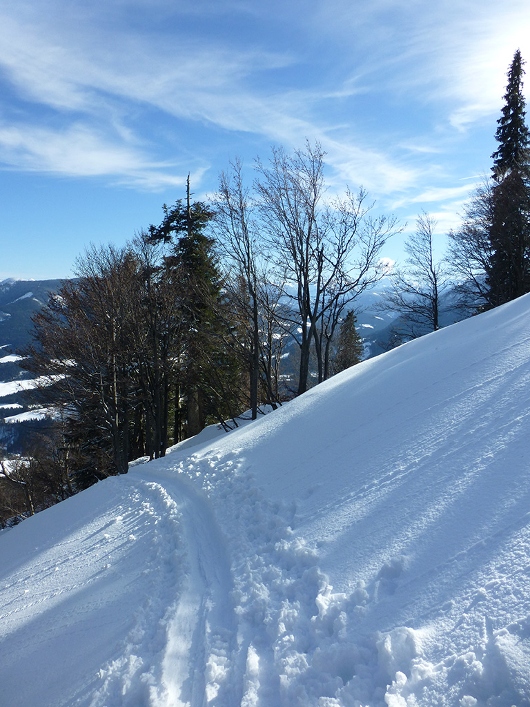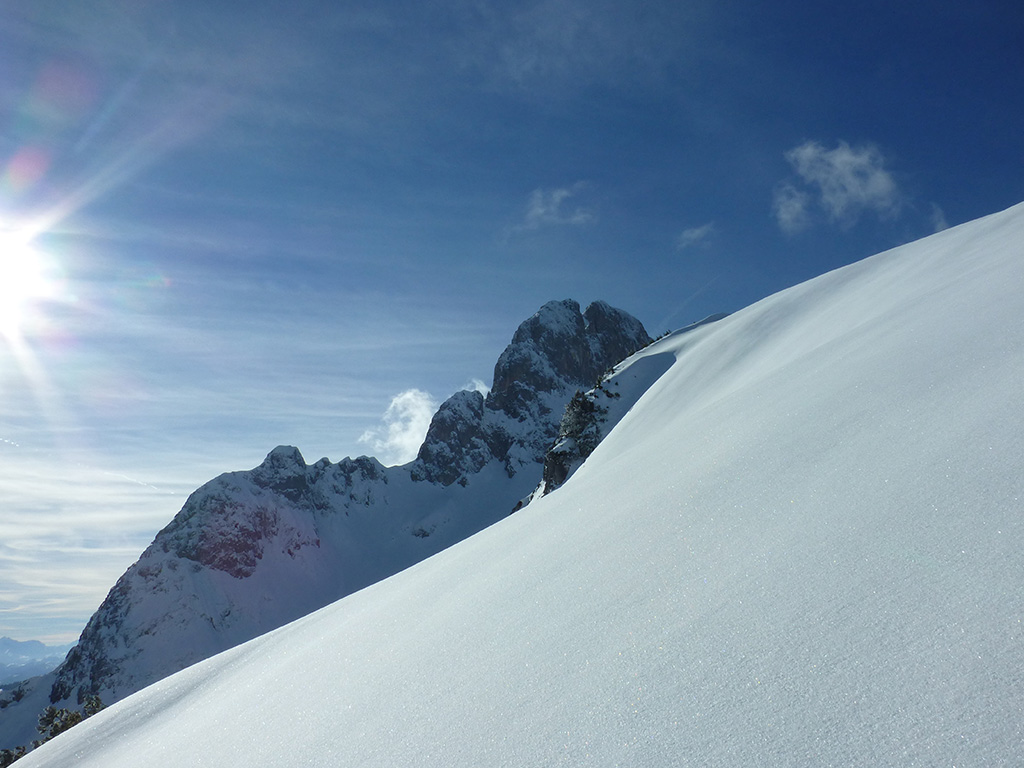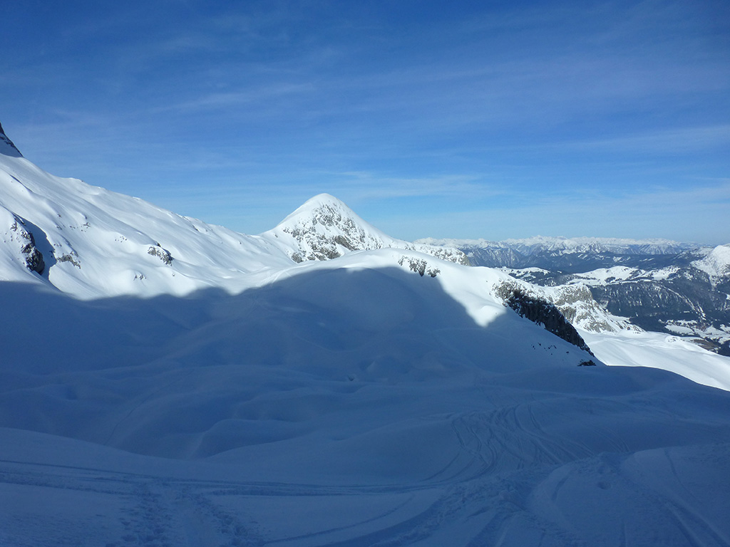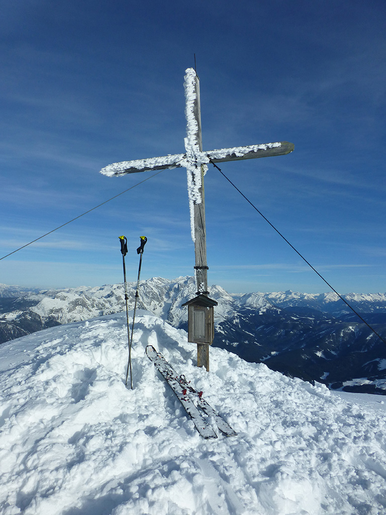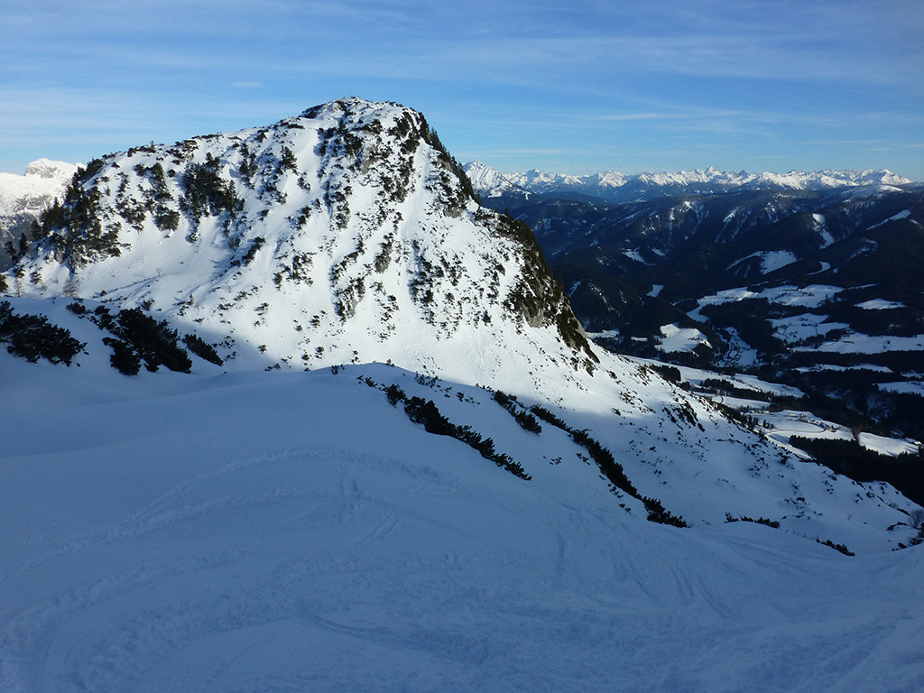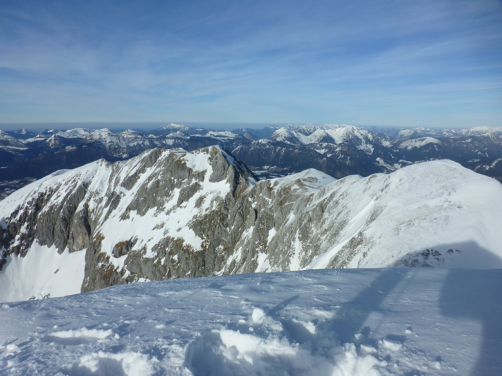Es ist schon recht spät, als ich mich endlich aus der Arbeit veraschieden kann. Aber nachdem es draußen mittlerweile lange genung hell ist, geht sich schon noch eine kleine Schitour im Tennengebirge aus. Vor fast genau einem Jahr wollte ich vom Lammertal aus auf den Hochkarfelderkopf gehen, was jedoch durch Schneefall und null Sicht keinen Erfolg hatte. Ich brach die Tour etwas oberhalb der Jagdhütte ab. Heute will ich es nochmals versuchen, dieses Mal aber bei herrlichem Sonnenschein, super Schnee und mit gut angeleger Aufstiegsspur. Der gut konservierte Pulverschnee versprach großes Vergnügen bei der Abfahrt, ebenso wie noch wenig verspurte Hänge und Flanken. Nach knapp zwei Stunden Aufstieg stehe ich vor dem Gipfelkreuz des Hochkarfelderkopfs. Die Aussicht ist phänomenal, die Stimmung einmalig, und ich genieße die Ruhe nach einer anstrengenden Arbeitswoche. Die Abfahrt ist traumhaft, und auf der Scharte vor der Riffl überlege ich mir kurz in südwestlicher Richtung zum sogenannten „Scharfen Steig“ abzufahren. Heute nicht, diese Variante werde ich mir ein anderes Mal, und vor allem nicht erst am späten Nachmittag ansehen. Anstelle der Aufstiegsroute via Jagdhütte fahre ich über den Paßruckgraben ab, zumindestens soweit möglich. Die letzten Höhenmeter bis zur Forststrasse lege ich mangels Schnee zu Fuß zurück, dann gehts wieder auf Schi hinunter zum Parkplatz. Eine super Tour die unbedingt wiederholt werden muss!