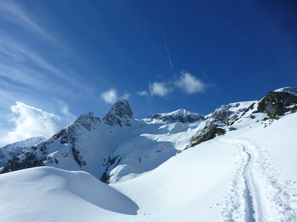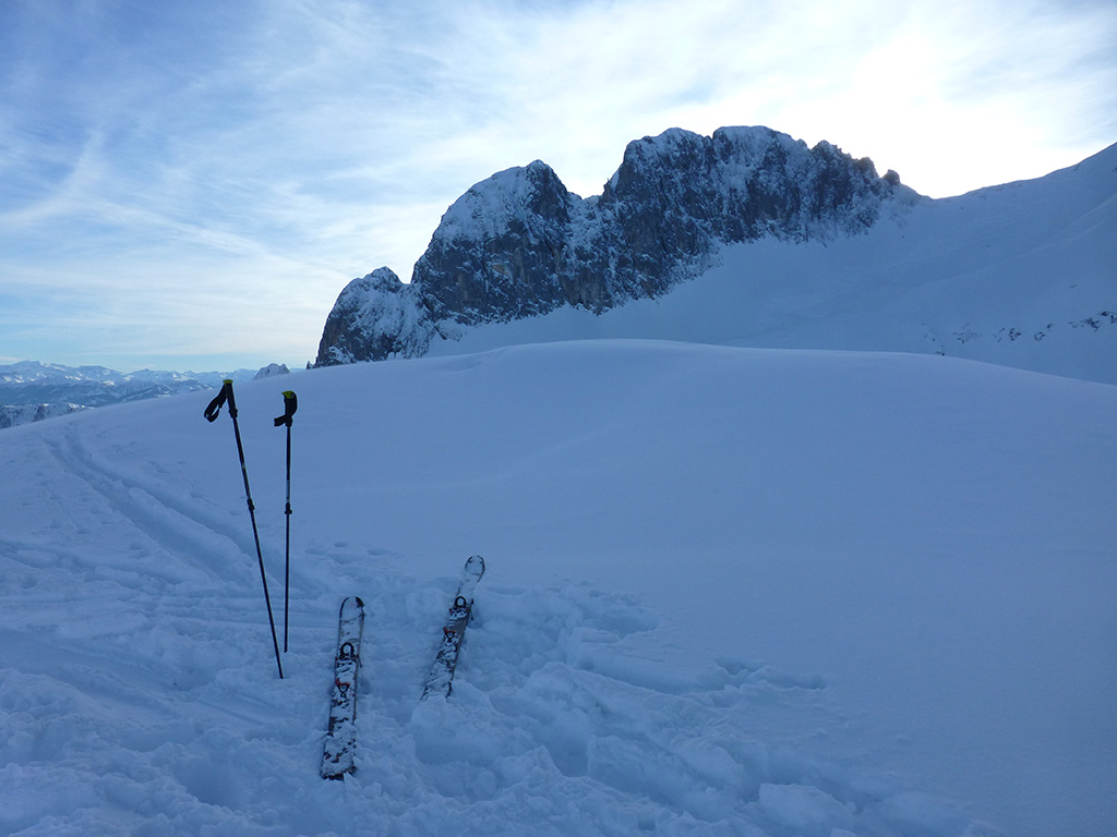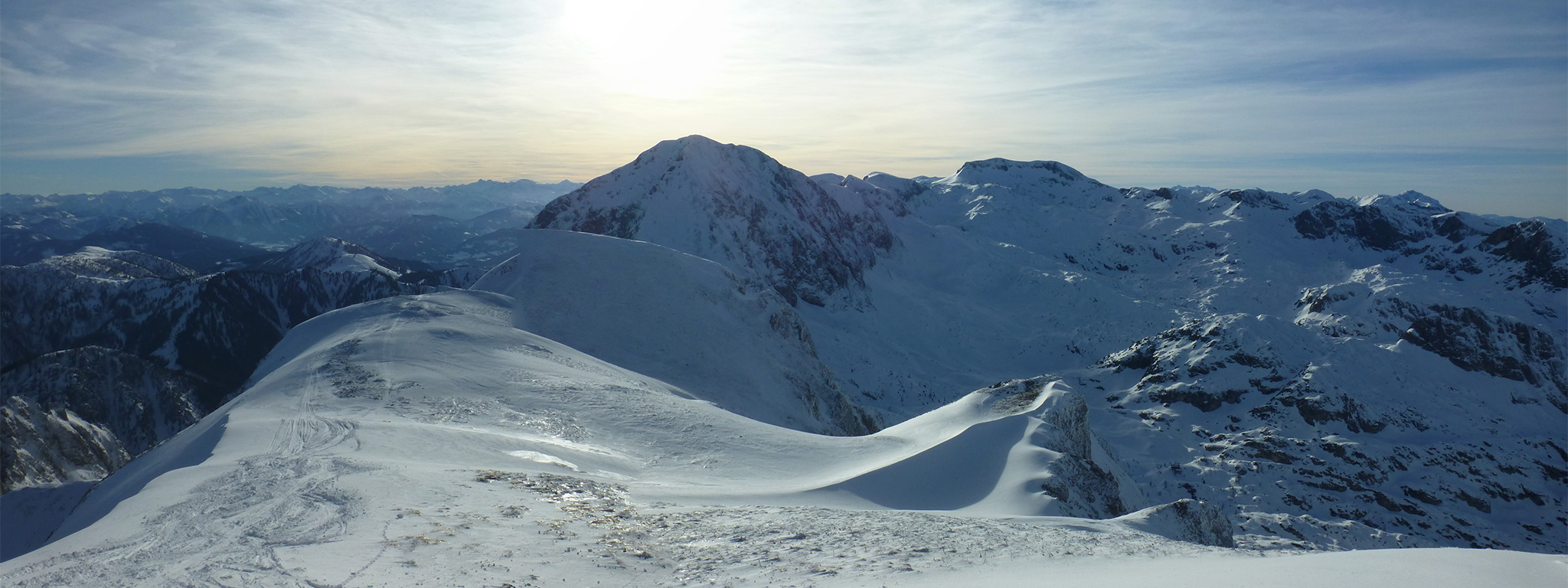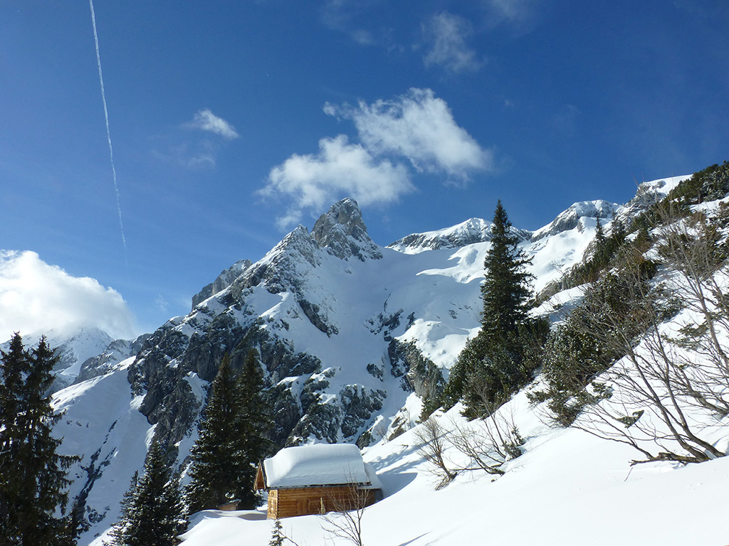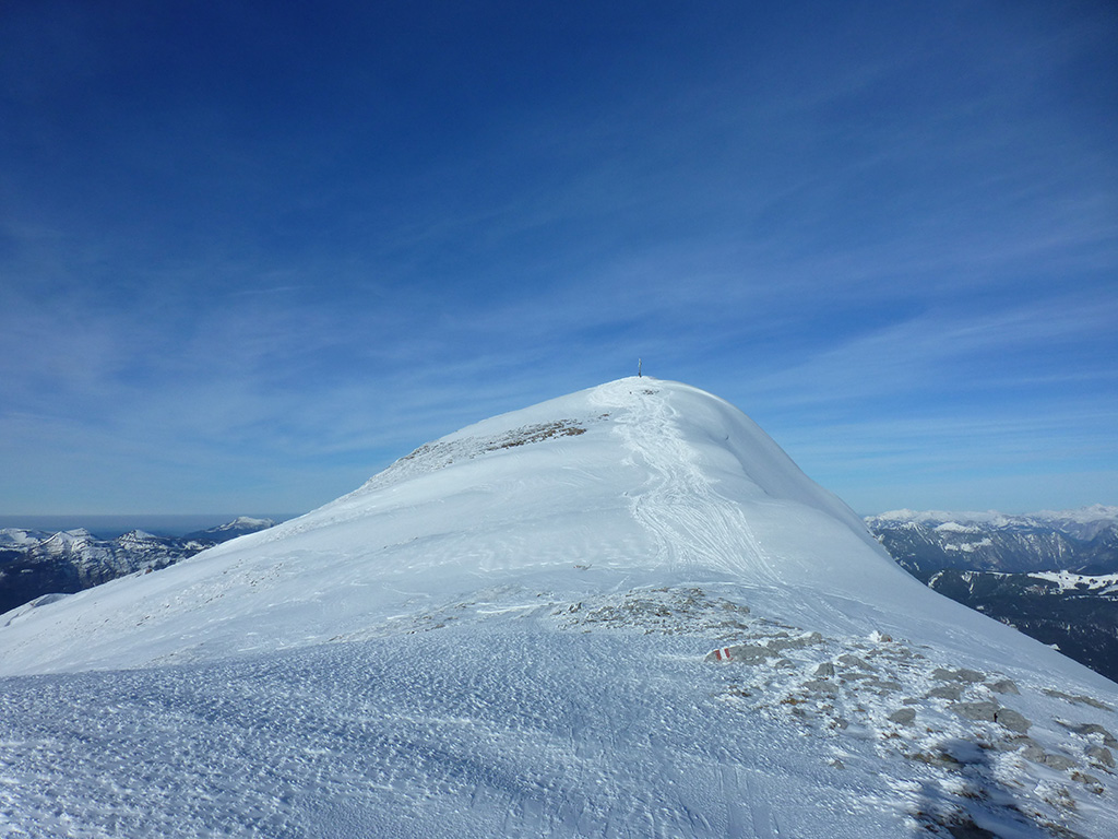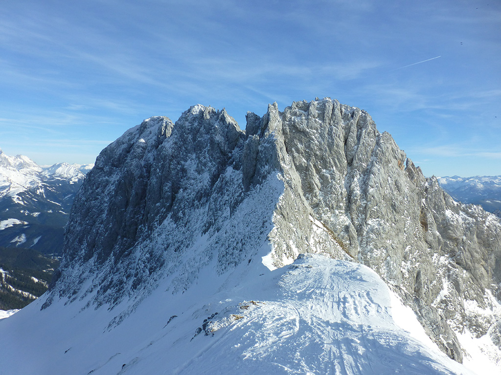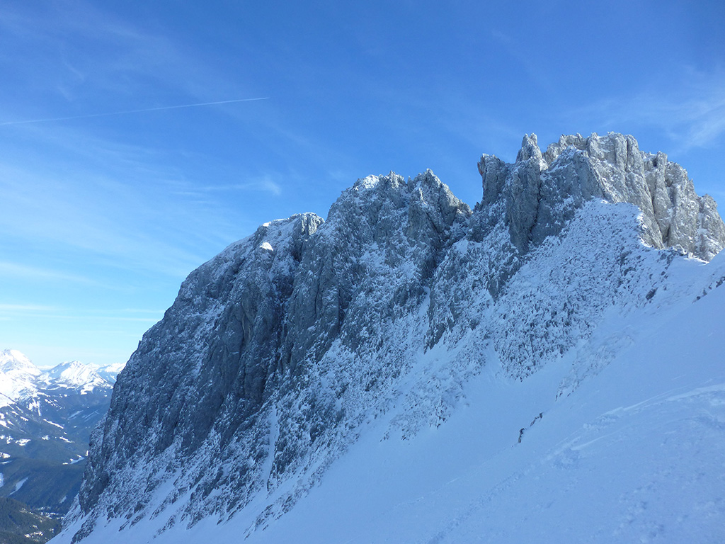 Es ist schon recht spät, als ich mich endlich aus der Arbeit veraschieden kann. Aber nachdem es draußen mittlerweile lange genung hell ist, geht sich schon noch eine kleine Schitour im Tennengebirge aus. Vor fast genau einem Jahr wollte ich vom Lammertal aus auf den Hochkarfelderkopf gehen, was jedoch durch Schneefall und null Sicht keinen Erfolg hatte. Ich brach die Tour etwas oberhalb der Jagdhütte ab. Heute will ich es nochmals versuchen, dieses Mal aber bei herrlichem Sonnenschein, super Schnee und mit gut angeleger Aufstiegsspur. Der gut konservierte Pulverschnee versprach großes Vergnügen bei der Abfahrt, ebenso wie noch wenig verspurte Hänge und Flanken. Nach knapp zwei Stunden Aufstieg stehe ich vor dem Gipfelkreuz des Hochkarfelderkopfs. Die Aussicht ist phänomenal, die Stimmung einmalig, und ich genieße die Ruhe nach einer anstrengenden Arbeitswoche. Die Abfahrt ist traumhaft, und auf der Scharte vor der Riffl überlege ich mir kurz in südwestlicher Richtung zum sogenannten „Scharfen Steig“ abzufahren. Heute nicht, diese Variante werde ich mir ein anderes Mal, und vor allem nicht erst am späten Nachmittag ansehen. Anstelle der Aufstiegsroute via Jagdhütte fahre ich über den Paßruckgraben ab, zumindestens soweit möglich. Die letzten Höhenmeter bis zur Forststrasse lege ich mangels Schnee zu Fuß zurück, dann gehts wieder auf Schi hinunter zum Parkplatz. Eine super Tour die unbedingt wiederholt werden muss!