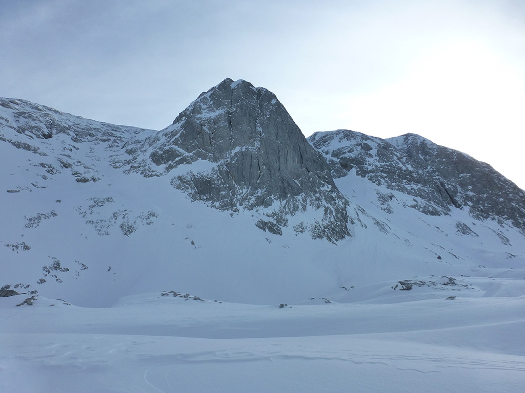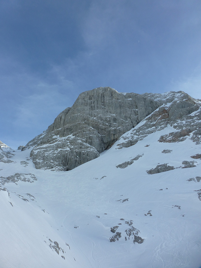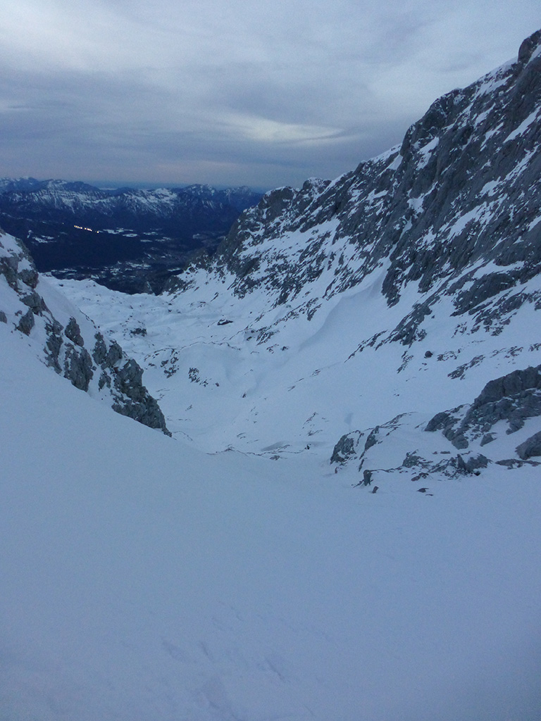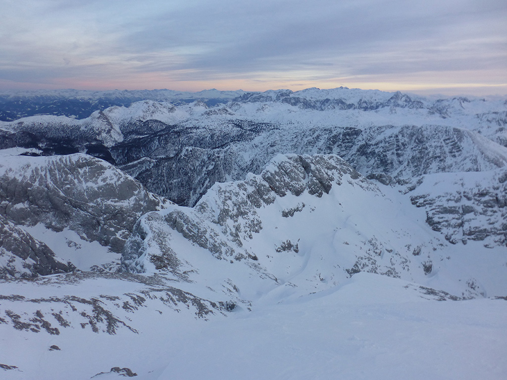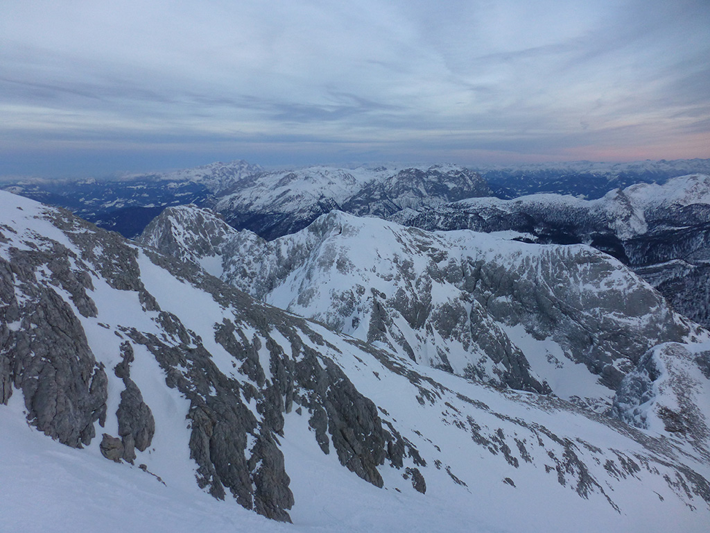 Es ist schon späterer Nachmittag, aber im März sind offensichtlich die Tage schon wieder merklich länger. Das Wetter ist auch sehr stabil, freundlich, und am Göll war ich schon länger nicht mehr oben, in diesem Winter schon gar nicht. Im unteren Alpeltal kommen mir noch ein paar Schitourengeher entgegen, dann bin ich aber völlig allein in den Umgängen bis zum Gipfel unterwegs. Die Hänge sind schon überall mit Schispuren durchzogen, und ein breite Spur führt bis zur komplett ausgefahrenen Rinne untehalb des Kuchler Kreuzes. Nun ziehen auch die Temperaturen spürbar an und ich ziehe mir gerne ein dünne Jacke an, bevor ich die letzten Höhenmeter bis zum Gipfel in Angriff nehme. Die Göllwechte hat heuer eine überschaubare Größe, ist aber trotz der eher mäßigen Schneemengen immer noch sehr beeindruckend. Am Gipfel angekommen, ziehe ich schnell meine Hardshell an, trockene Handschuhe und setze meinen Helm auf. Die Sonne ist schon untergegangen, aber die letzten Sonnenstrahlen des Tages lassen den Horizont in unterschiedlichen Farben von Gelb über Orange bis Rot erscheinen. Für einen kurzen Moment genieße ich noch die unheimliche Stille, den immer wieder imposanten Ausblick auf die Berchtesgadener Alpen, mache ein paar Fotos und mache mich an die Abfahrt.