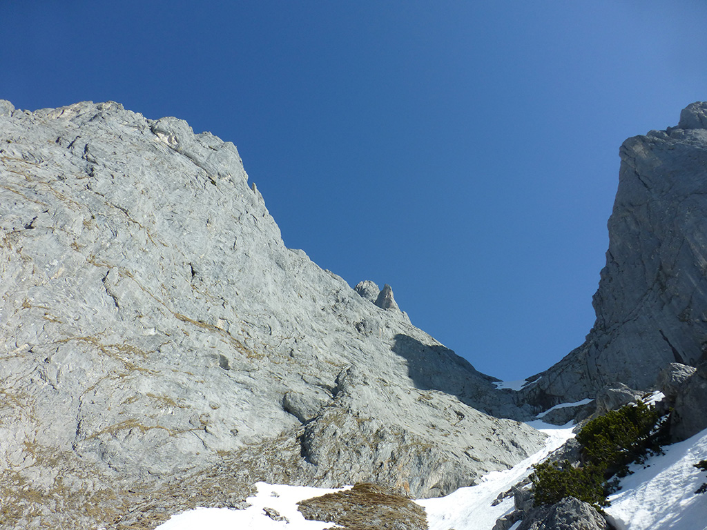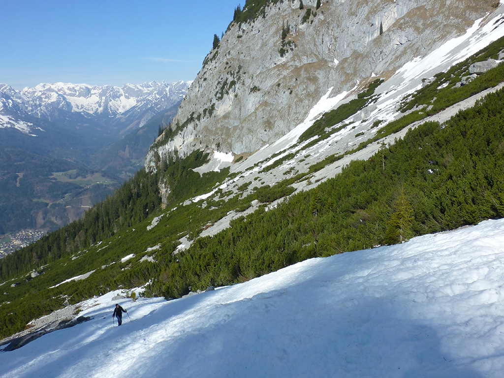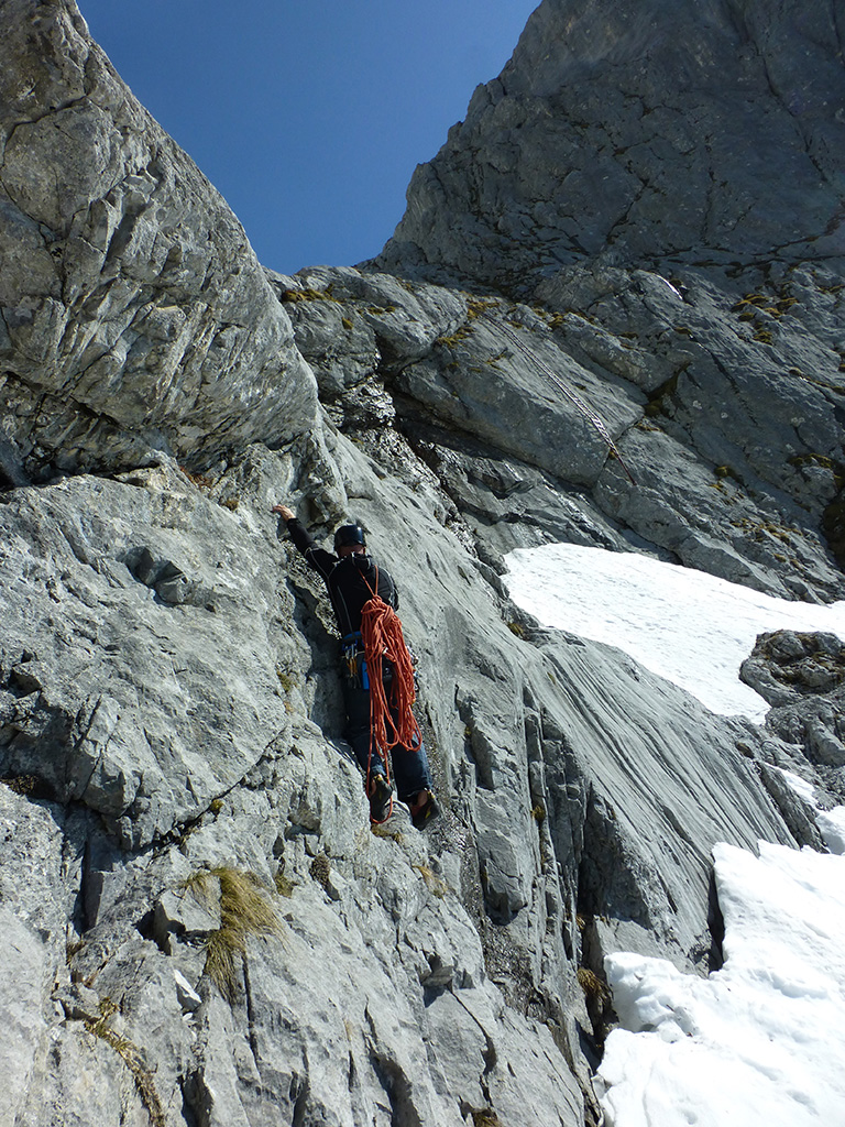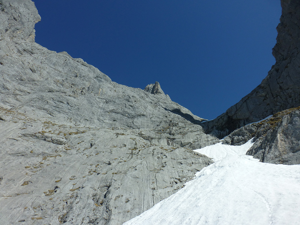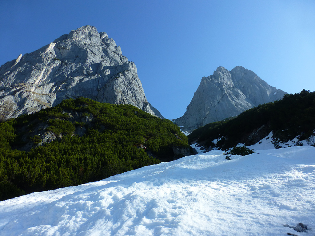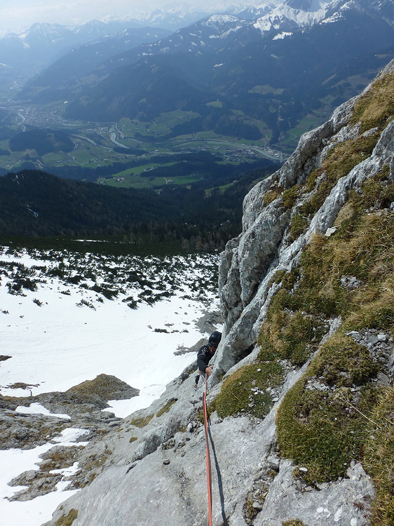 Klettern an diesem 1. April sollte für Chris und mich natürlich kein Scherz sein, sondern ein Test, ob die Südseite des Tennengebirges bereits trocken genug ist für ein solches Unterfangen. Doch beim Zustieg zur Thronleiter unter dem Werfener Hochthron war bereits klar, dass wir dazu erst einmal mühsam durch große Restschneefelder latschen müssen. Alle Routen zwischen kleinem und großem Fieberhorn waren bis auf wenige Stellen komplett trocken. Chris und ich wollten als Auftakt für die Klettersaison was gemütliches machen und entschieden uns für die Route Flitterwochen (VI+). Nach Überwindung der „Randkluft“ fühlten sich die ersten Klettermeter am Fels schon etwas ungewohnt an, aber schon bald hatten wir ein breites Grinsen in unseren Gesichtern. Leider meinte Chris nach ein paar Seillängen, dass er etwas angeschlagen ist, jeder Zug immer mühsamer erscheint, weshalb wir kurzerhand zum Throntal abseilten. Nach dem Rückweg zum Rucksackdepot wartete noch ein entspannter Abstieg durch den Schnee auf uns, und bald standen wir wieder am Parkplatz unterhalb der Mahdegg Alm. Schade, dass uns heute der kompletten Durchstieg der Route verwehrt blieb, aber Spaß hat uns die Kletterei allemal gemacht. Das Jahr ist ja noch jung…