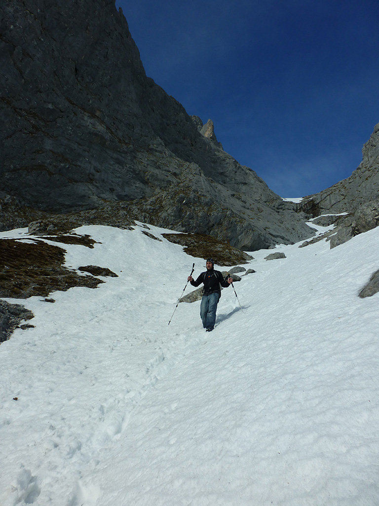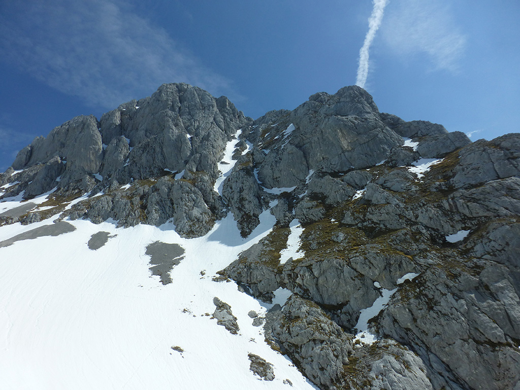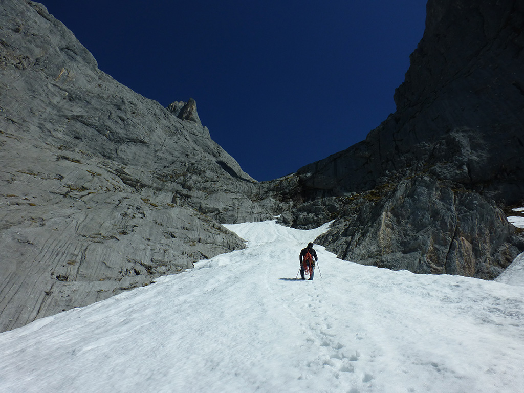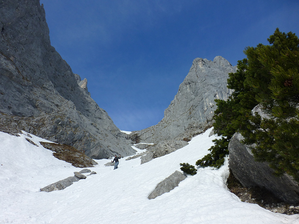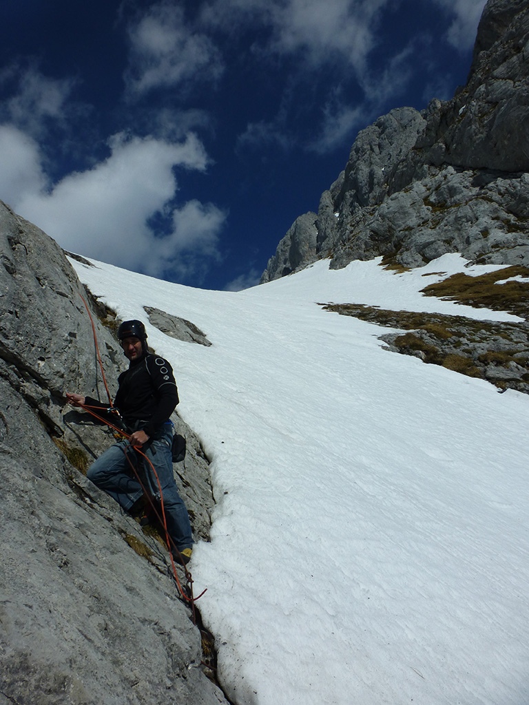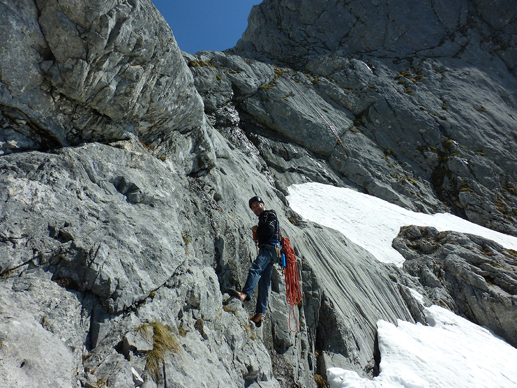 Klettern an diesem 1. April sollte für Chris und mich natürlich kein Scherz sein, sondern ein Test, ob die Südseite des Tennengebirges bereits trocken genug ist für ein solches Unterfangen. Doch beim Zustieg zur Thronleiter unter dem Werfener Hochthron war bereits klar, dass wir dazu erst einmal mühsam durch große Restschneefelder latschen müssen. Alle Routen zwischen kleinem und großem Fieberhorn waren bis auf wenige Stellen komplett trocken. Chris und ich wollten als Auftakt für die Klettersaison was gemütliches machen und entschieden uns für die Route Flitterwochen (VI+). Nach Überwindung der „Randkluft“ fühlten sich die ersten Klettermeter am Fels schon etwas ungewohnt an, aber schon bald hatten wir ein breites Grinsen in unseren Gesichtern. Leider meinte Chris nach ein paar Seillängen, dass er etwas angeschlagen ist, jeder Zug immer mühsamer erscheint, weshalb wir kurzerhand zum Throntal abseilten. Nach dem Rückweg zum Rucksackdepot wartete noch ein entspannter Abstieg durch den Schnee auf uns, und bald standen wir wieder am Parkplatz unterhalb der Mahdegg Alm. Schade, dass uns heute der kompletten Durchstieg der Route verwehrt blieb, aber Spaß hat uns die Kletterei allemal gemacht. Das Jahr ist ja noch jung…
