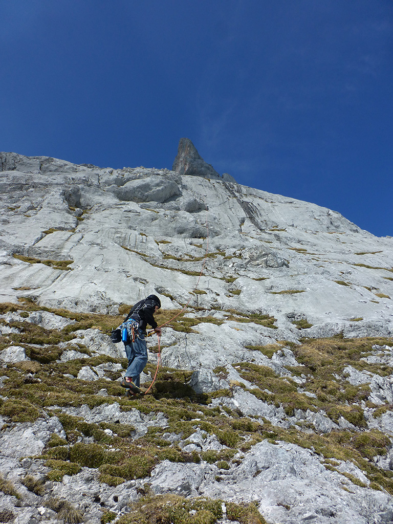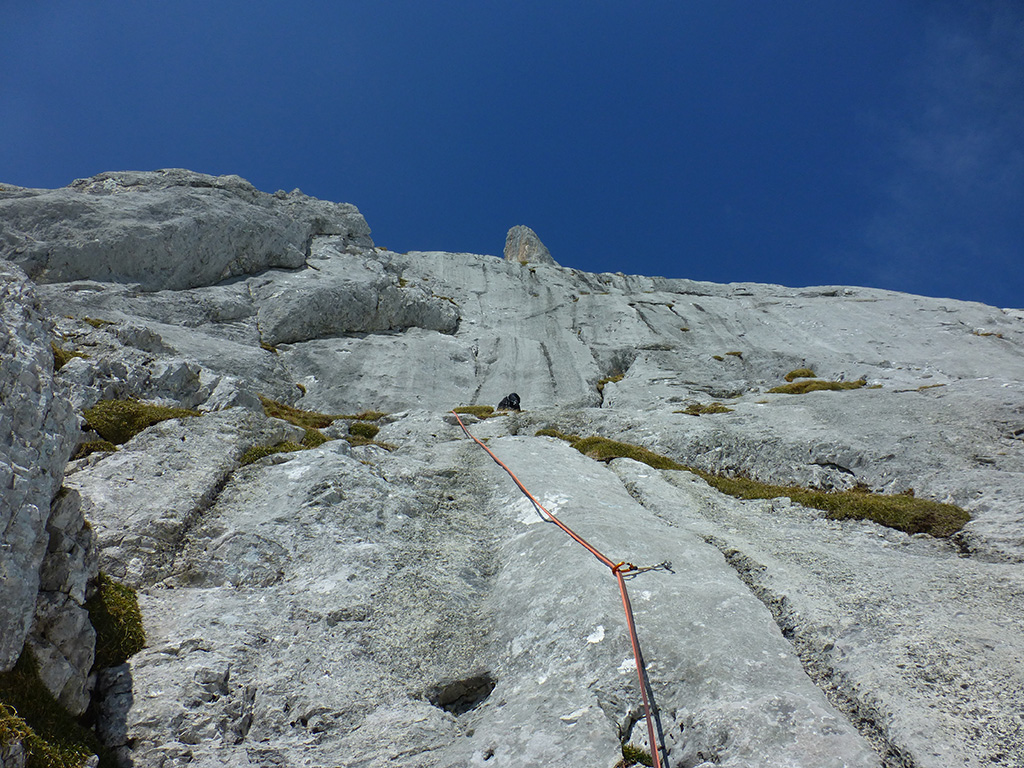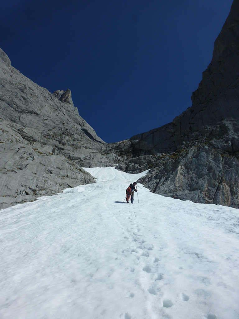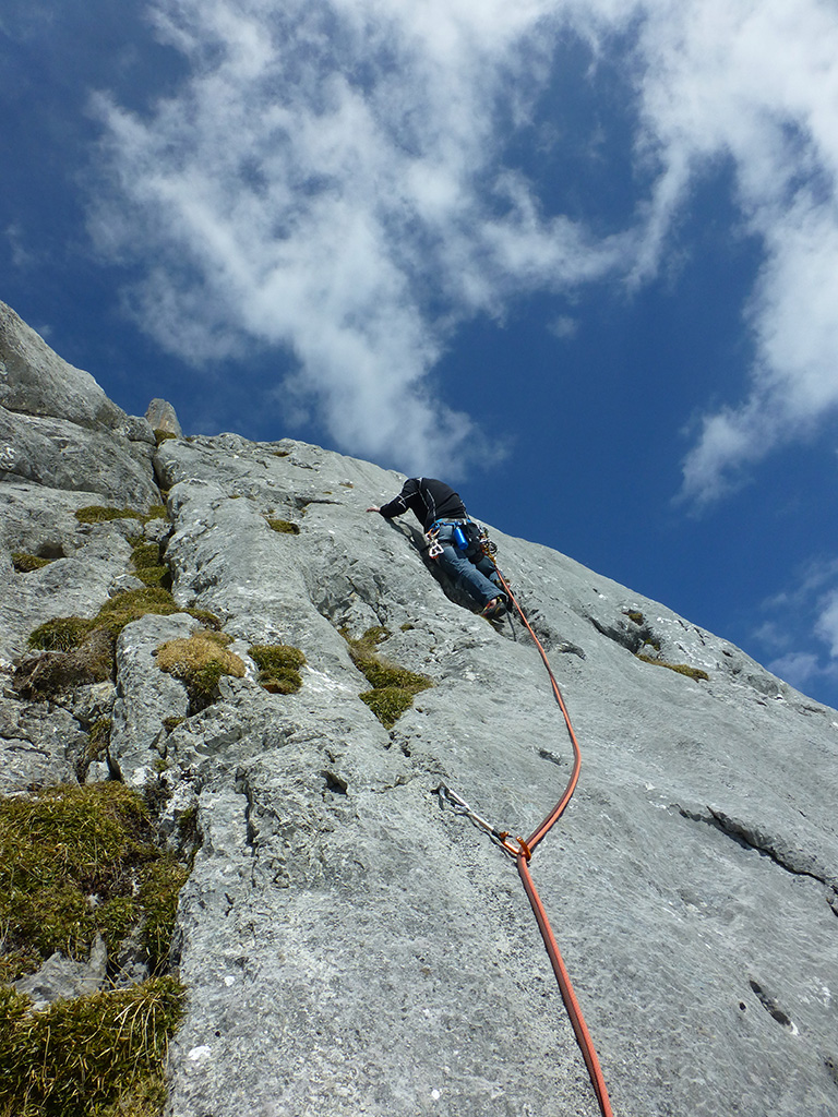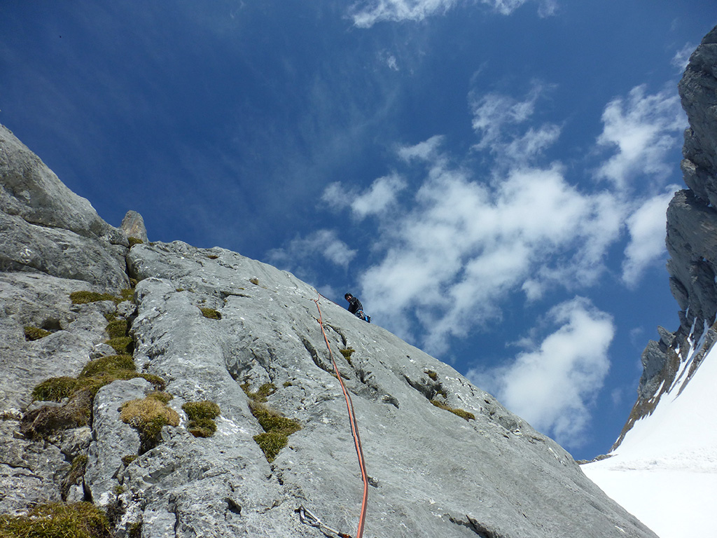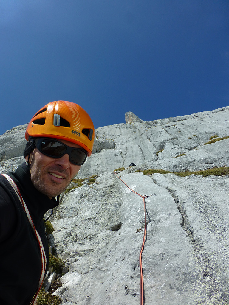 Klettern an diesem 1. April sollte für Chris und mich natürlich kein Scherz sein, sondern ein Test, ob die Südseite des Tennengebirges bereits trocken genug ist für ein solches Unterfangen. Doch beim Zustieg zur Thronleiter unter dem Werfener Hochthron war bereits klar, dass wir dazu erst einmal mühsam durch große Restschneefelder latschen müssen. Alle Routen zwischen kleinem und großem Fieberhorn waren bis auf wenige Stellen komplett trocken. Chris und ich wollten als Auftakt für die Klettersaison was gemütliches machen und entschieden uns für die Route Flitterwochen (VI+). Nach Überwindung der „Randkluft“ fühlten sich die ersten Klettermeter am Fels schon etwas ungewohnt an, aber schon bald hatten wir ein breites Grinsen in unseren Gesichtern. Leider meinte Chris nach ein paar Seillängen, dass er etwas angeschlagen ist, jeder Zug immer mühsamer erscheint, weshalb wir kurzerhand zum Throntal abseilten. Nach dem Rückweg zum Rucksackdepot wartete noch ein entspannter Abstieg durch den Schnee auf uns, und bald standen wir wieder am Parkplatz unterhalb der Mahdegg Alm. Schade, dass uns heute der kompletten Durchstieg der Route verwehrt blieb, aber Spaß hat uns die Kletterei allemal gemacht. Das Jahr ist ja noch jung…