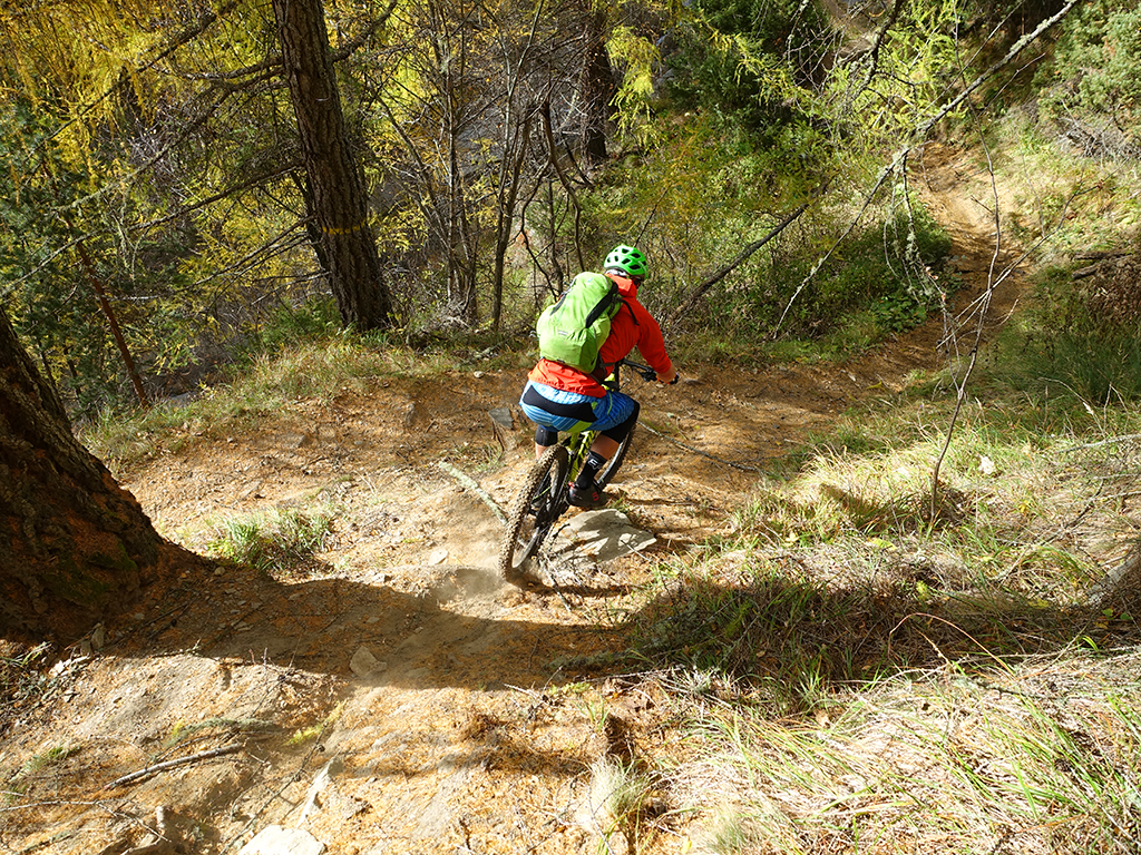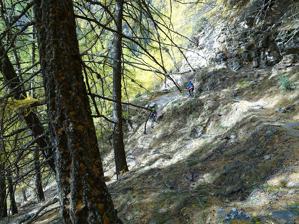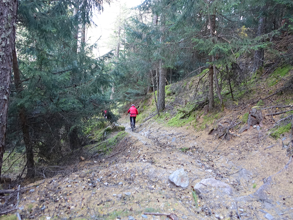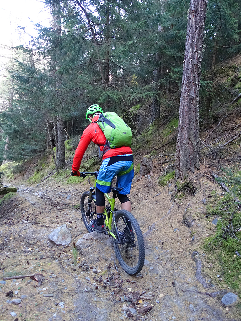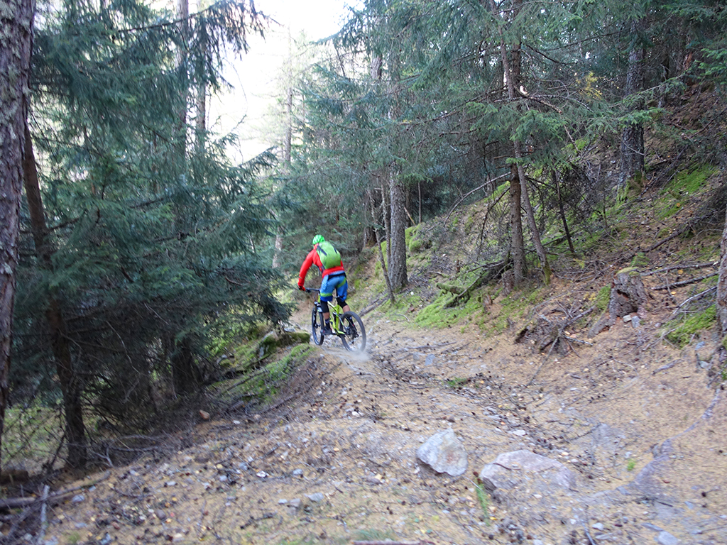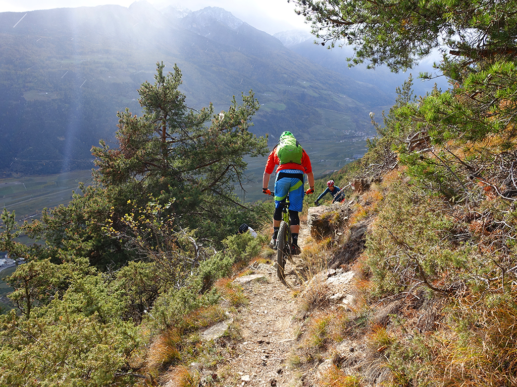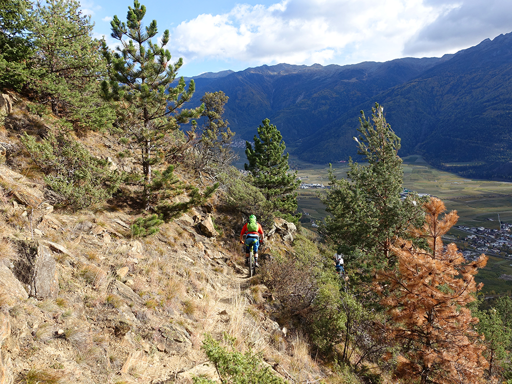 Nach zwei Tagen Sportklettern im Vinschgau haben wir, d.h. Danny, Hias, ürgen und ich uns heute zur Abwechslung für eine Biketour rund um Latsch entschieden. Von unserere Unterkunft in Kastelbell-Tschars ging es direkt los zur Straße nach St. Martin im Kofel und weiter bis zum Egghof. Dort gönnten wir uns eine gute Mahlzeit und berieten über die verschiedenen Optionen für einen lässigen Downhill. Der markierte Biketrail führt über Zuckbichl und Patsch zu einer ausgewiesenen Downhill-Strecke. Frei nach Jürgen ist es aber dort wo man komfortabel raufkurbeln kann, relativ langweilig zum Runterfahren. Also gings etwas unterhalb von Egg auf verschiedenen Wanderwegen direkt hinunter nach Goldrain, und weiter südlich nach Morter. Nun war wieder Ausdauer und Oberschenkelpower für den Latscher Alm-Tour Trail gefragt. Nach vielen Rampen und Kehren erreichten wir dann endlich die Abzweigung zum Tarscher Alm-Trail, einem recht flowigen und kurzweiligen Downhill direkt nach Tarsch.