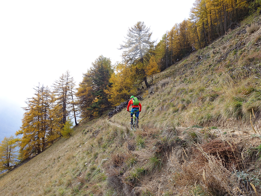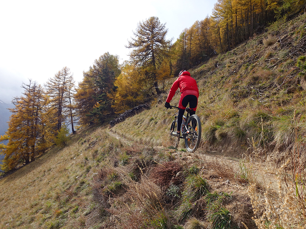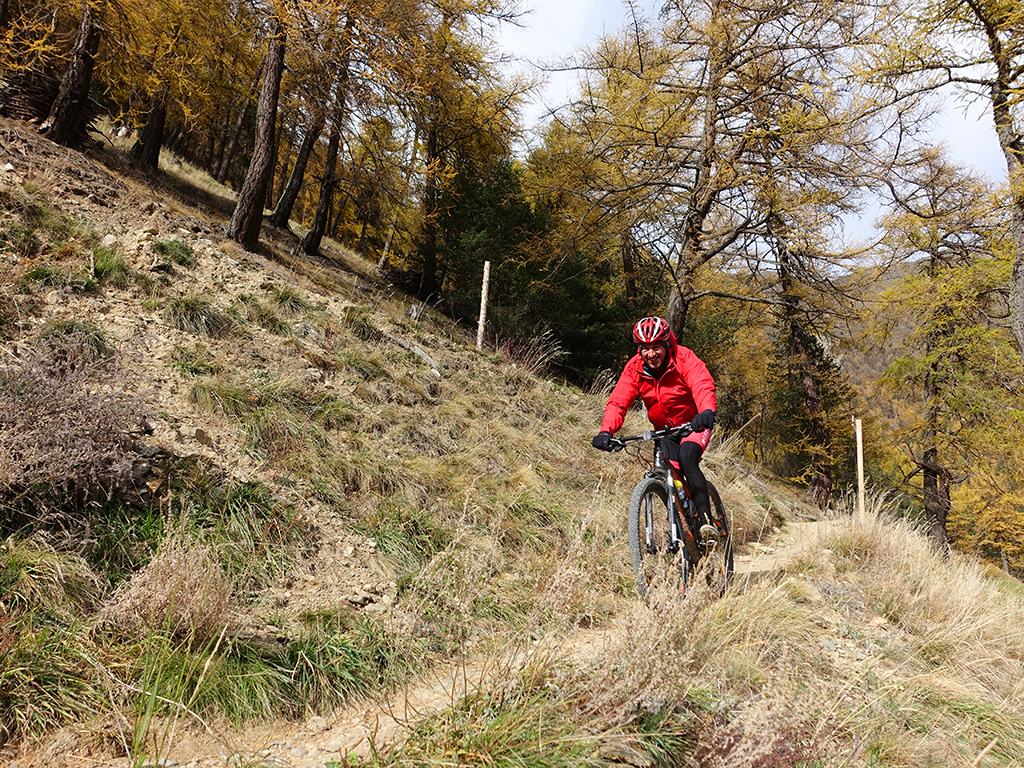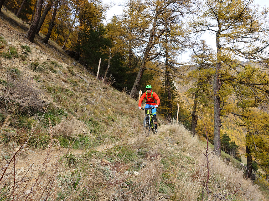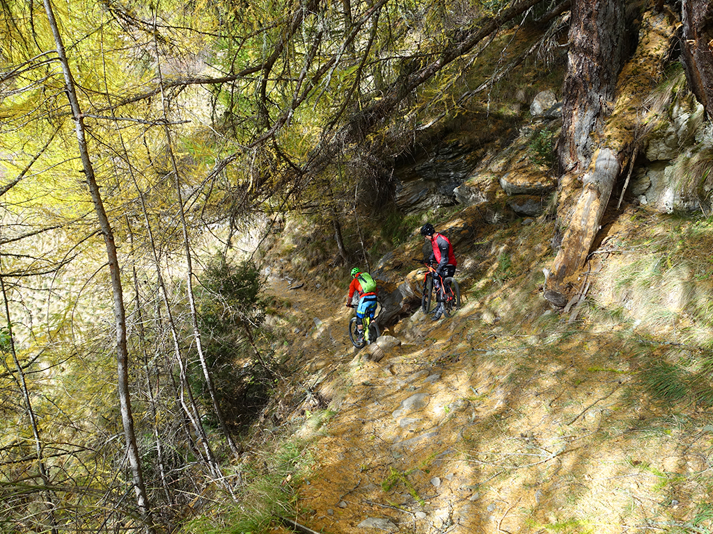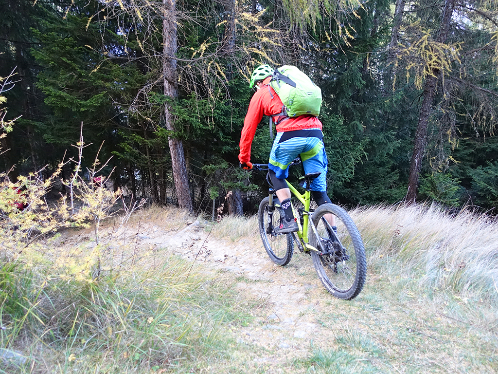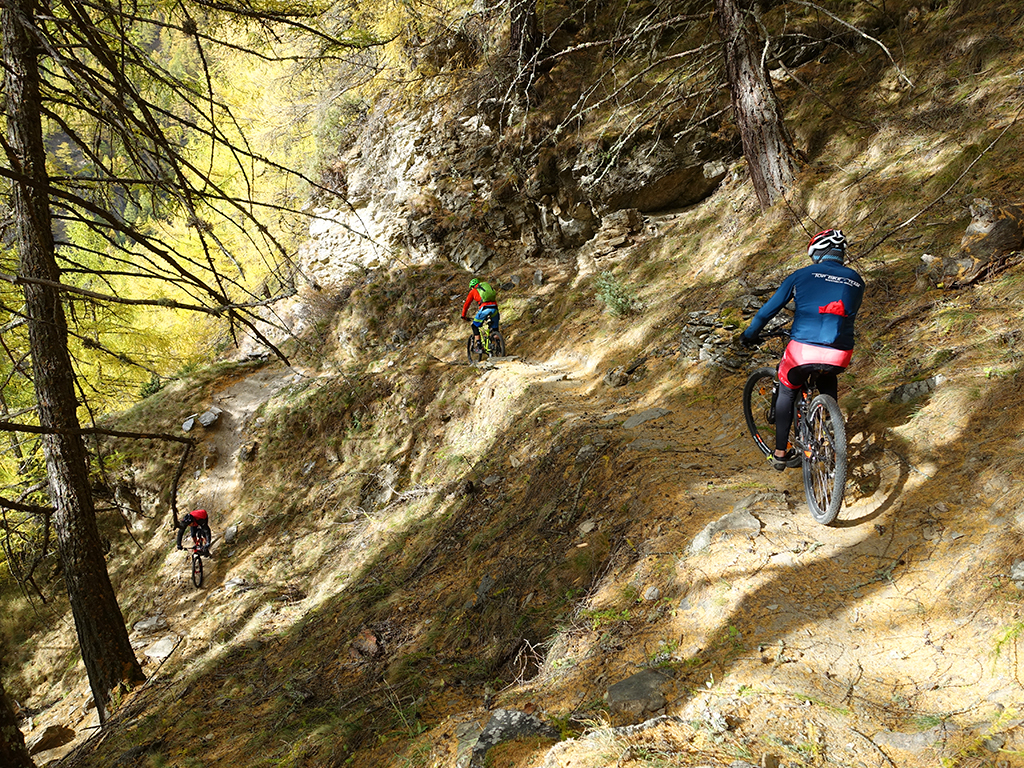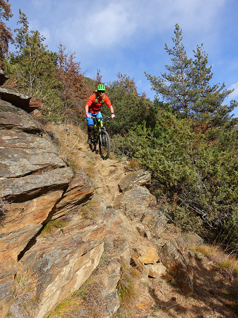 Nach zwei Tagen Sportklettern im Vinschgau haben wir, d.h. Danny, Hias, ürgen und ich uns heute zur Abwechslung für eine Biketour rund um Latsch entschieden. Von unserere Unterkunft in Kastelbell-Tschars ging es direkt los zur Straße nach St. Martin im Kofel und weiter bis zum Egghof. Dort gönnten wir uns eine gute Mahlzeit und berieten über die verschiedenen Optionen für einen lässigen Downhill. Der markierte Biketrail führt über Zuckbichl und Patsch zu einer ausgewiesenen Downhill-Strecke. Frei nach Jürgen ist es aber dort wo man komfortabel raufkurbeln kann, relativ langweilig zum Runterfahren. Also gings etwas unterhalb von Egg auf verschiedenen Wanderwegen direkt hinunter nach Goldrain, und weiter südlich nach Morter. Nun war wieder Ausdauer und Oberschenkelpower für den Latscher Alm-Tour Trail gefragt. Nach vielen Rampen und Kehren erreichten wir dann endlich die Abzweigung zum Tarscher Alm-Trail, einem recht flowigen und kurzweiligen Downhill direkt nach Tarsch.