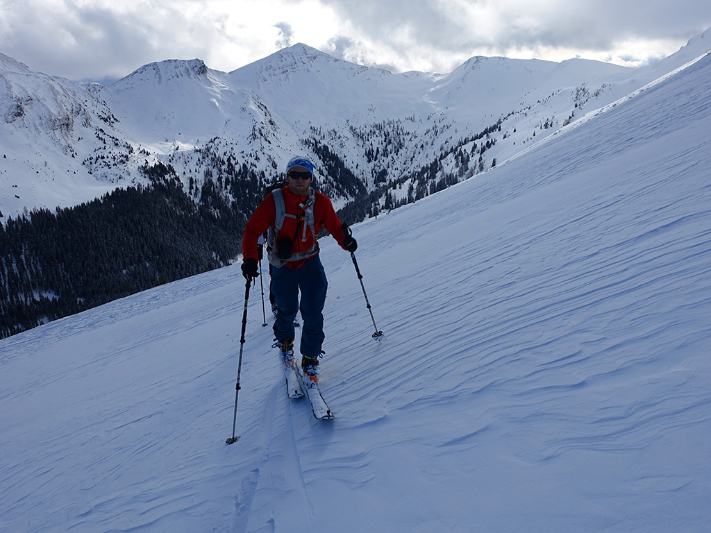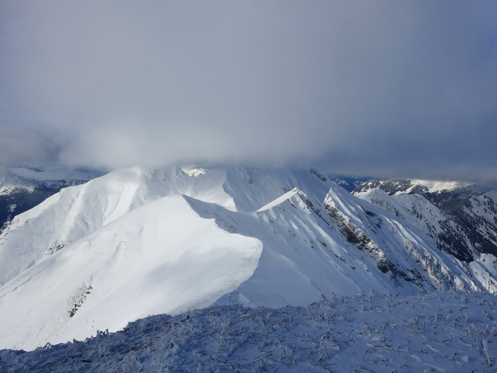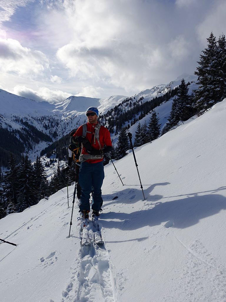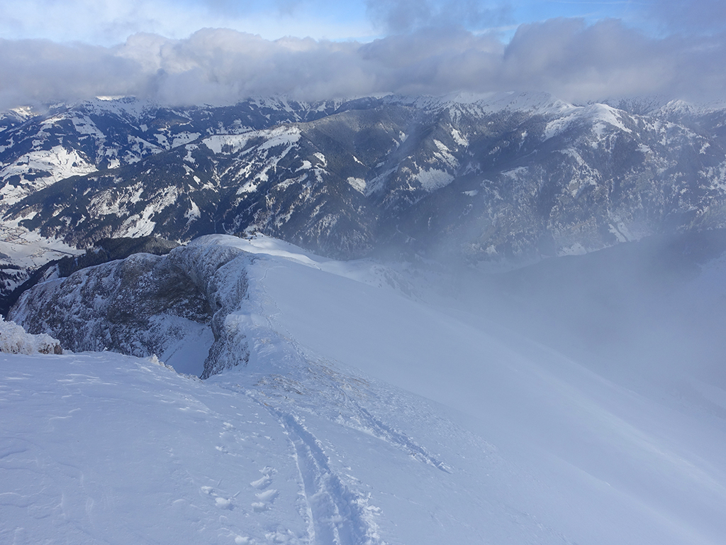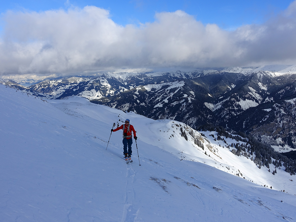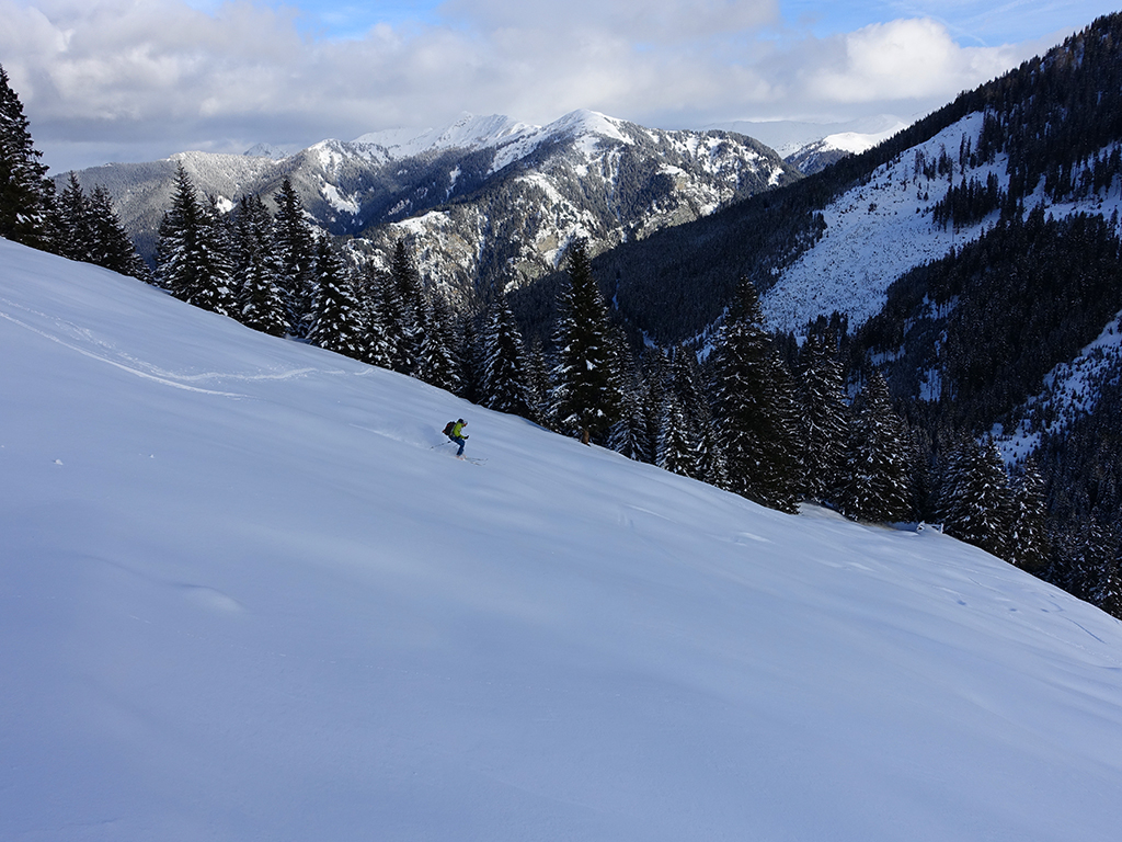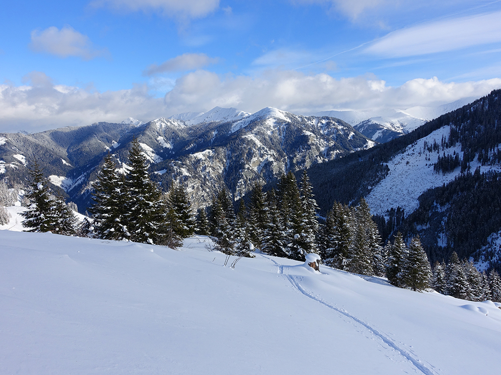 Noch ein Tag bis Weihnachten, und die lokalen Berge sind immer noch ausgiebig mit Schnee bedeckt. Auch wenn der Wind der letzten Tage die Lawinensituation etwas ungünstiger gemacht hat, fahren wir, also Danny, Michi Thomas und ich, am frühen Morgen ins Großarltal um einen der unzähligen Grasberge dort zu besteigen. Die Entscheidung fällt während der Hinfahrt auf den Frauenkogel, und kurz vor Hüttschlag zweigen wir ab zur Zubringerstraße für die Harbachalm. Nach drei Kehren erreicht man den ersten Parkplatz von wo man die ersten Kilometer mit geringer Steigung die tief verschneite Straße entlang geht. Bei einer kleinen Brücke beginnt dann der anfangs steile Aufstieg über die Südostflanke. Der Wind hat deutliche Spuren hinterlassen, der Schnee ist stark windgepresst, also entscheiden wir bereits beim Aufstieg nicht die direkt Flanke sondern eher entlang der Aufstiegsspur abzufahren. Nach einer kurzen Gipfelrast, denn es war eher windig, recht kalt, ungemütlich, wartete trotz Plattenpulver eine recht brauchbare Abfahrt auf uns. Nach knapp 1000 Höhenmeter ist geht es dann wieder entlang der Straße zurück zum Parkplatz.