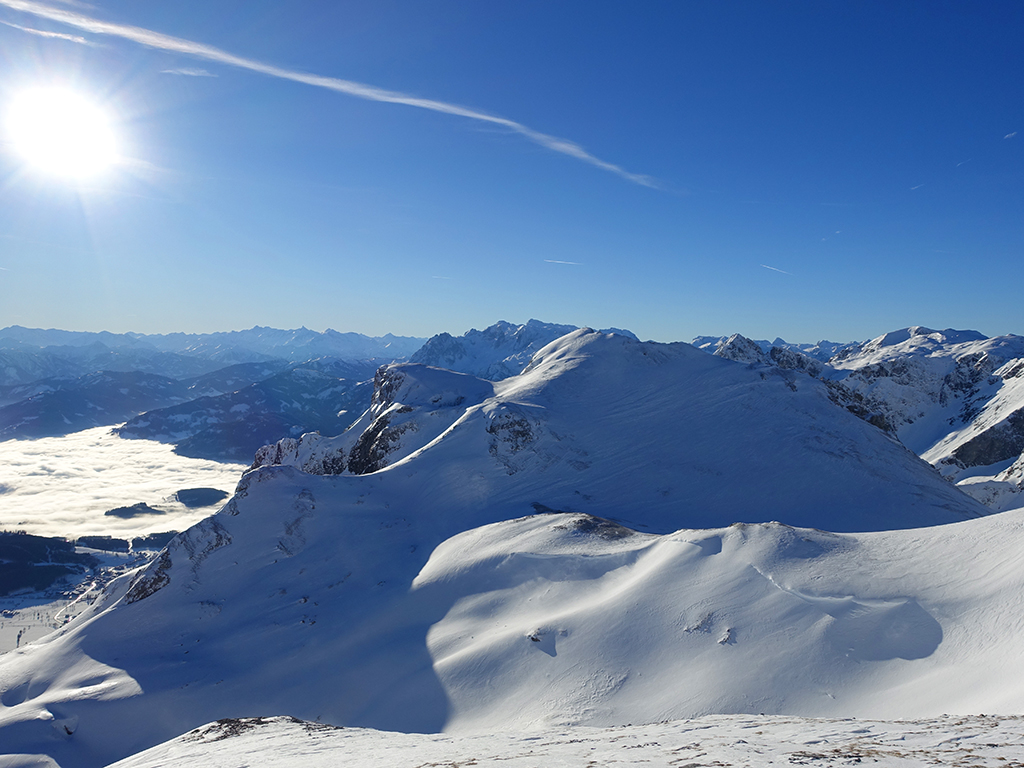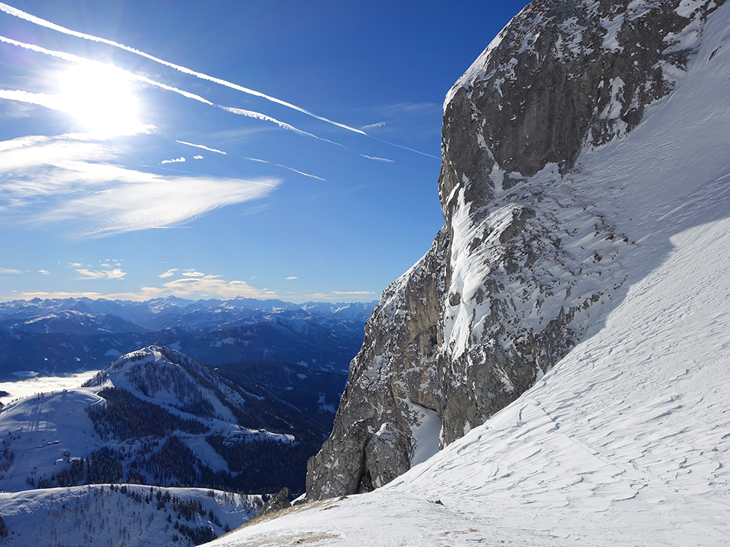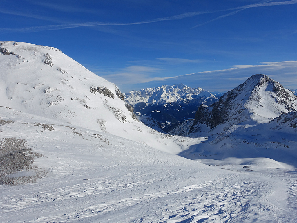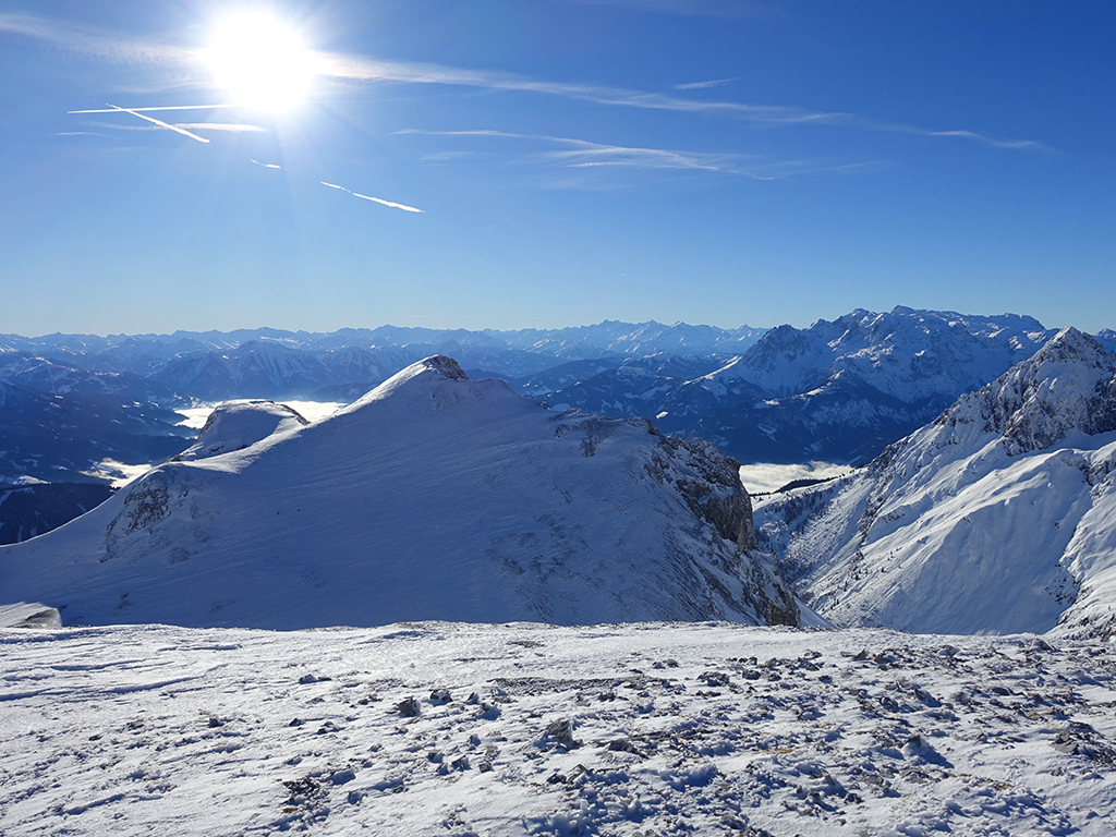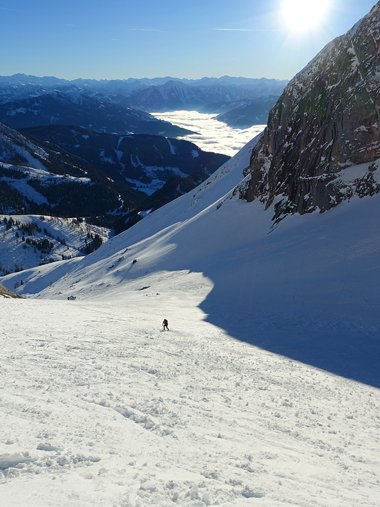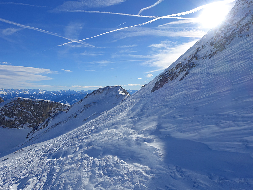 Ja ist denn heute schon Weihnachten? Definitiv, doch eine Schitour bei strahlendem Sonnenschein geht sich für Hias und mich allemal aus. Über die Hackel-Hütte folgen wir einer breiten Spur hinauf zur Tauernscharte. Hias fühlt sich heute nicht hundertprozentig fit, weshalb er ein längere Pause unterhalb der Scharte einlegt, und ich in der Zwischenzeit zum Eiskogel weitergehe. Nach einer kurzen Pause am Gipfel fahre ich entlang der Aufstiegsspur zurück, wo mir dann auch Hias entgegenkommt. Also nochmal hinauf zum Gipfel, Pause machen und die Aussicht genießen. Hias gehts nun eindeutig besser, und weil bis zum Sonnenuntergang genug Zewit bleibt, entschließen wir uns für eine kleine Rundtour mit Schartwand und Brietkogel. Die Abfahrten von der Scharte zwischen Schartwand und Brietkogel, bzw. vom Brietkogel selbst sind wahre Weihnachtsgeschenke, und wir genießen jeden Meter im lockeren Pulverschnee.