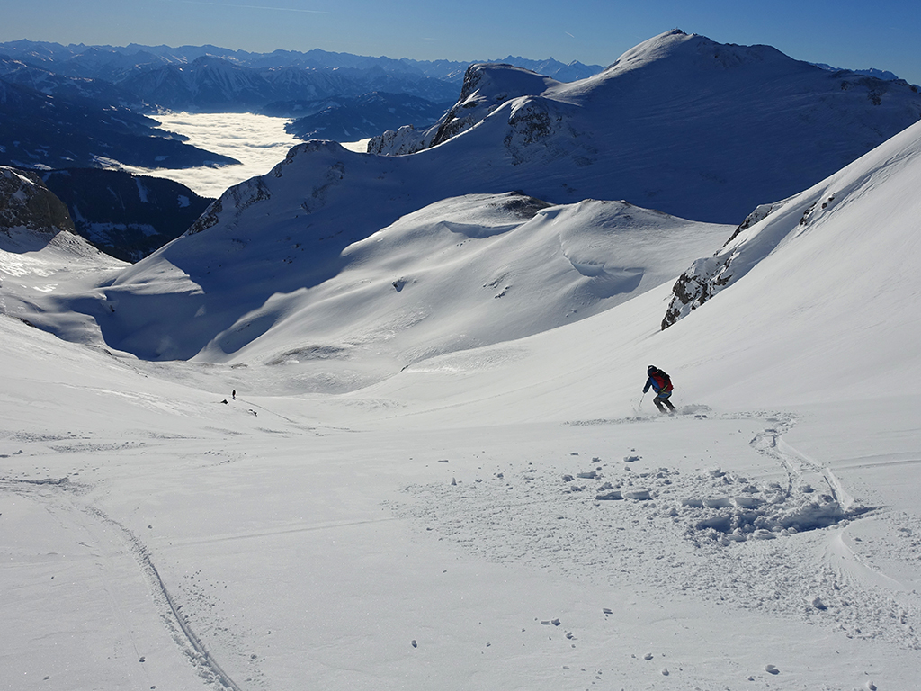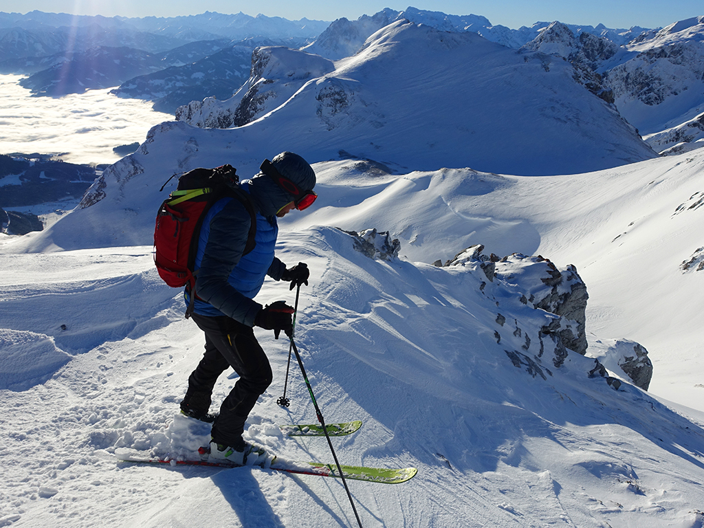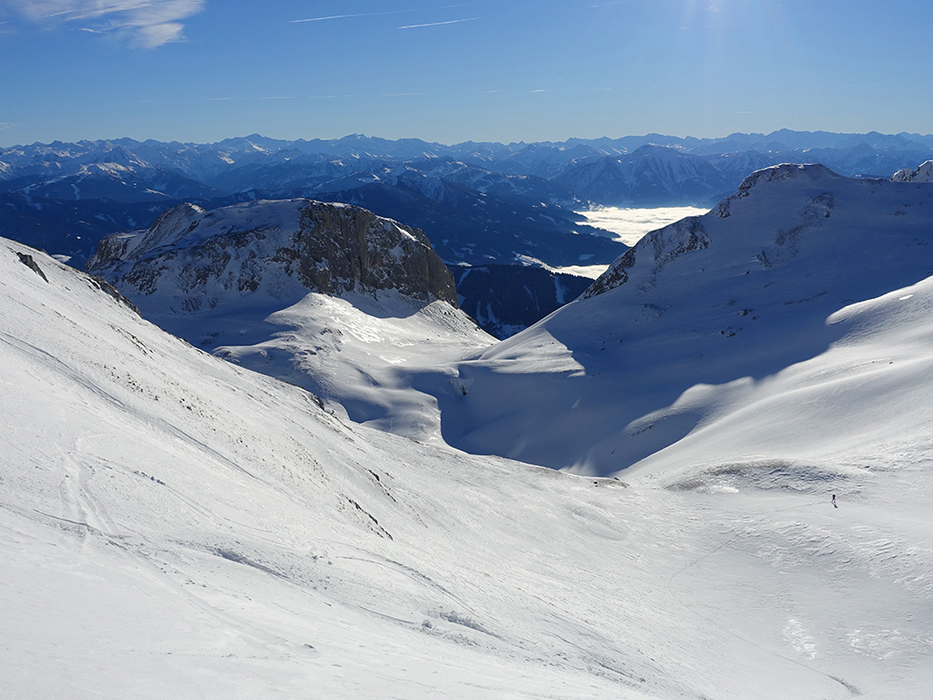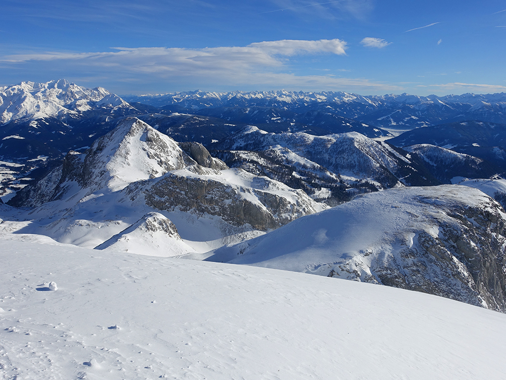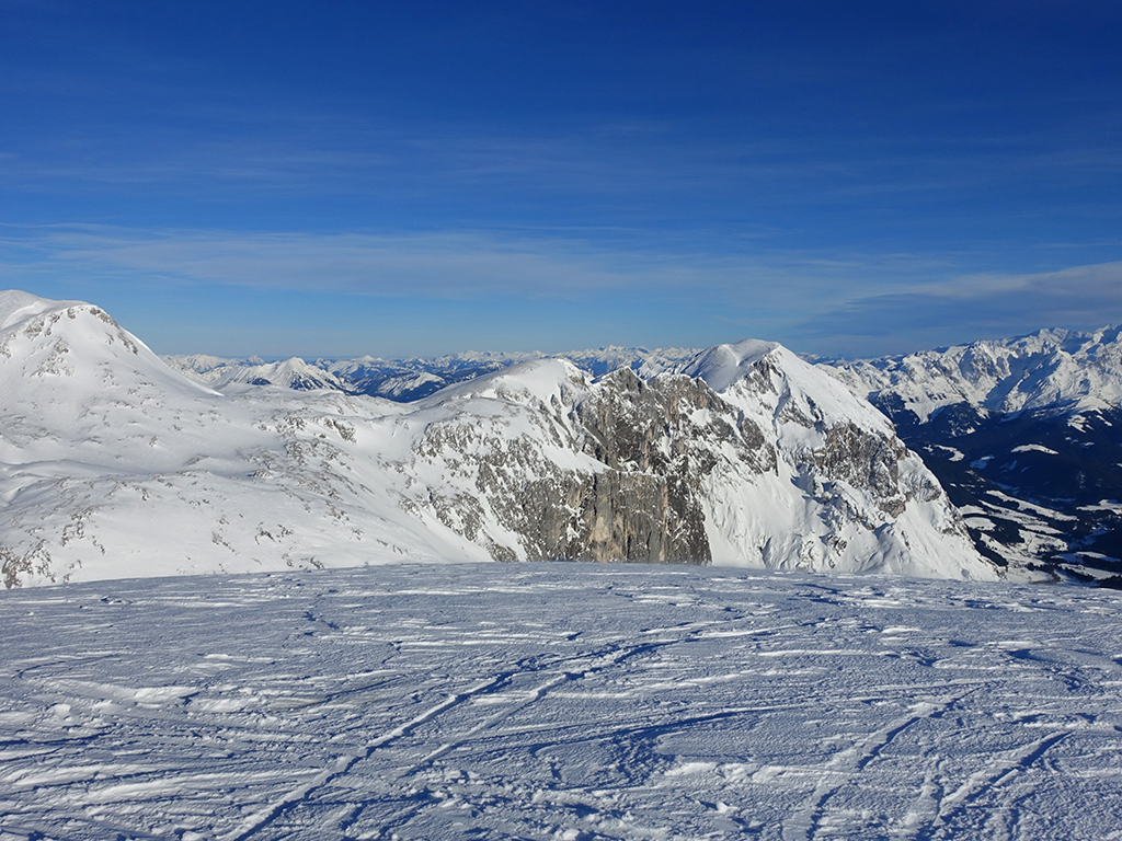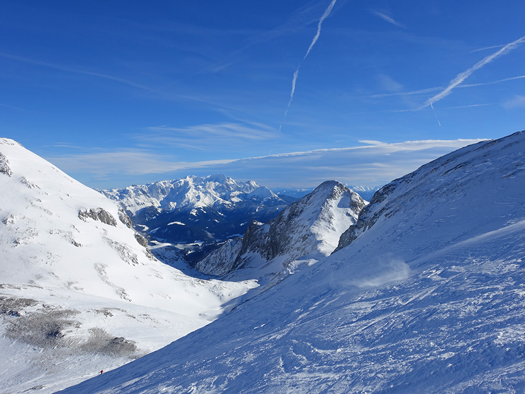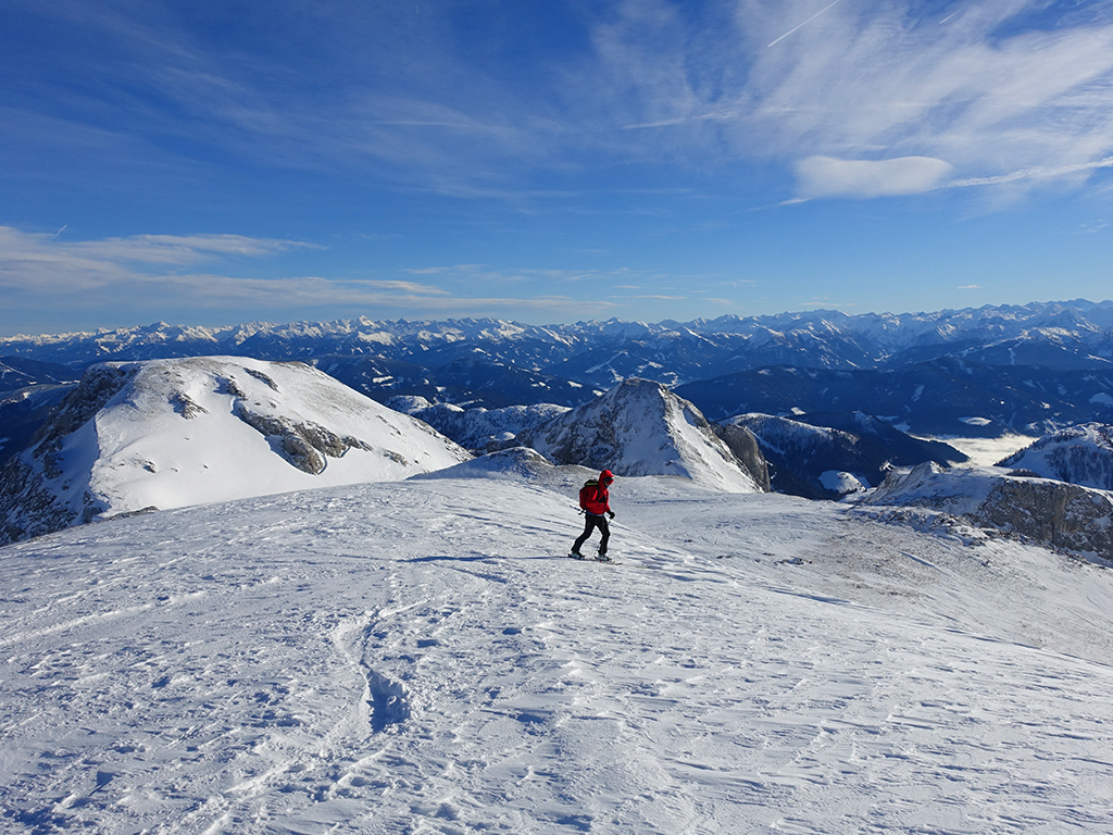 Ja ist denn heute schon Weihnachten? Definitiv, doch eine Schitour bei strahlendem Sonnenschein geht sich für Hias und mich allemal aus. Über die Hackel-Hütte folgen wir einer breiten Spur hinauf zur Tauernscharte. Hias fühlt sich heute nicht hundertprozentig fit, weshalb er ein längere Pause unterhalb der Scharte einlegt, und ich in der Zwischenzeit zum Eiskogel weitergehe. Nach einer kurzen Pause am Gipfel fahre ich entlang der Aufstiegsspur zurück, wo mir dann auch Hias entgegenkommt. Also nochmal hinauf zum Gipfel, Pause machen und die Aussicht genießen. Hias gehts nun eindeutig besser, und weil bis zum Sonnenuntergang genug Zewit bleibt, entschließen wir uns für eine kleine Rundtour mit Schartwand und Brietkogel. Die Abfahrten von der Scharte zwischen Schartwand und Brietkogel, bzw. vom Brietkogel selbst sind wahre Weihnachtsgeschenke, und wir genießen jeden Meter im lockeren Pulverschnee.