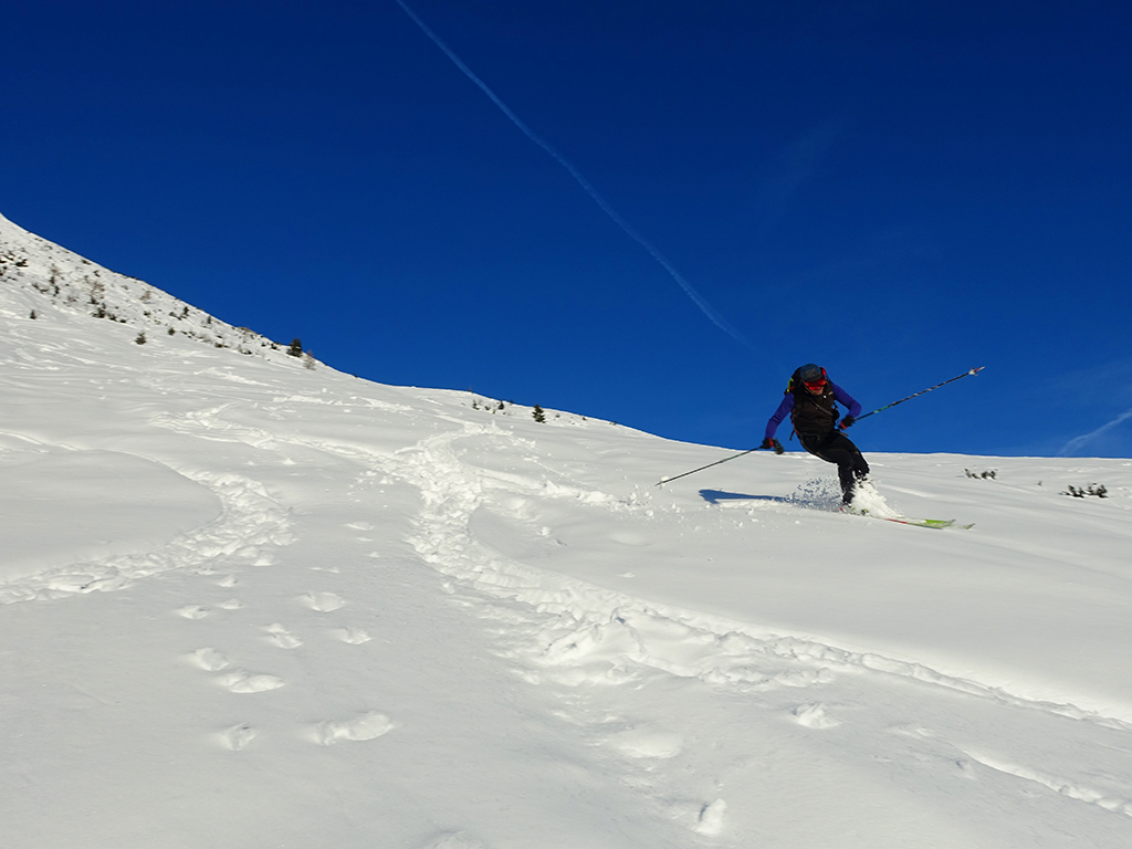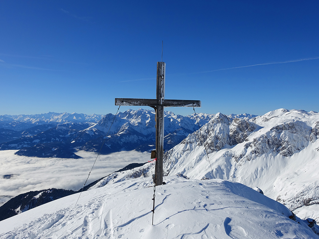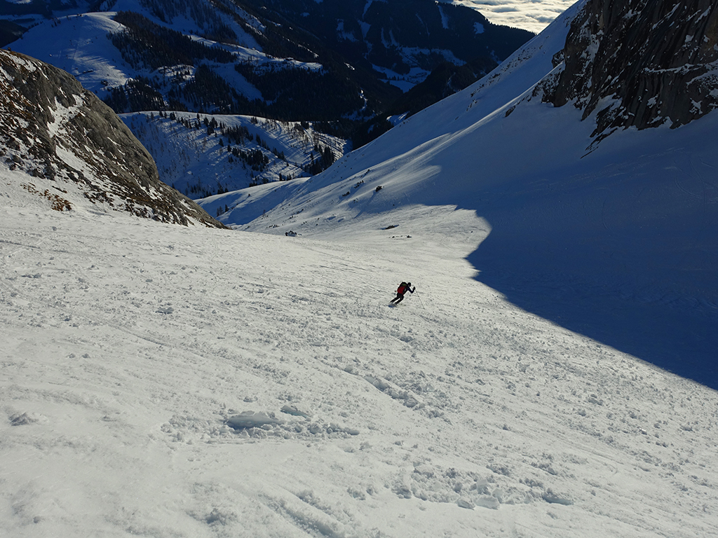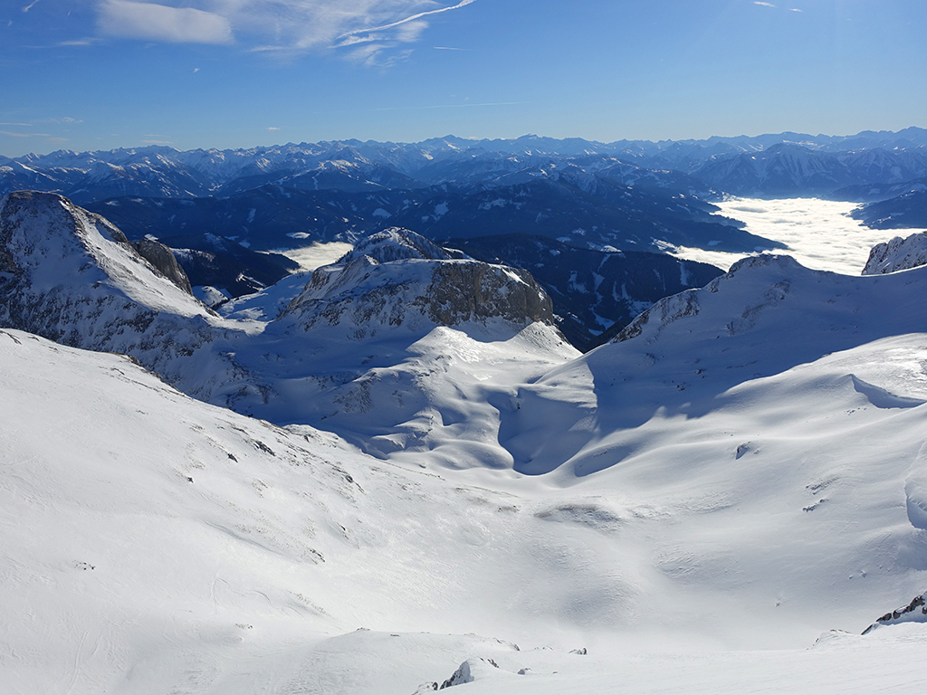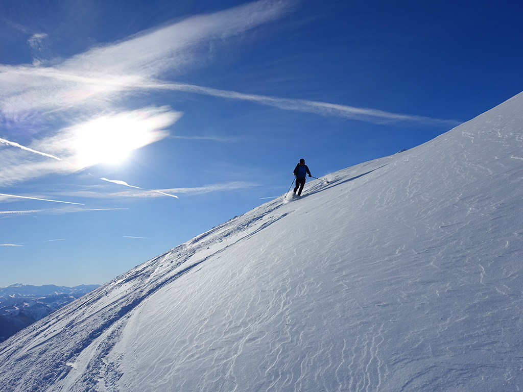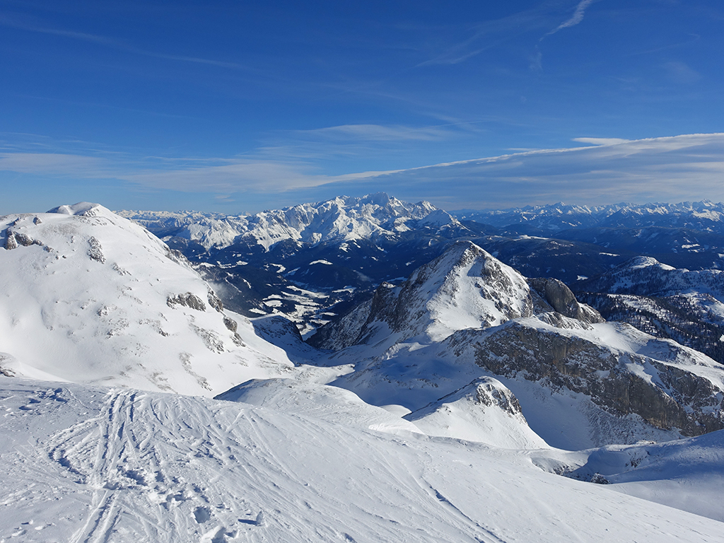 Ja ist denn heute schon Weihnachten? Definitiv, doch eine Schitour bei strahlendem Sonnenschein geht sich für Hias und mich allemal aus. Über die Hackel-Hütte folgen wir einer breiten Spur hinauf zur Tauernscharte. Hias fühlt sich heute nicht hundertprozentig fit, weshalb er ein längere Pause unterhalb der Scharte einlegt, und ich in der Zwischenzeit zum Eiskogel weitergehe. Nach einer kurzen Pause am Gipfel fahre ich entlang der Aufstiegsspur zurück, wo mir dann auch Hias entgegenkommt. Also nochmal hinauf zum Gipfel, Pause machen und die Aussicht genießen. Hias gehts nun eindeutig besser, und weil bis zum Sonnenuntergang genug Zewit bleibt, entschließen wir uns für eine kleine Rundtour mit Schartwand und Brietkogel. Die Abfahrten von der Scharte zwischen Schartwand und Brietkogel, bzw. vom Brietkogel selbst sind wahre Weihnachtsgeschenke, und wir genießen jeden Meter im lockeren Pulverschnee.