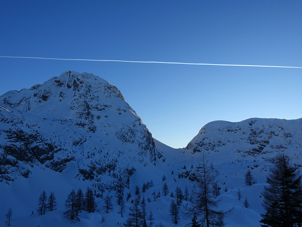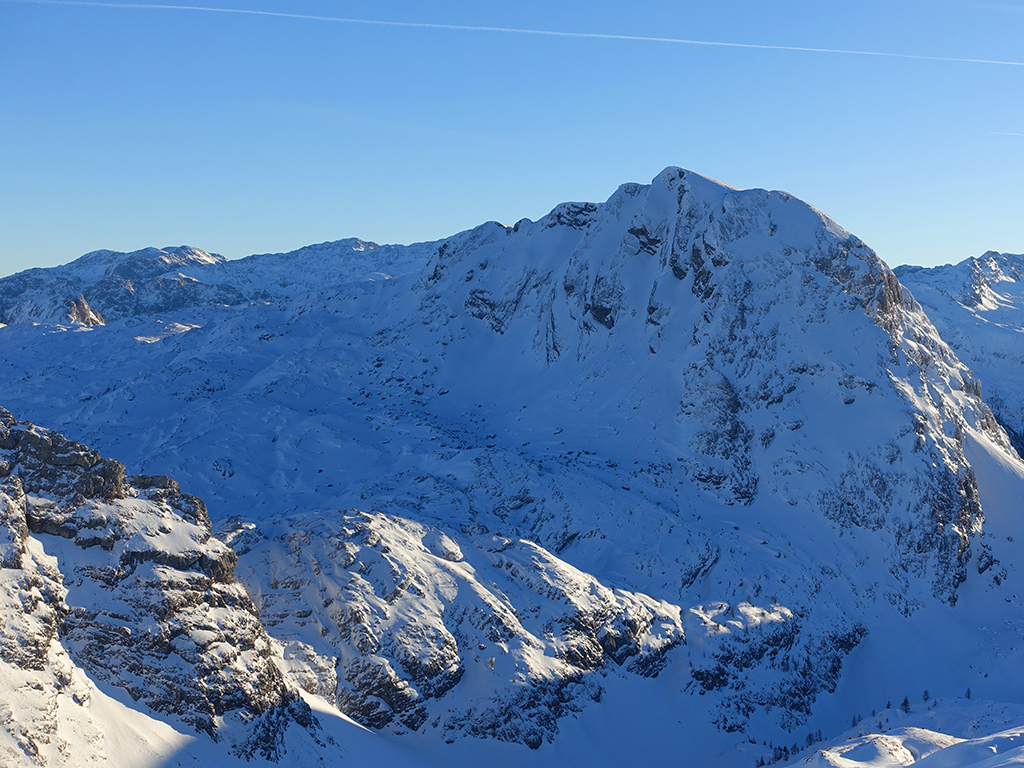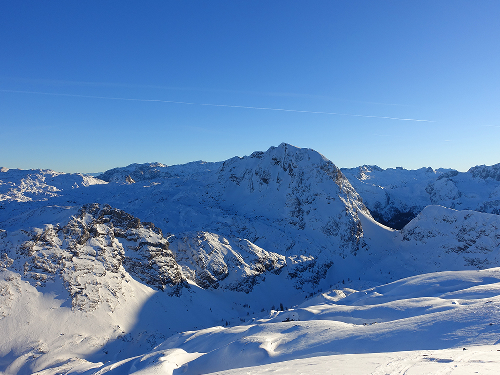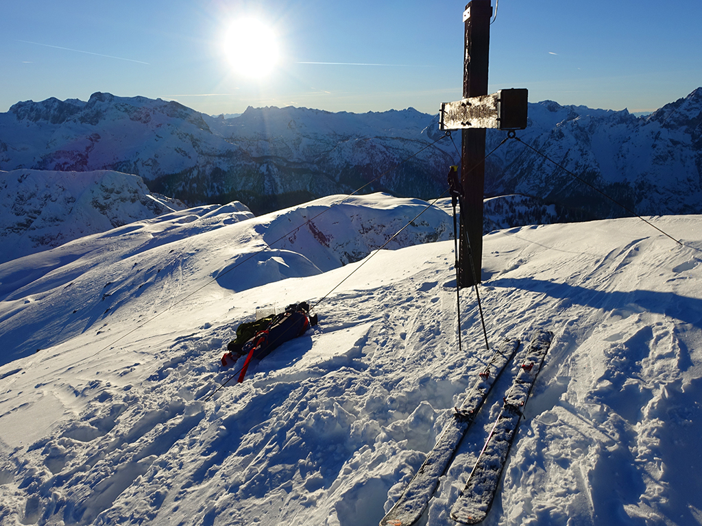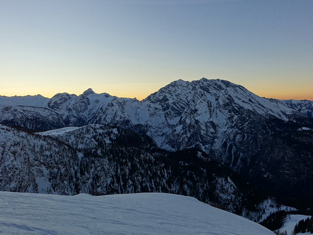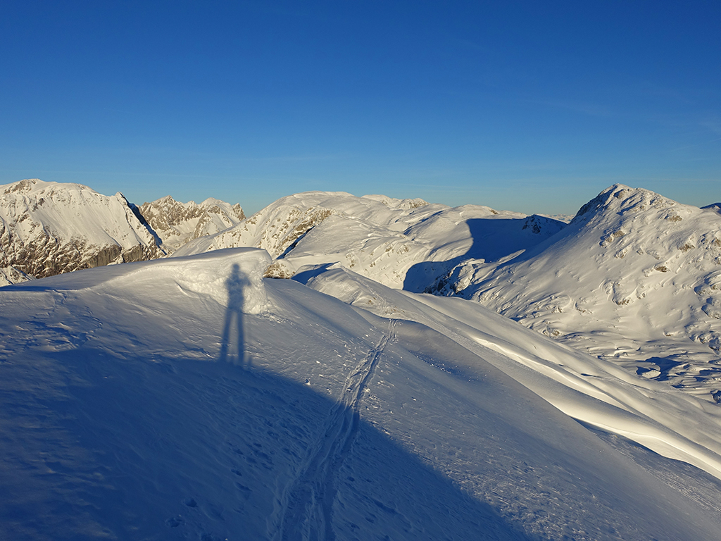 Es ist schon füher Nachmittag als ich vom Parkplatz Hinterbrand in Richtung Stahlhaus starte. An dem Stahlhaus ist die Schneedecke etwas dünn, aber immer noch ausreichend für eine gute Aufstiegsspur. Ob’s für die Abfahrt reicht, wird sich später zeigen. Als ich die beiden Gipfelkreuze am Schneibstein erreiche, ist es deutlich nach 15:00 Uhr, aber was soll’s, die kleine Reibn wird sich bis zum Sonnenuntergang schon ausgehen. Westlich vom Windschartenkopf zieht eine Spur zum Fagstein hinauf, die Sonne steht schon tief, aber diese paar zusätzlichen Höhenmeter sind noch drinnen. Am Fagstein habe ich einen einmaligen Ausblick auf den Kahlersberg, den Watzmann, die im Schein der untergehenden Sonne zusätzlich beeindrucken. Nun wird es aber Zeit für den Rückweg! Die Abfahrt zur Seeleinalm ist ein wahrer Genuß, der erneute Aufstieg zu den Hohen Roßfeldern aber schon etwas mühsam. Nach Sonnenuntergang komme ich bei der Priesbergalm an, bevor es auf der Forstrasse zur Königsbachalm hinübergeht. Bis zur Mittelstation der Jennerbahn und dem Parkplatz brauche ich dann vorerst wieder meine Felle und auch die Stirnlampe.