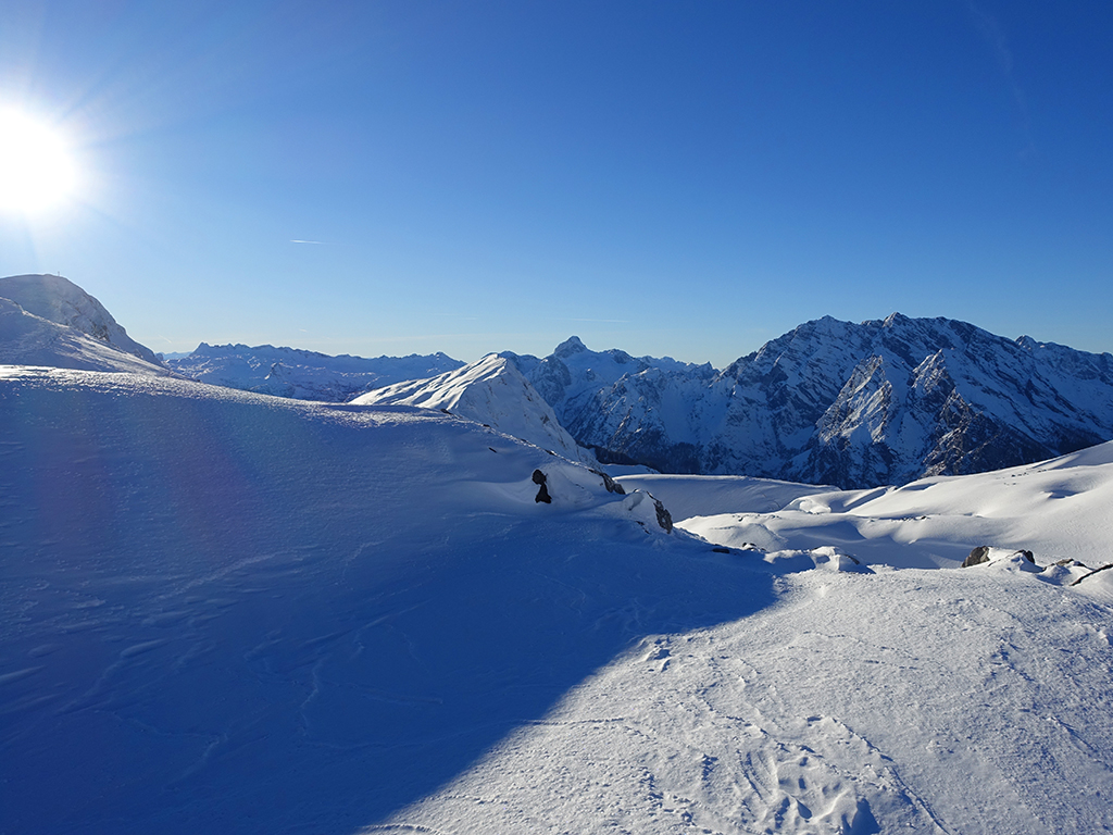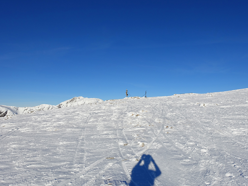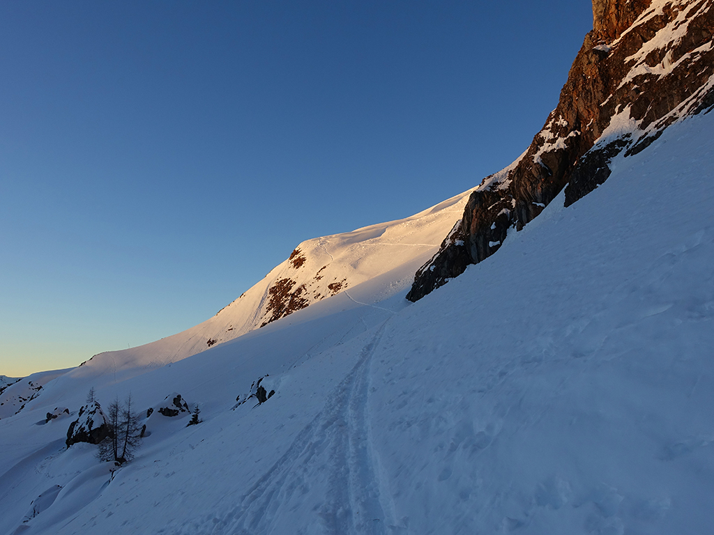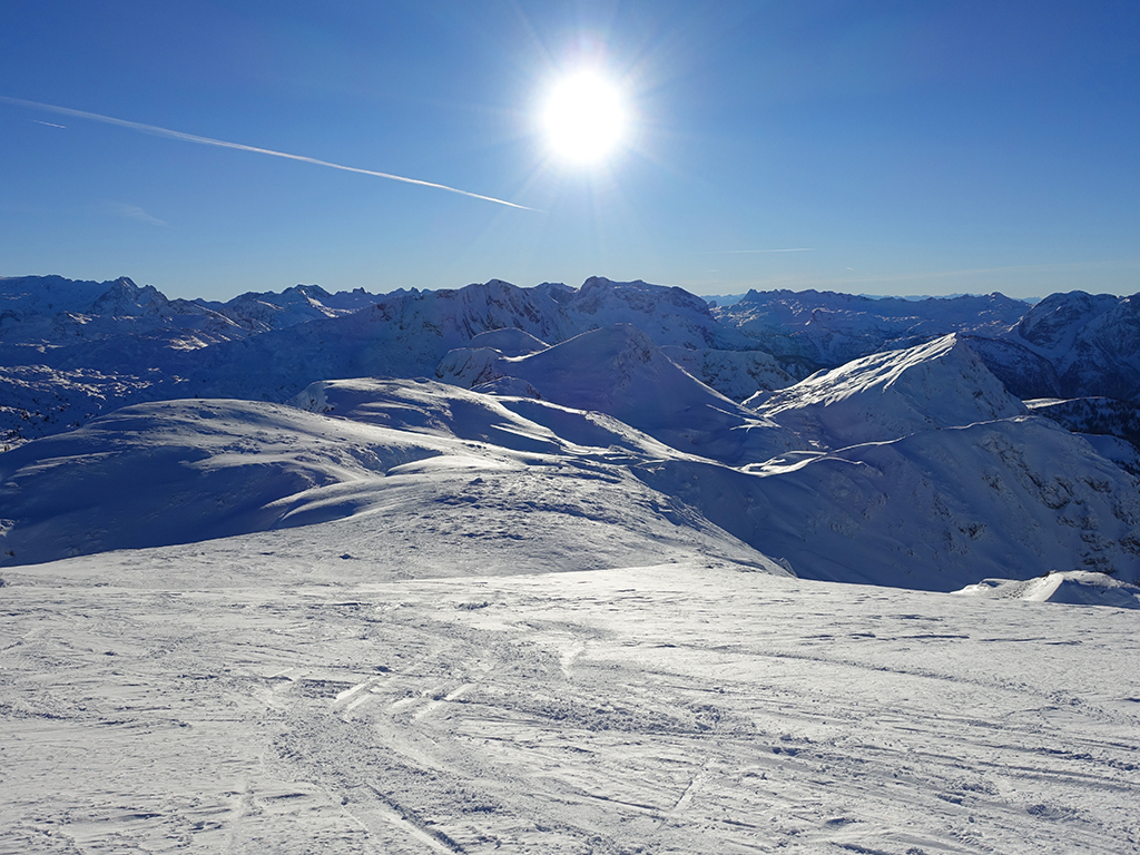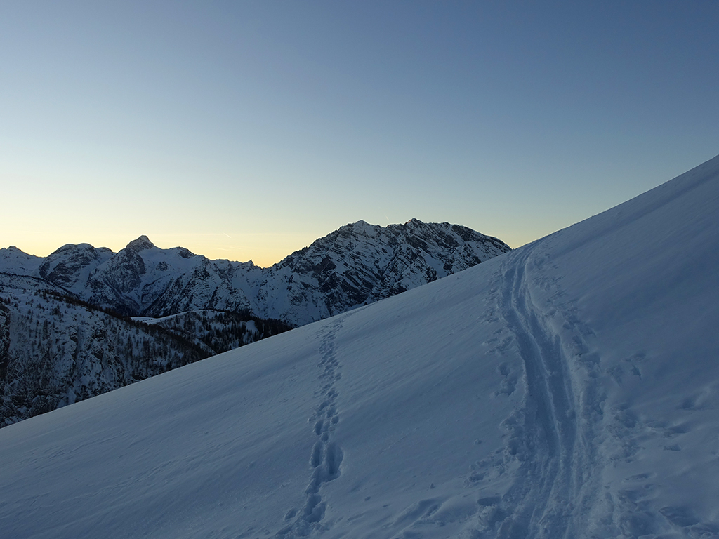 Es ist schon füher Nachmittag als ich vom Parkplatz Hinterbrand in Richtung Stahlhaus starte. An dem Stahlhaus ist die Schneedecke etwas dünn, aber immer noch ausreichend für eine gute Aufstiegsspur. Ob’s für die Abfahrt reicht, wird sich später zeigen. Als ich die beiden Gipfelkreuze am Schneibstein erreiche, ist es deutlich nach 15:00 Uhr, aber was soll’s, die kleine Reibn wird sich bis zum Sonnenuntergang schon ausgehen. Westlich vom Windschartenkopf zieht eine Spur zum Fagstein hinauf, die Sonne steht schon tief, aber diese paar zusätzlichen Höhenmeter sind noch drinnen. Am Fagstein habe ich einen einmaligen Ausblick auf den Kahlersberg, den Watzmann, die im Schein der untergehenden Sonne zusätzlich beeindrucken. Nun wird es aber Zeit für den Rückweg! Die Abfahrt zur Seeleinalm ist ein wahrer Genuß, der erneute Aufstieg zu den Hohen Roßfeldern aber schon etwas mühsam. Nach Sonnenuntergang komme ich bei der Priesbergalm an, bevor es auf der Forstrasse zur Königsbachalm hinübergeht. Bis zur Mittelstation der Jennerbahn und dem Parkplatz brauche ich dann vorerst wieder meine Felle und auch die Stirnlampe.
