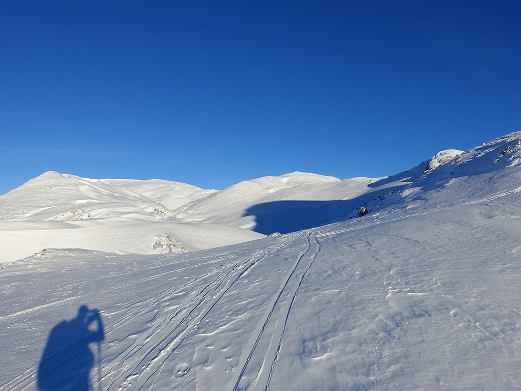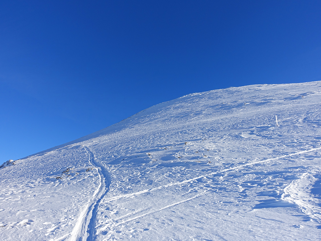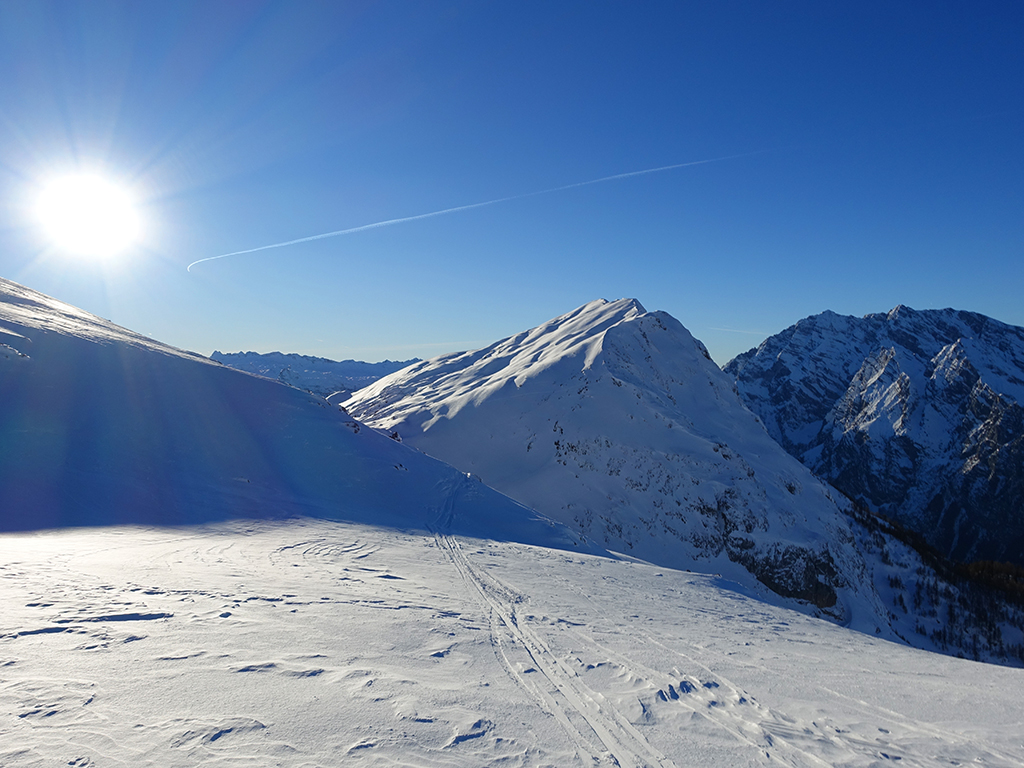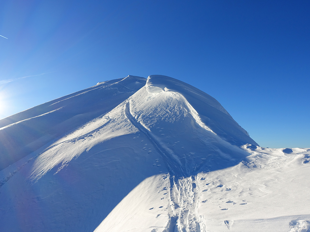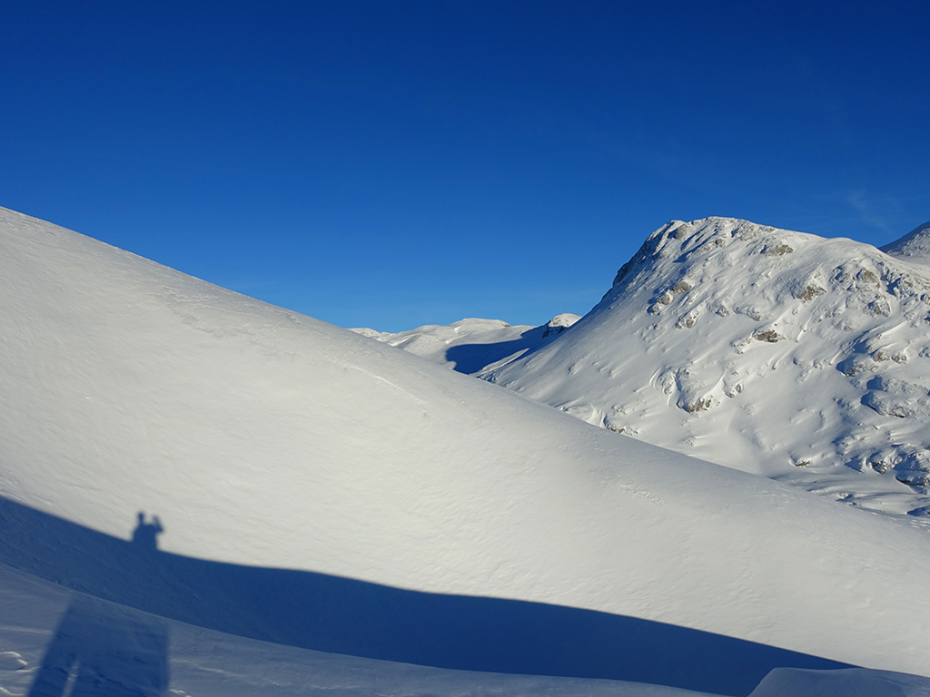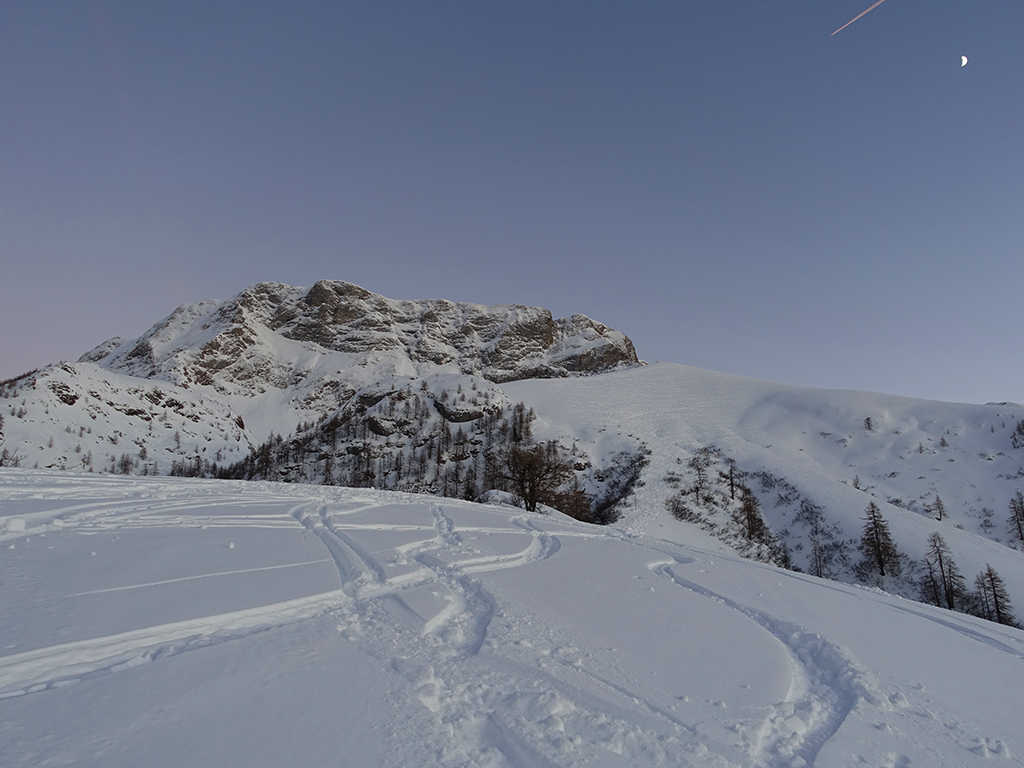 Es ist schon füher Nachmittag als ich vom Parkplatz Hinterbrand in Richtung Stahlhaus starte. An dem Stahlhaus ist die Schneedecke etwas dünn, aber immer noch ausreichend für eine gute Aufstiegsspur. Ob’s für die Abfahrt reicht, wird sich später zeigen. Als ich die beiden Gipfelkreuze am Schneibstein erreiche, ist es deutlich nach 15:00 Uhr, aber was soll’s, die kleine Reibn wird sich bis zum Sonnenuntergang schon ausgehen. Westlich vom Windschartenkopf zieht eine Spur zum Fagstein hinauf, die Sonne steht schon tief, aber diese paar zusätzlichen Höhenmeter sind noch drinnen. Am Fagstein habe ich einen einmaligen Ausblick auf den Kahlersberg, den Watzmann, die im Schein der untergehenden Sonne zusätzlich beeindrucken. Nun wird es aber Zeit für den Rückweg! Die Abfahrt zur Seeleinalm ist ein wahrer Genuß, der erneute Aufstieg zu den Hohen Roßfeldern aber schon etwas mühsam. Nach Sonnenuntergang komme ich bei der Priesbergalm an, bevor es auf der Forstrasse zur Königsbachalm hinübergeht. Bis zur Mittelstation der Jennerbahn und dem Parkplatz brauche ich dann vorerst wieder meine Felle und auch die Stirnlampe.
